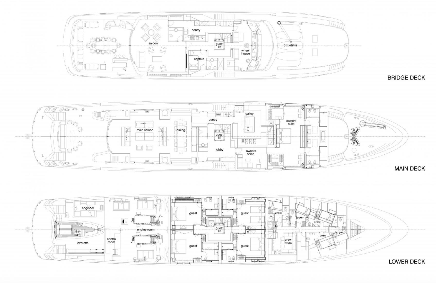 Просторные внешние палубы предлагают множество возможностей для отдыха и развлечений. Особого внимания заслуживает многофункциональная сандек-палуба с фитнес- и велнес-зоной в носовой части, а также джакузи и лежаками для загара в корме. На корме верхней палубы расположена большая зона для обедов на открытом воздухе и приема гостей, а дополнительная зона отдыха находится на корме главной палубы.