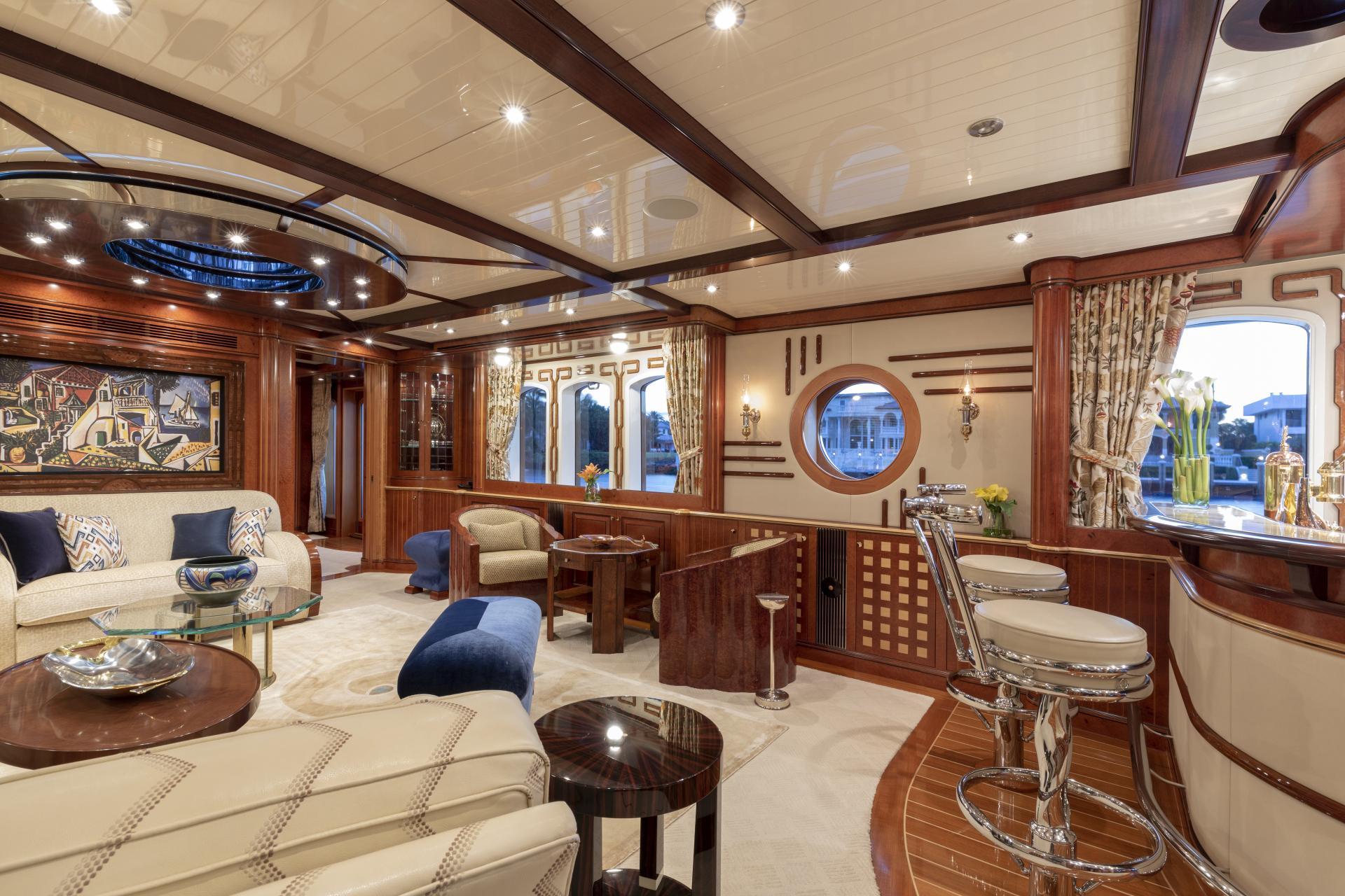 Главный салон оформлен уютной группой мягкой мебели, идеально подходящей для общения и отдыха. Дополняет это пространство изогнутый бар с кожаной обивкой и изготовленными на заказ барными стульями из нержавеющей стали. В центре салона расположен кофейный столик под эффектным круглым световым люком, наполняющим помещение естественным светом.