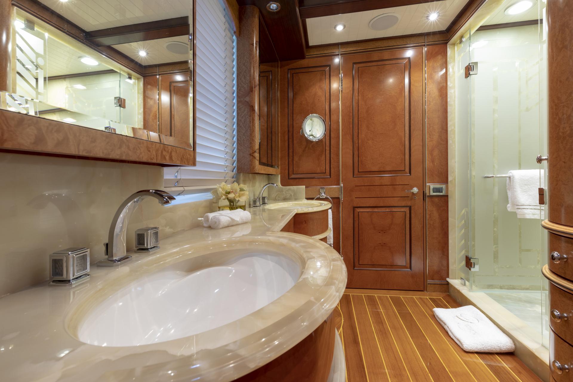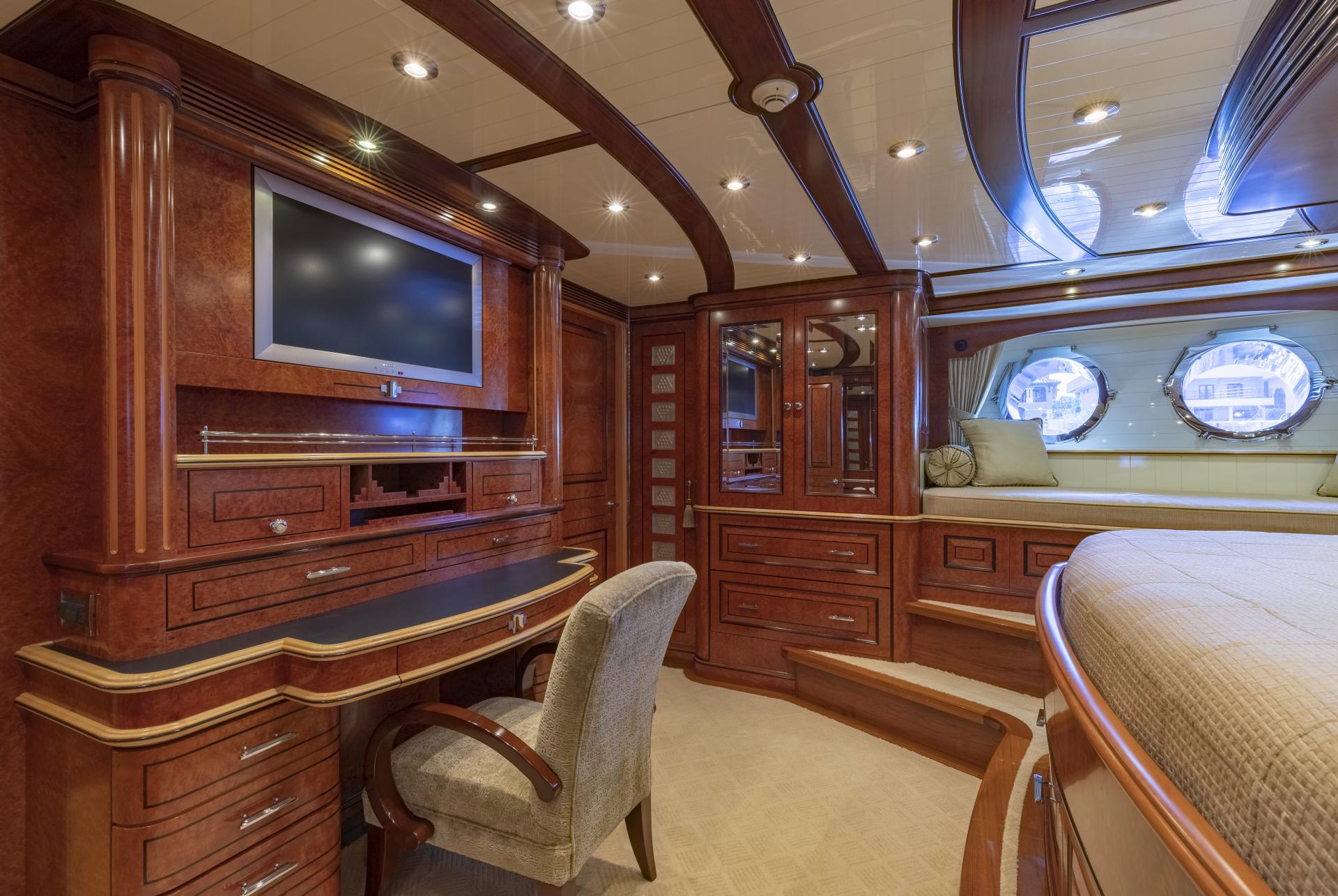 Мастер-каюта владельца на главной палубе просторна и рассчитана на размещение кровати king-size, увенчанной роскошным мягким изголовьем на фоне расширяющей пространство зеркальной стены. Изящным акцентом служит рабочий стол владельца с инкрустированной кожаной столешницей.