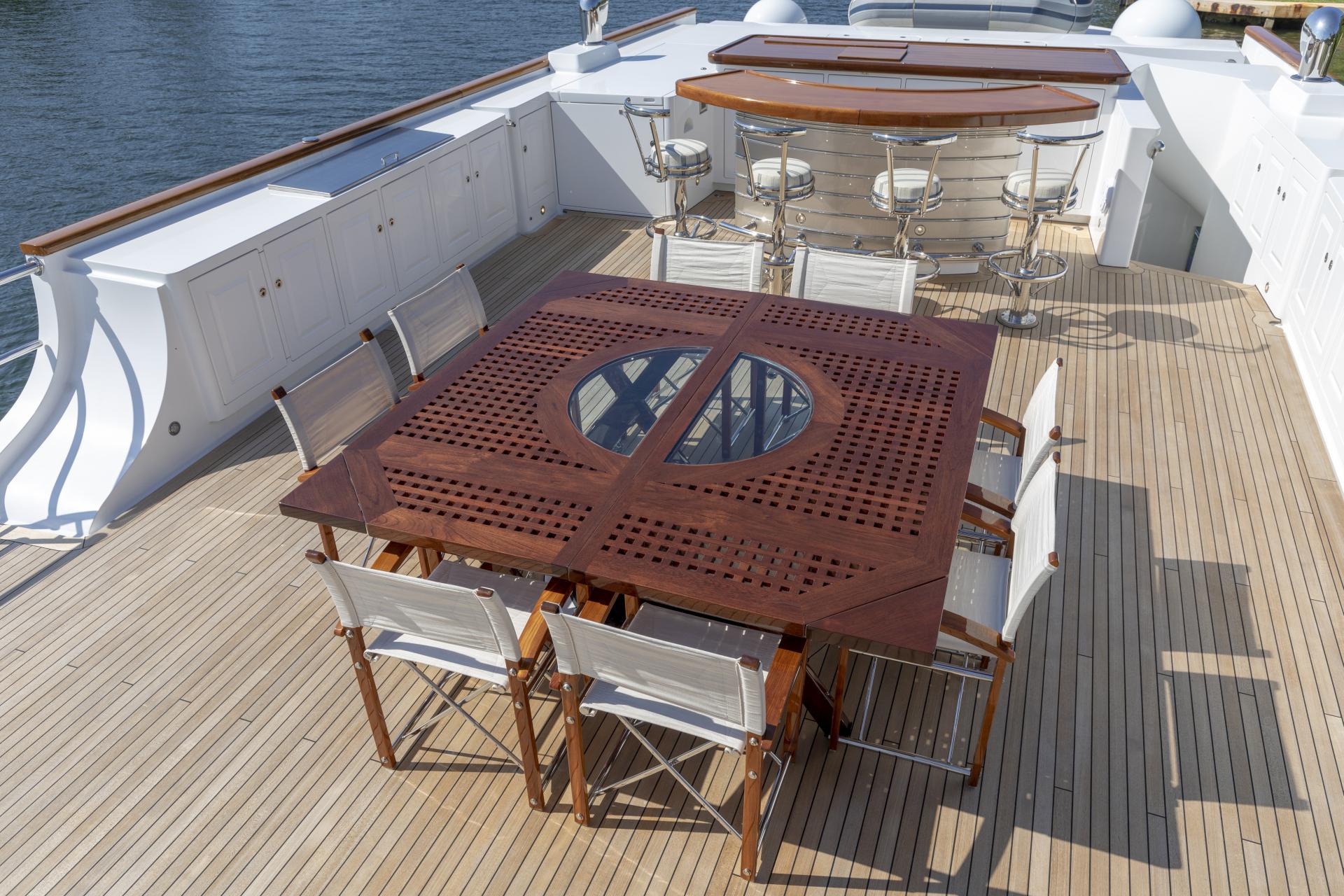 Рядом с салоном находится обеденный салон — полностью отдельное и приватное пространство. Изогнутые стены и двери украшены элегантными стеклянными панелями Lalique, повторяющими форму обеденного стола. Основной акцент сделан на французские двери во всю высоту, ведущие на открытую террасу, где часть фальшборта опускается, образуя веранду с панорамным видом на воду.