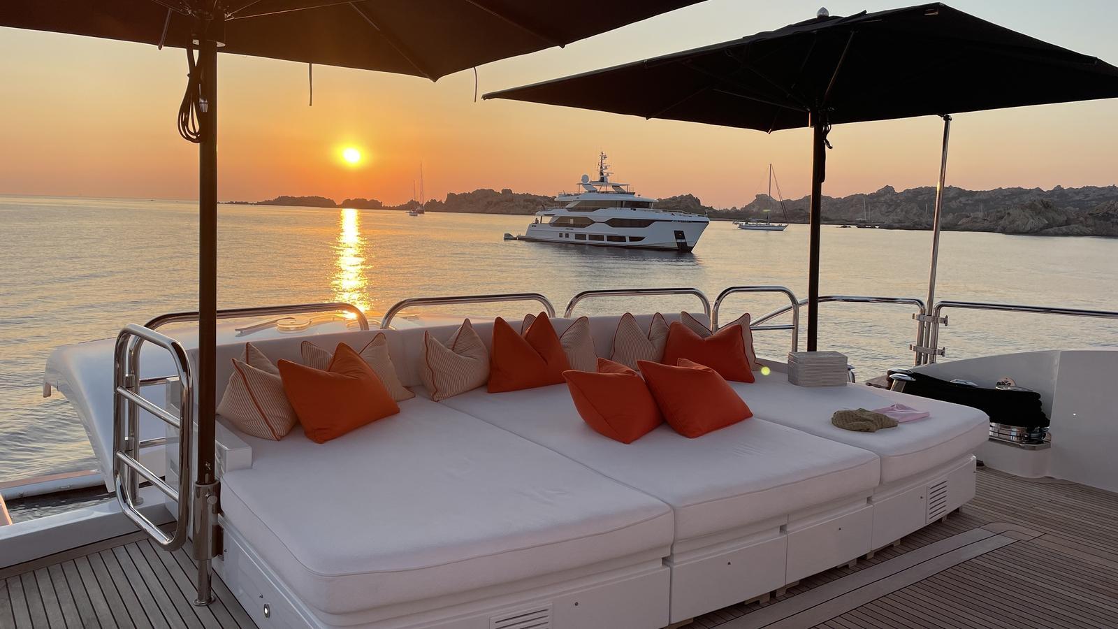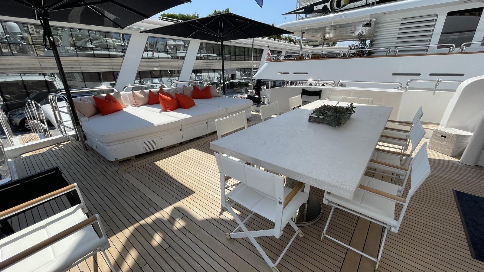 Поднимаясь на яхту через впечатляющую кормовую палубу, сразу понимаешь масштаб судна. Раздвижные двери кормовой палубы ведут в огромный салон, залитый естественным дневным светом.