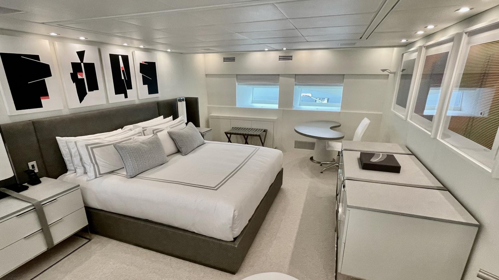 Просторная каюта владельца во всю ширину корпуса (full-beam) имеет гардеробную, кровать king size (2 м x 2 м) и большую ванную комнату (ensuite).