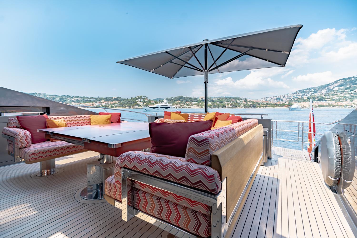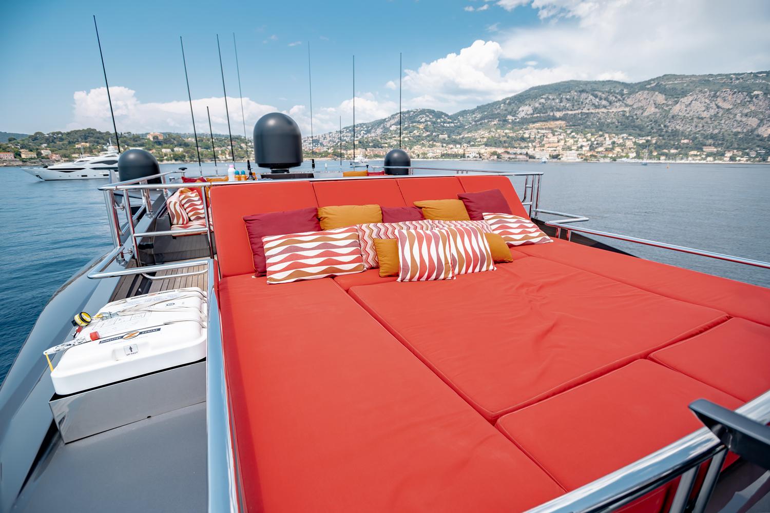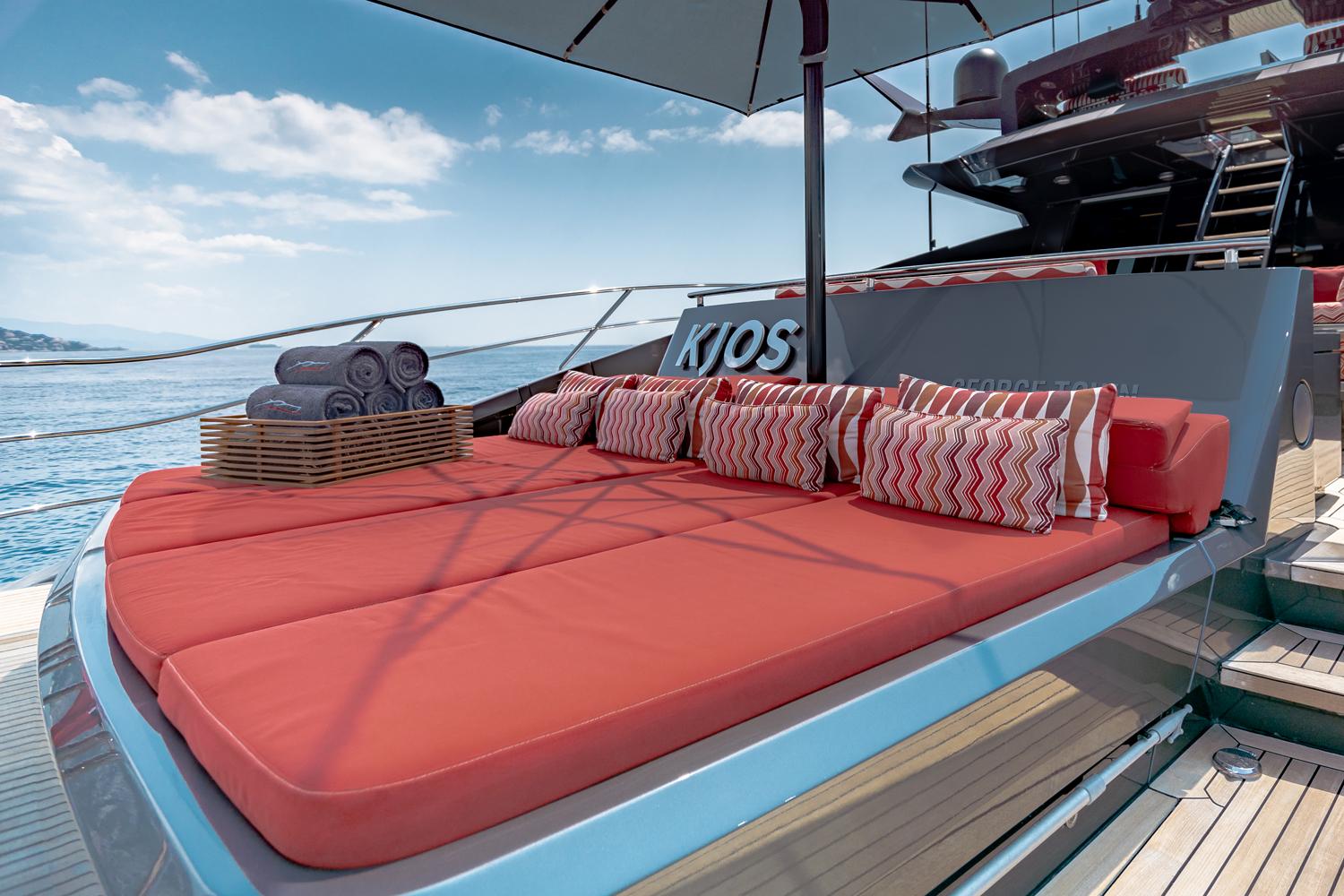 Внешние пространства KJOS отлично подходят для отдыха и общения. Кормовая палуба особенно удобна для приёма гостей: очень просторная и комфортная, с зонами для трапезы и лаунжа, а также большой купальной платформой, позволяющей «быть ближе к воде». Наверху флайбридж предлагает панорамные виды, три встроенные зоны для сидения, большую лежанку для загара и кофейный столик. В шкафах скрыты холодильник и льдогенератор.