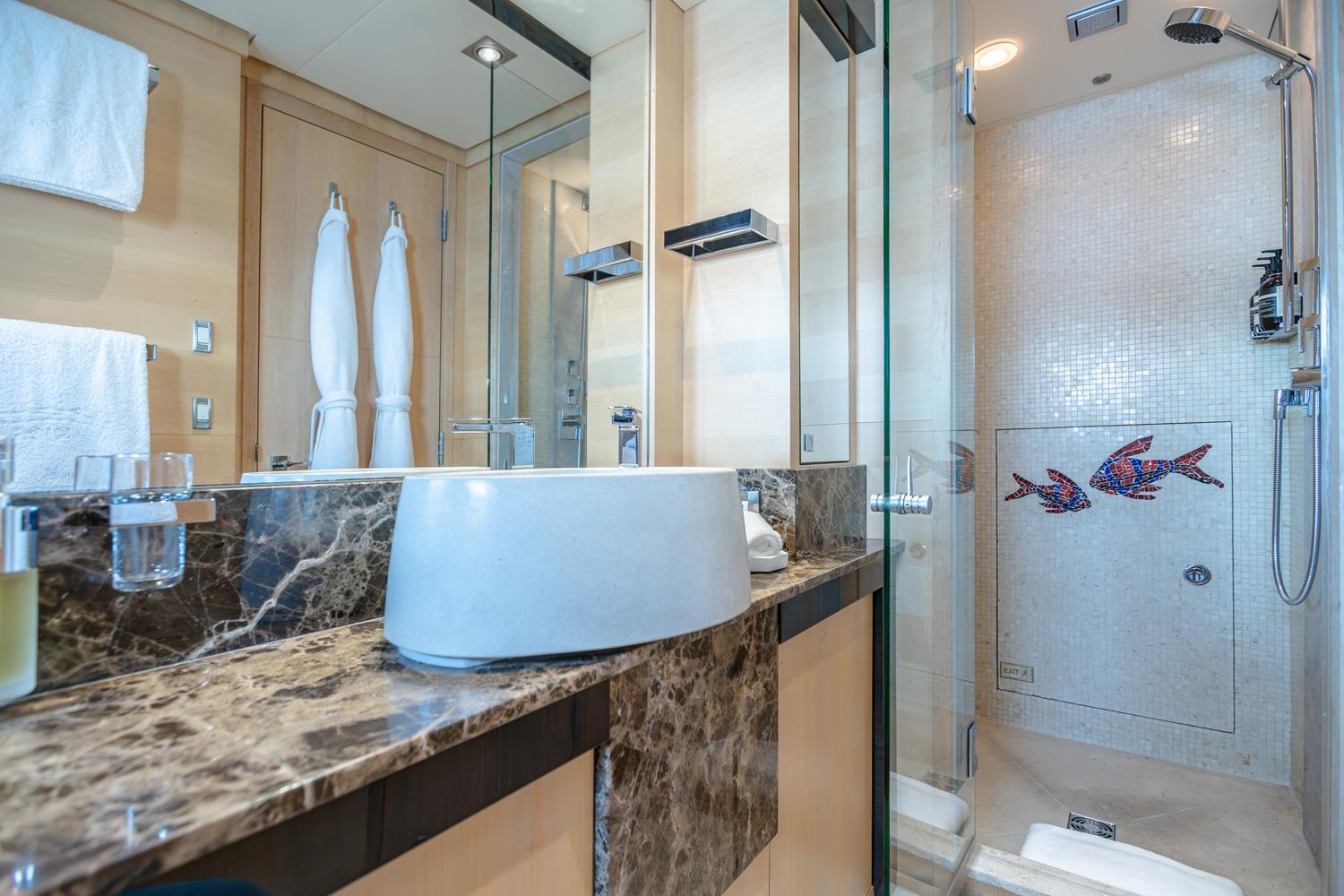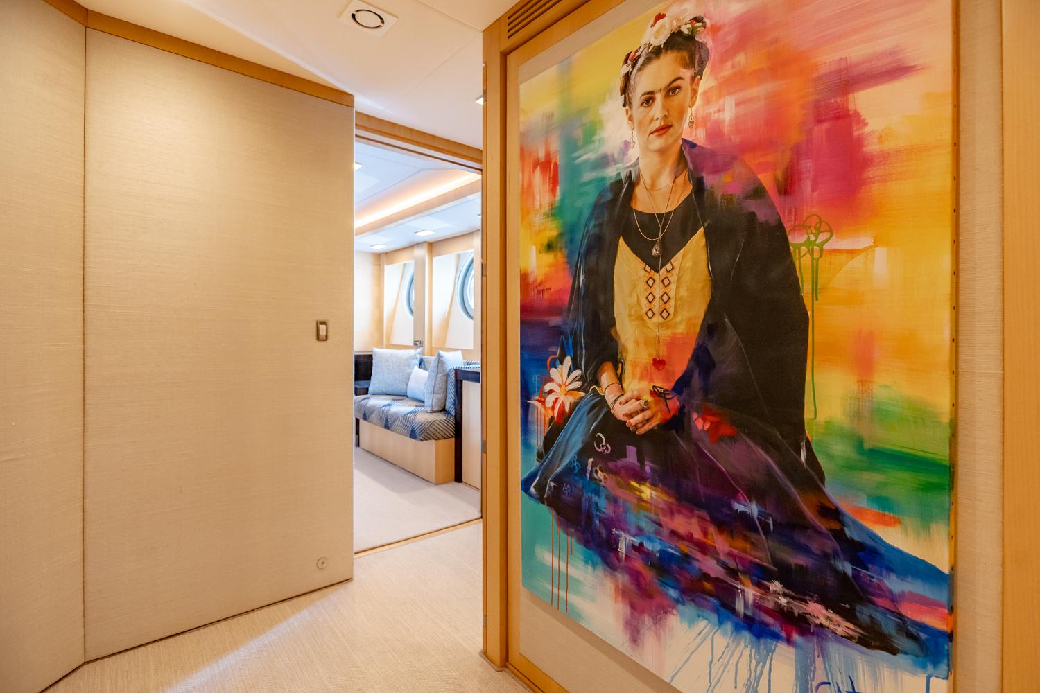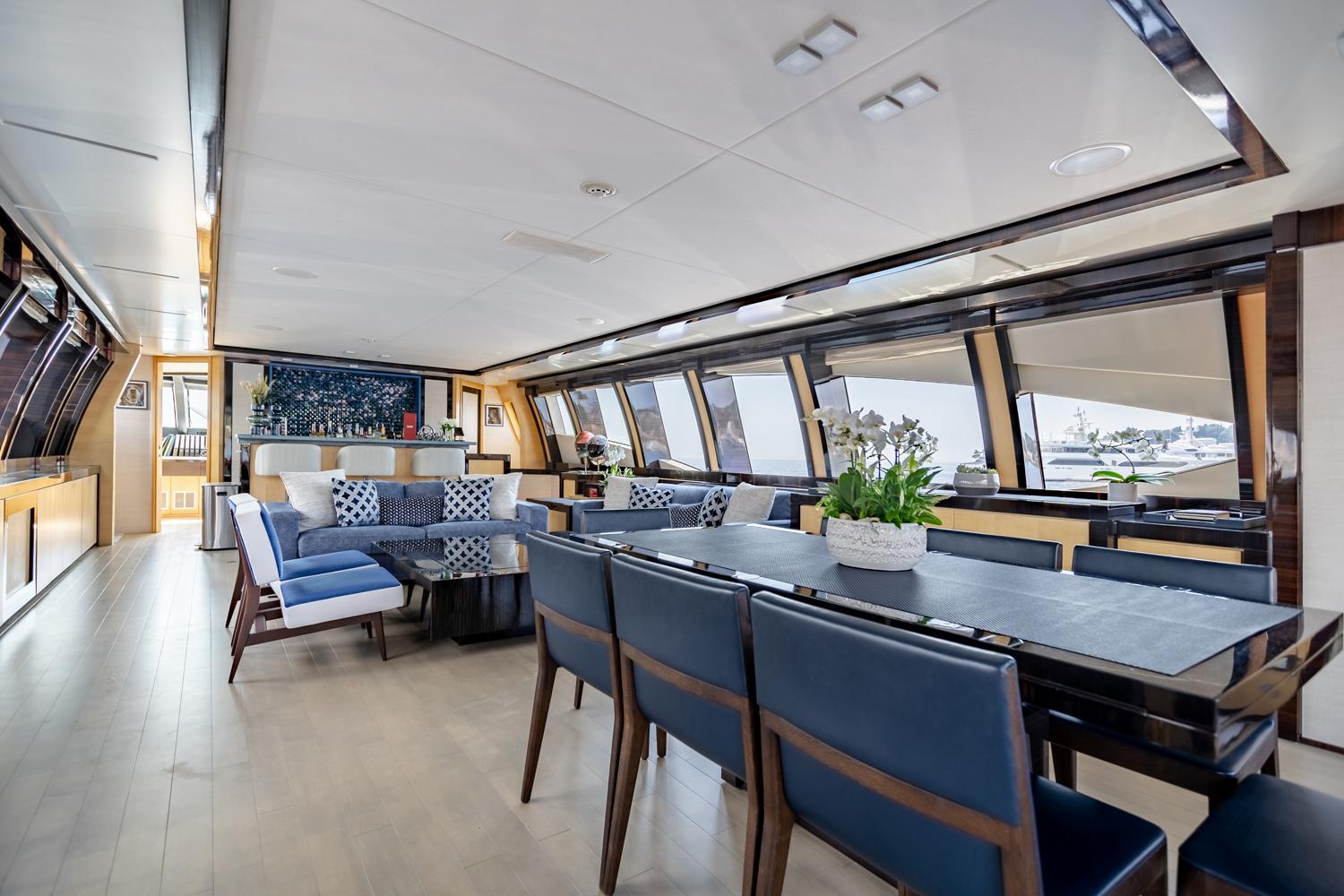 Созданная с максимальным вниманием к деталям, KJOS имеет дизайн интерьера и экстерьера от Nuvolari & Lenard — известных и уважаемых итальянских дизайнеров. Раздвижные двери с рамами из нержавеющей стали и тонированным стеклом обеспечивают элегантный вход в главный салон. Атмосфера здесь утончённая, роскошная и комфортная: мягкая мебель располагает к общению, а в индивидуально изготовленном «витринном» шкафу скрыт плоский телевизор. В носовой части расположен обеденный стол на заказ: дерево с вставками из тонкой кожи, стекла и мрамора, рассчитан на восемь персон. Здесь же — полноценный бар с мойкой, встраиваемым льдогенератором и холодильником. Камбуз оснащён индивидуальной мебелью с мраморными столешницами и полностью укомплектован.