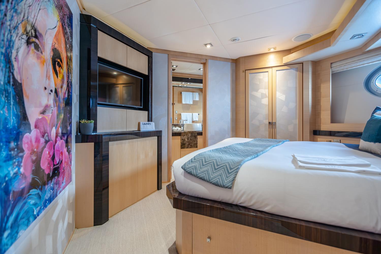 KJOS комфортно размещает до восьми гостей в четырёх каютах. Мастер-каюта владельца, оформленная с использованием высококачественных тканей и отделки, просторная и светлая, с большим количеством мест для хранения. В каюте установлена кровать king-size, прикроватные тумбы, письменный стол с туалетным столиком и откидным зеркалом. Развлекательный шкаф с телевизором и мультимедийным оборудованием выполнен из того же высокоглянцевого дерева с поперечной текстурой, что и кровать и стол, создавая единый стиль. Встроенный диван и гардеробная дополняют оснащение, а ванная комната «his & hers» отделана мрамором, стеклом и нержавеющей сталью. Три гостевые каюты также оснащены полноценными мультимедийными системами, достаточным количеством мест для хранения и собственными ванными комнатами. Яхта также вмещает до пяти членов экипажа, включая каюту капитана с отдельной ванной.