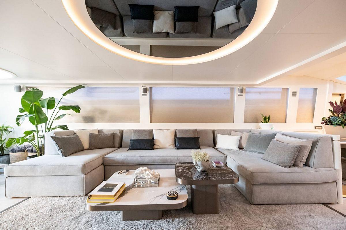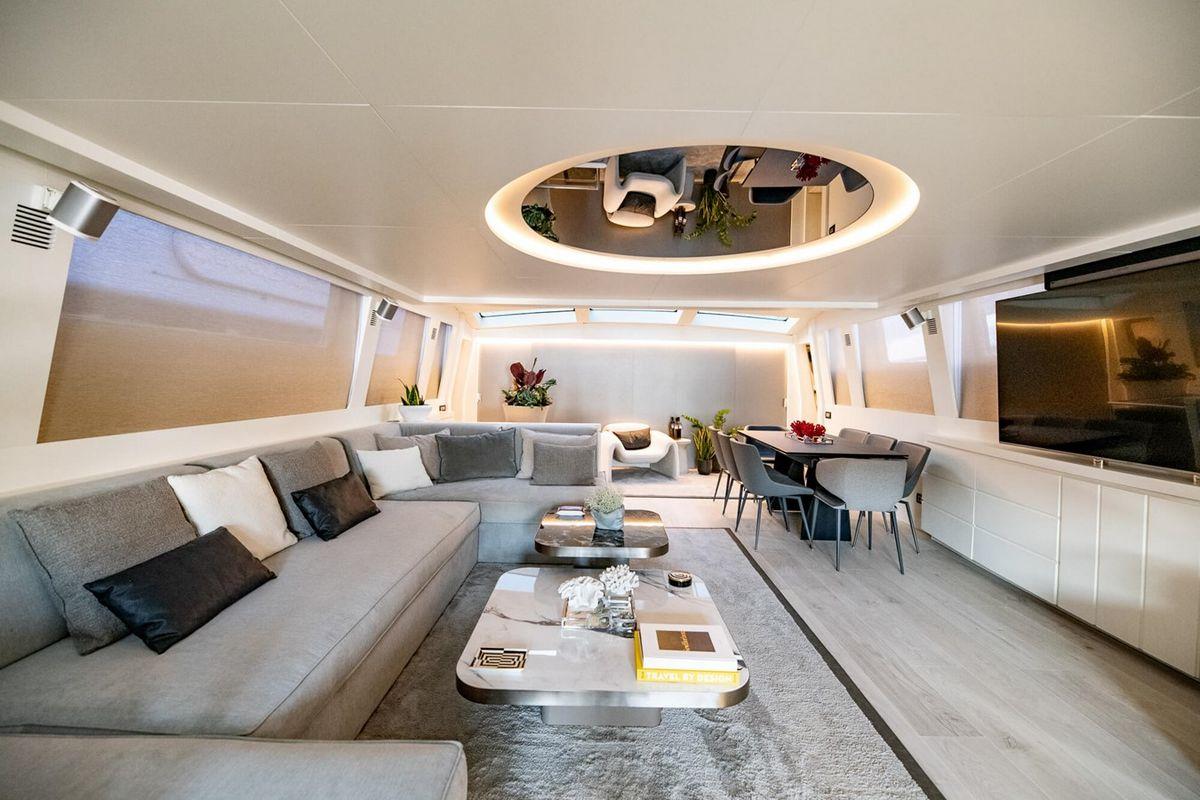 Интерьер Eva выглядит светлым и современным. Главный салон был обновлён новым напольным покрытием и дополнен индивидуально изготовленным баром с льдогенератором и холодильником. Обеденная зона и салон были переоформлены с использованием высококачественной мебели и улучшенного естественного освещения, создавая комфортное и функциональное пространство.