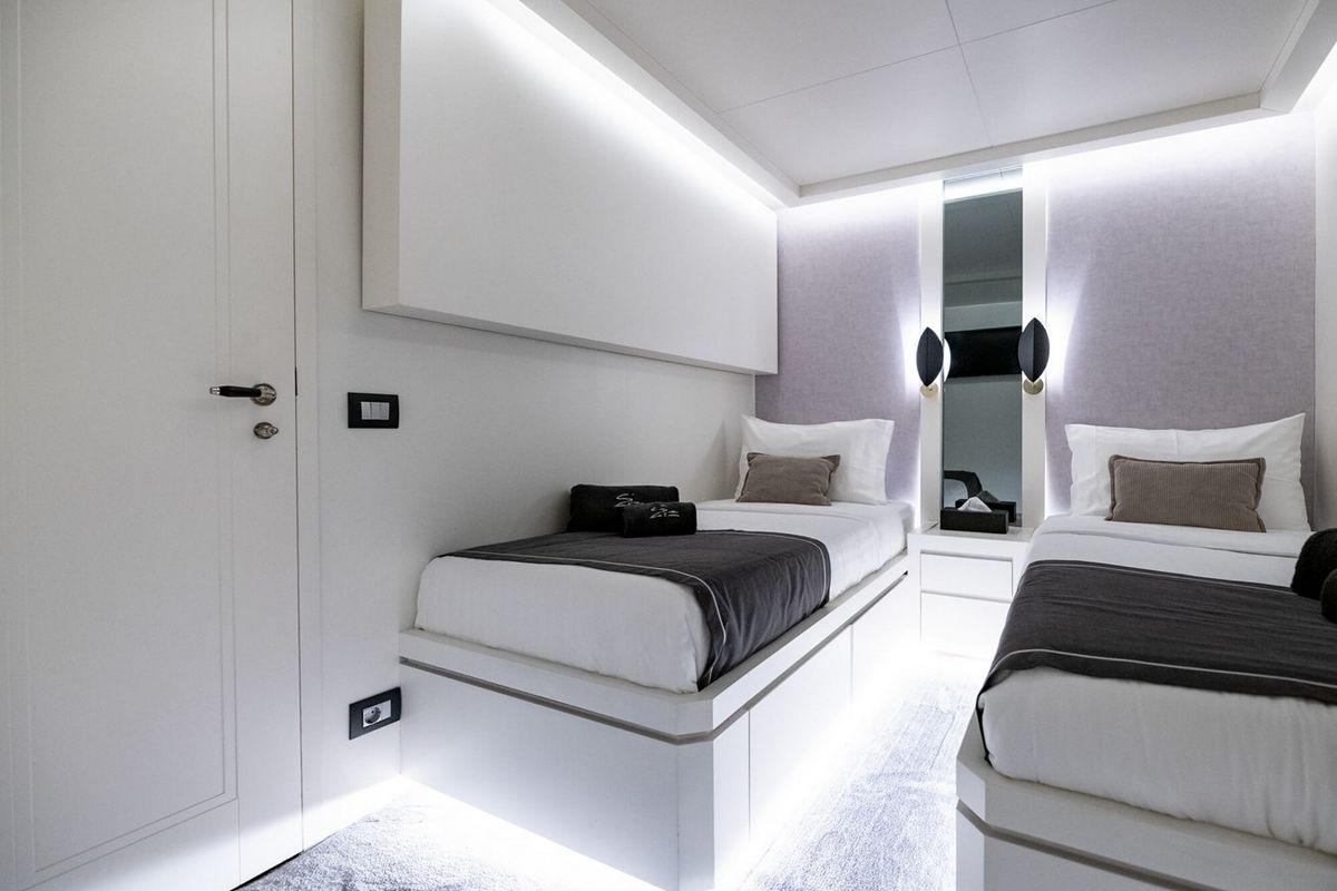 Eva принимает до 12 гостей в 5 каютах, расположенных на нижней палубе: мастер-каюта, две двухместные каюты и две каюты с раздельными кроватями и дополнительными койками Pullman. Все каюты оборудованы собственными ванными комнатами.