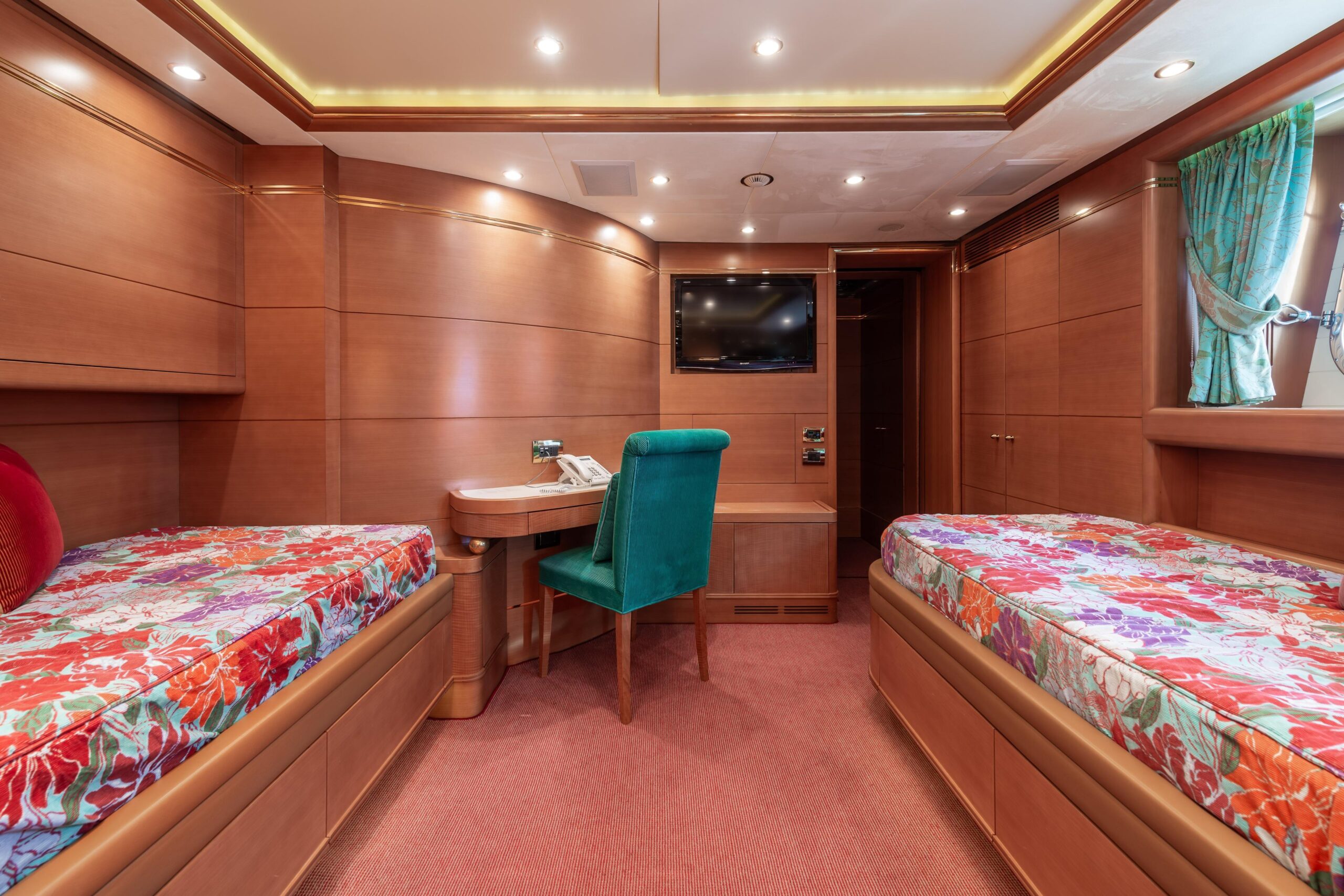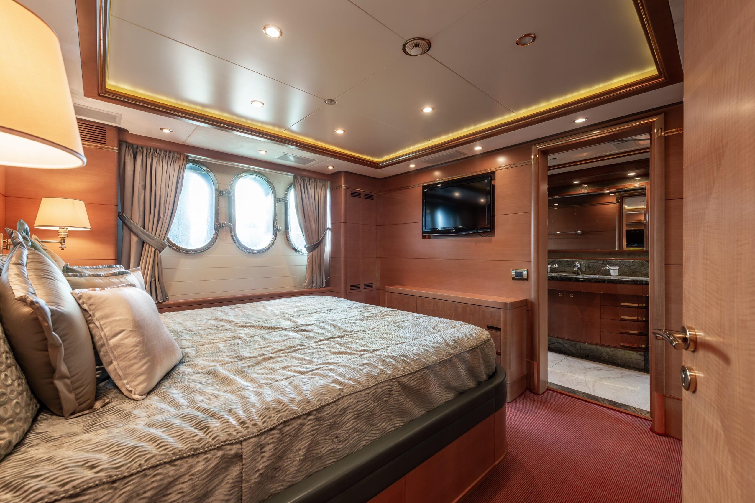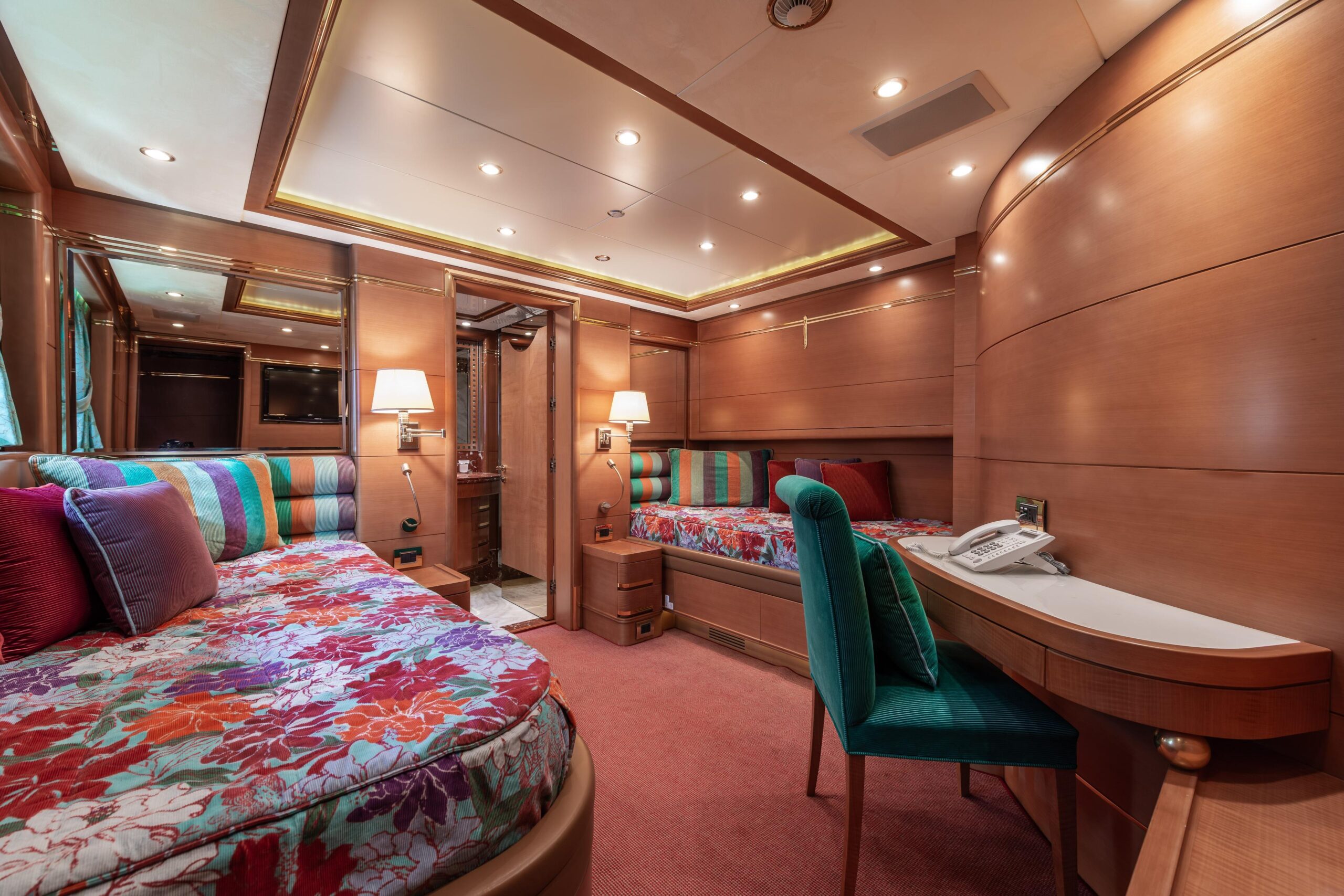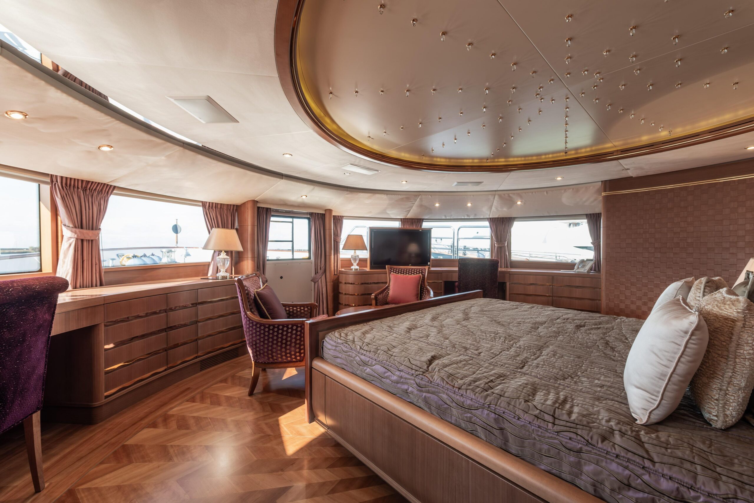 Планировка интерьера отличается исключительной универсальностью и включает лифт, обслуживающий все палубы. Яхта может разместить до 15 гостей в 7 каютах: мастер-каюта расположена в носовой части главной палубы, на нижней палубе — две двухместные каюты и две каюты с раздельными кроватями и откидными спальными местами Pullman. Дополнительно имеется двухместная каюта на бридж-деке и одноместная каюта рядом с мастер-каютой, которую легко переоборудовать в кабинет владельца или другое функциональное пространство.
