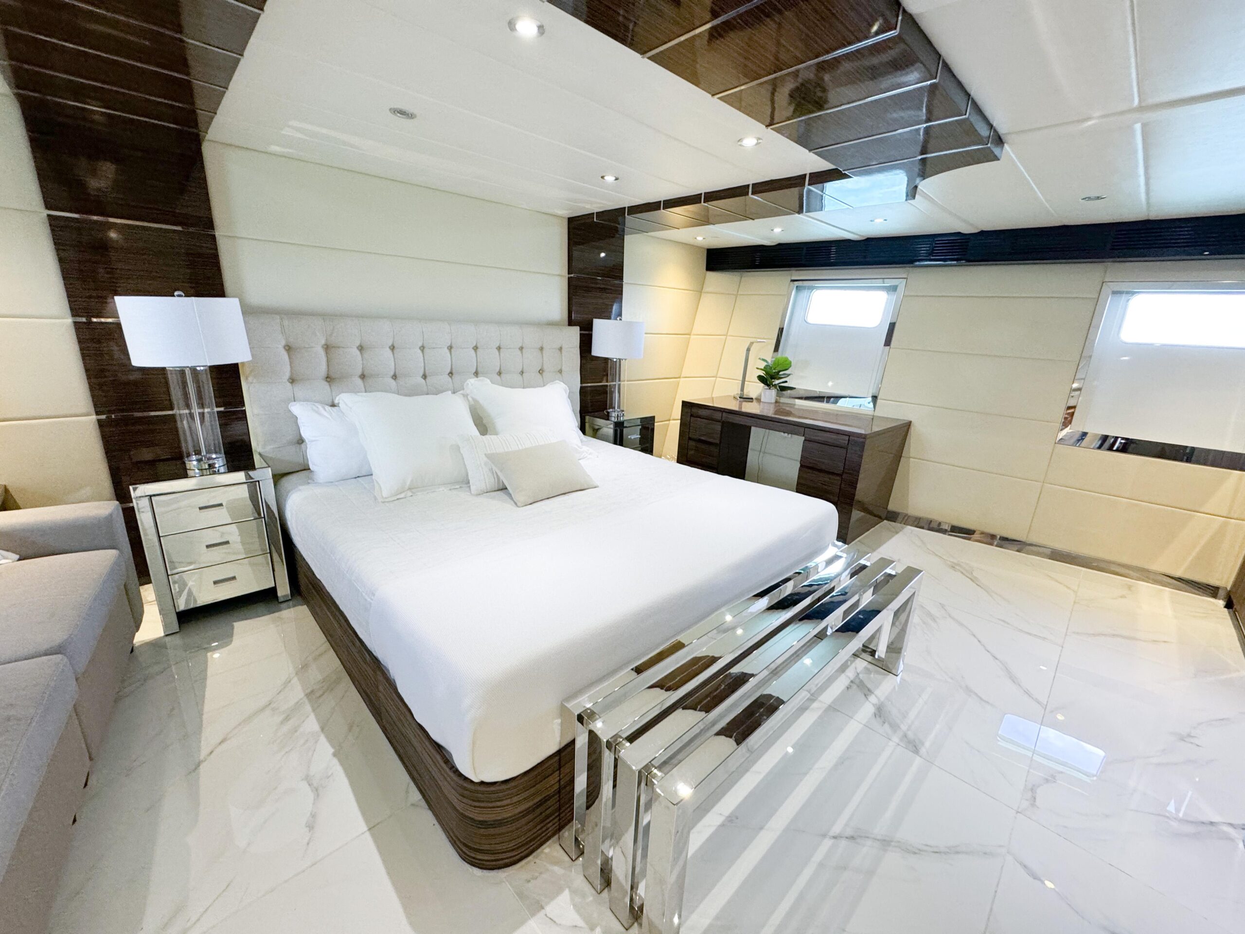 Тщательно спроектированная для элегантности и производительности, яхта оснащена двумя двигателями Caterpillar C32 с небольшим наработанным ресурсом и свежим обслуживанием, обеспечивая уверенные и надёжные переходы.