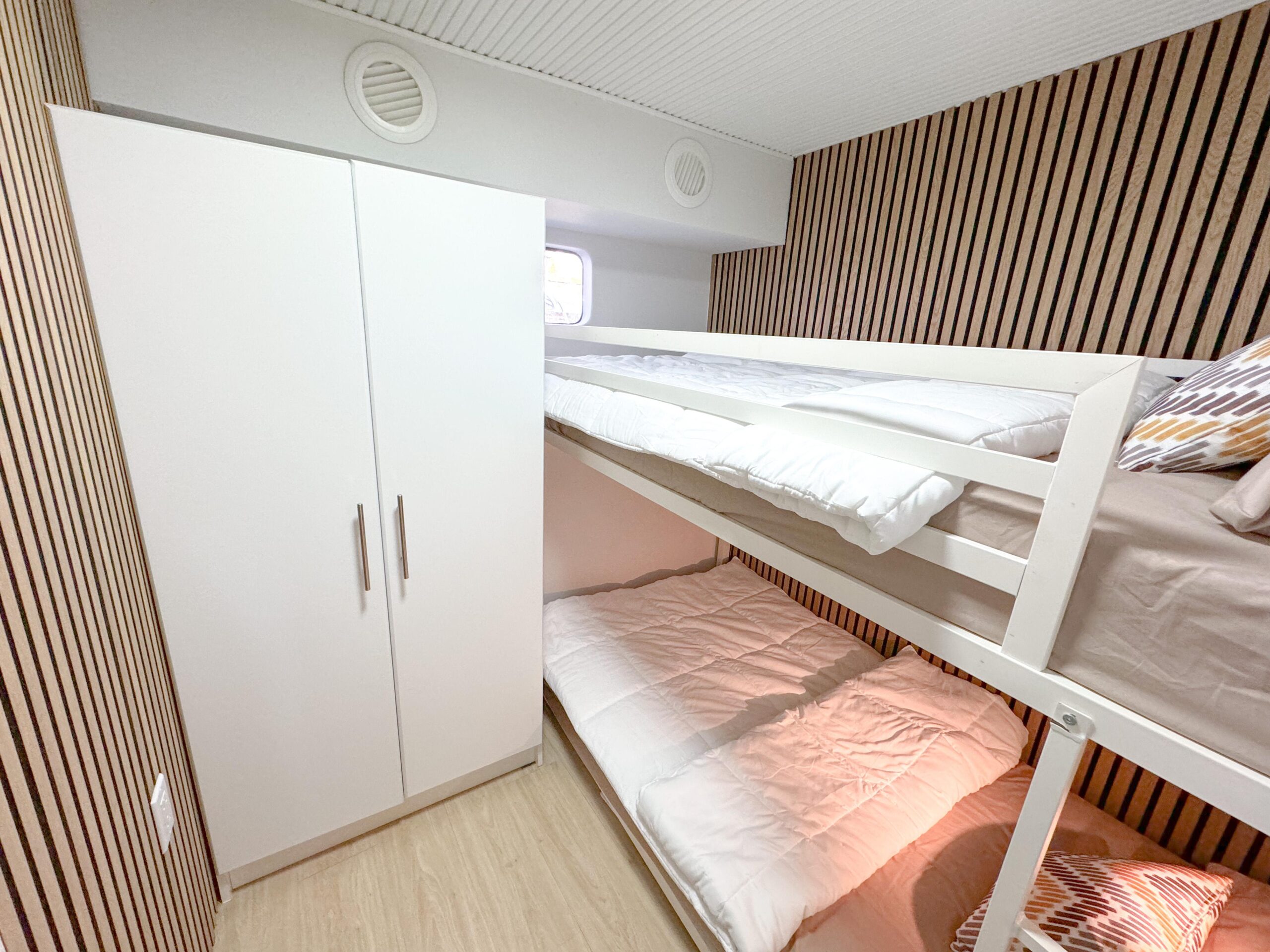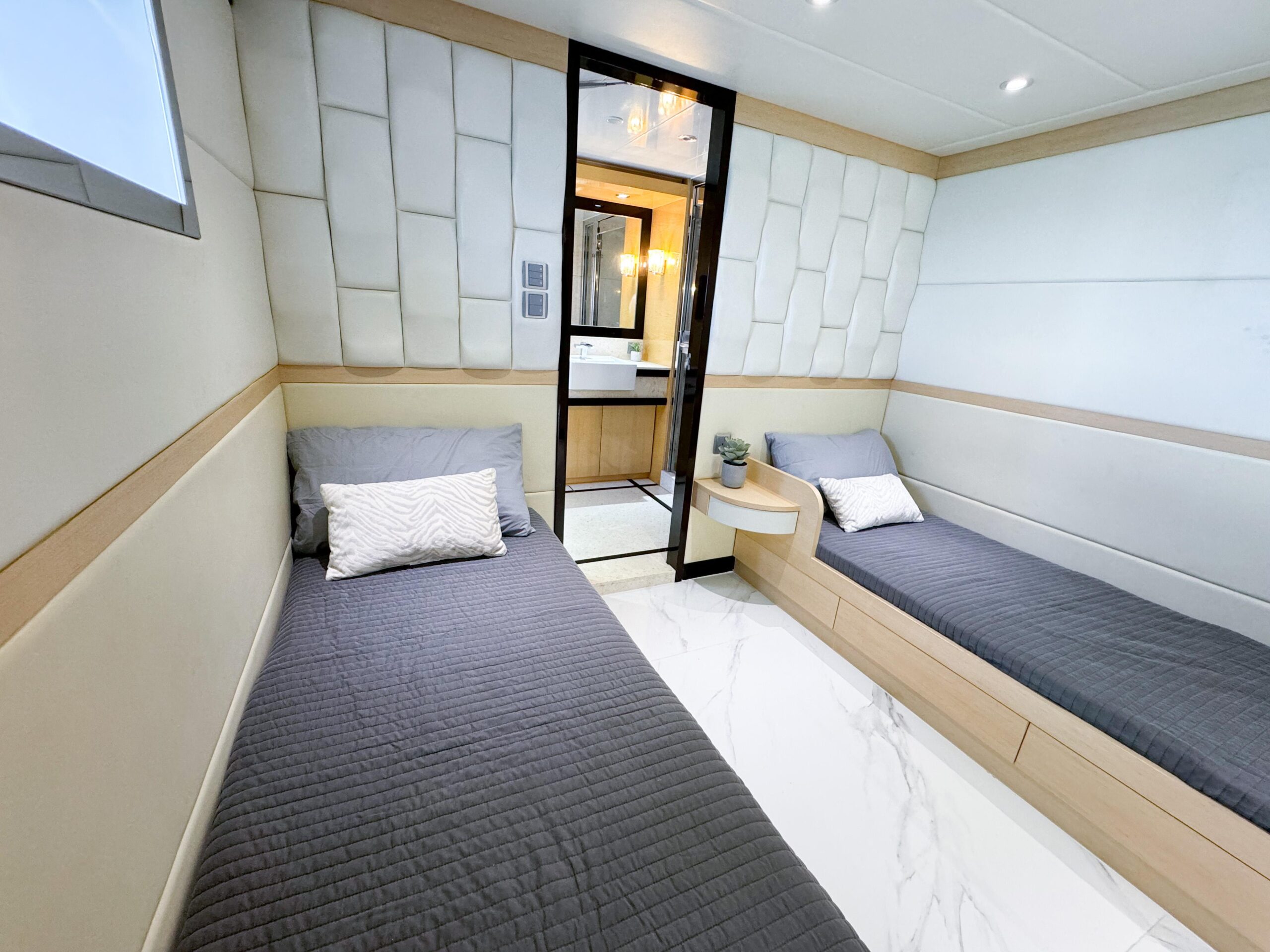 Планировка включает 5 гостевых кают для размещения до 10 гостей и 3 каюты экипажа на 5 человек. На борту предусмотрены как внутренние, так и внешние джакузи, сауна и просторная солнечная палуба, идеально подходящая для отдыха и приёма гостей.