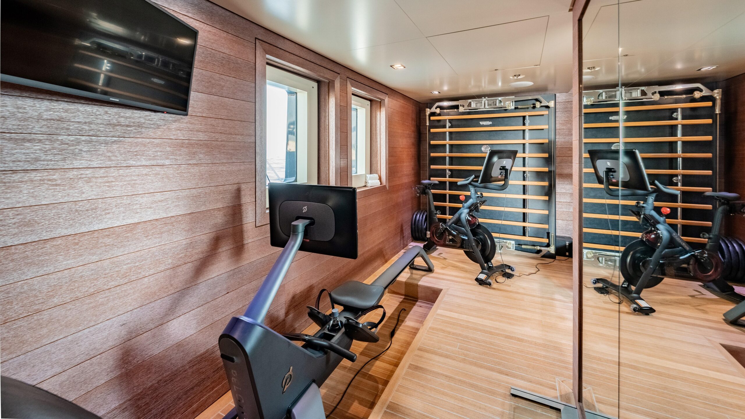 Перед лаунджем/офисом владельца расположен большой тендерный гараж — один из крупнейших среди яхт сопоставимого размера. В гараже размещаются 3 тендера, 3 гидроцикла и множество водных игрушек. Такое решение освобождает палубы, защищает технику от погодных условий и позволяет сохранить просторный бич-клуб там, где обычно располагается кормовой гараж. Кроме того, это облегчает спуск/подъём игрушек при швартовке кормой и даёт гостям быстрый доступ к воде без ожидания, характерного для классической кормовой гаражной компоновки.