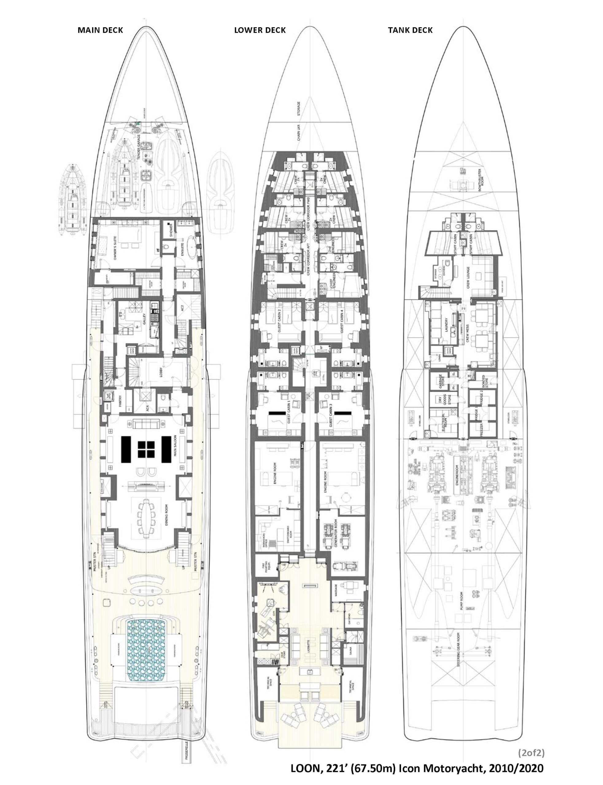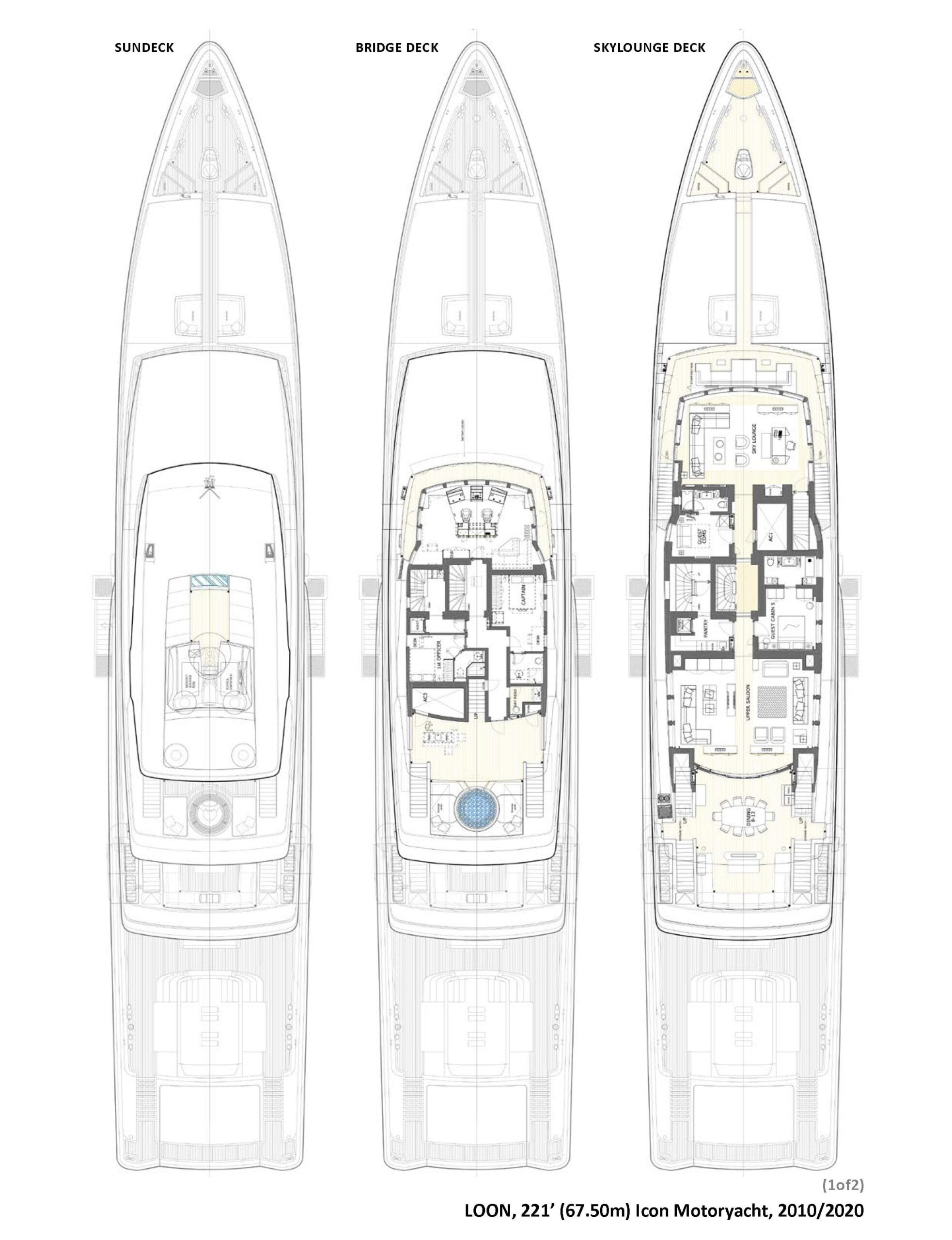 LOON — моторная яхта Icon длиной 221 фут (67,50 м) с 6 палубами и 7 каютами. Её часто называют одной из самых известных и широко представленных на чартерном рынке яхт в мире. Интерьер от Studio Linse выполнен в минималистичном стиле с утончённой элегантностью: мягкая палитра и изящная мебель создают спокойную атмосферу для комфортной жизни на воде. Экстерьер разработан Redman Whiteley Dixon Design с акцентом на выдаемый дизайн и исключительный комфорт на открытых пространствах.