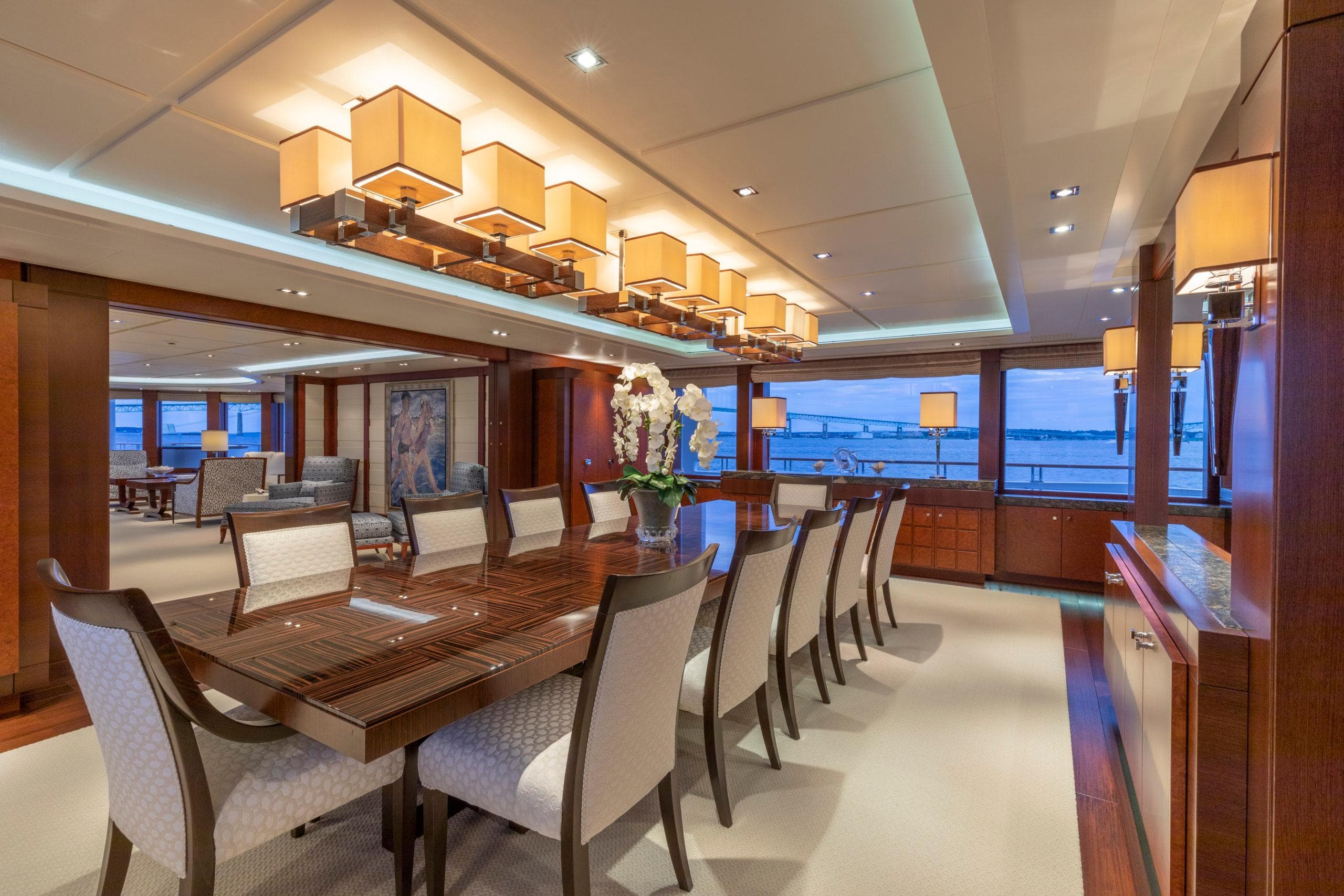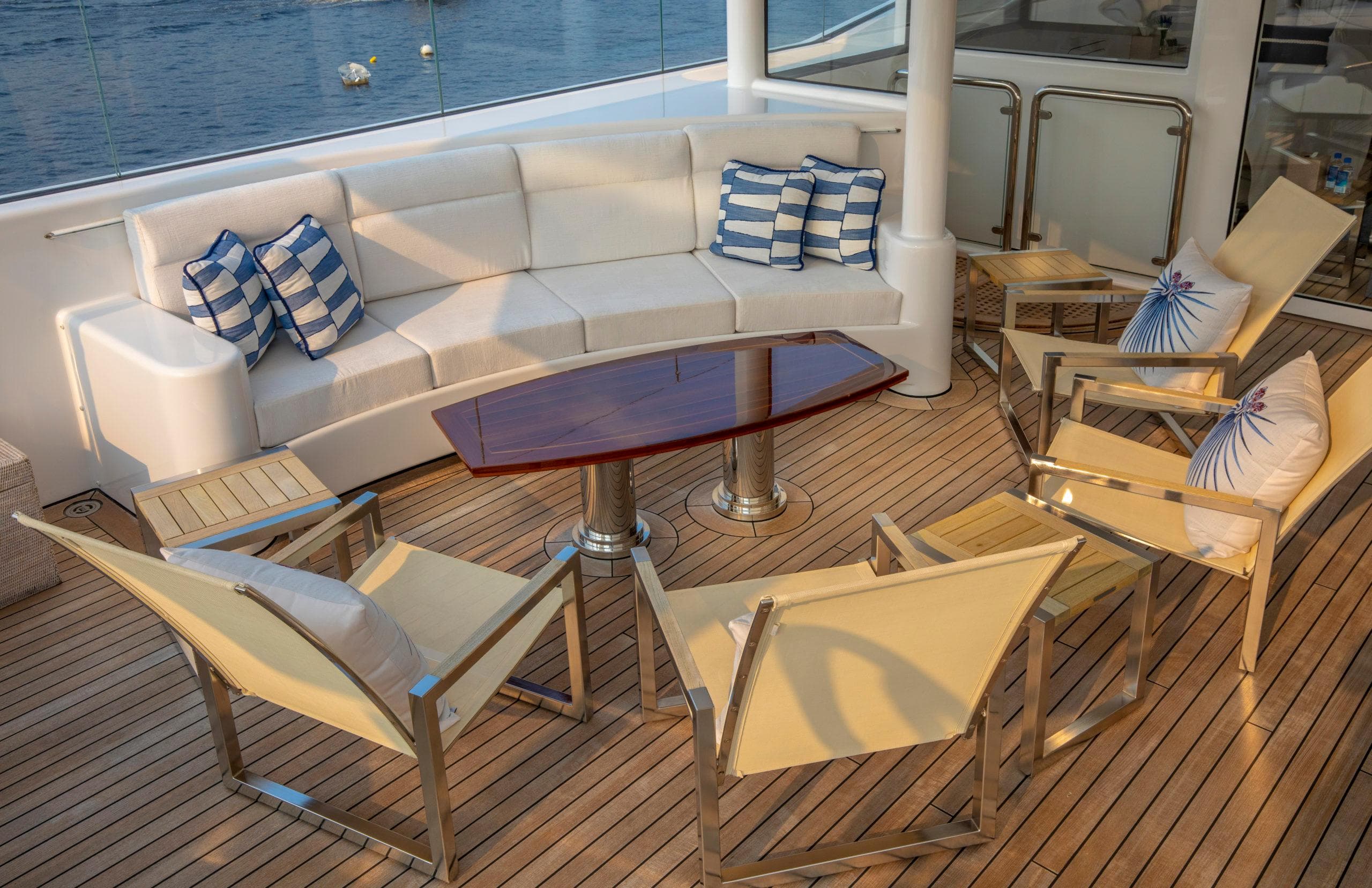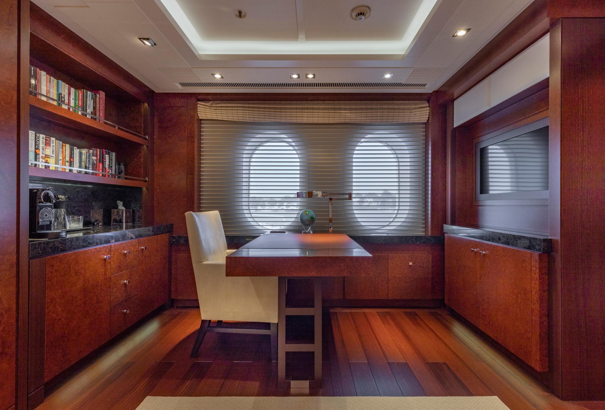ОБЩЕЕ Размещение до 12 гостей в 6 каютах, главный салон залит естественным светом и отличается комфортными текстурами. Современное сочетание древесины ручной работы, контрастных тканей и профессионального освещения делает это пространство великолепным для светских встреч. Освещение, шторы и аудиовизуальные системы управляются с помощью интегрированных пультов на iPad. ВЛАДЕЛЕЦ Люкс владельца на всю ширину, расположенный на главной палубе, наполнен естественным светом от 6 больших овальных окон, подчёркивающих просторную зону отдыха и величественную кровать king-size в раме из чёрного anigre beauty. Телевизор Sony 70" LED HD обеспечивает доступ к фильмам на борту, а тщательно продуманное освещение создаёт насыщенную и экзотическую атмосферу. Ванная комната при каюте владельца включает джакузи с уютным декором из тёмного дерева ручной работы и мраморного пола, обрамляющего две раковины (dual vanities). Ароматерапевтический душ достаточно большой для двоих. ГОСТИ 1 VIP-люкс и 4 гостевые каюты. VIP-люкс расположен на мостиковой палубе и выполнен в современном стиле. 4 гостевые каюты расположены на нижней палубе: две каюты double и 2 каюты twin. Две гостевые каюты double одинаковые, и две гостевые каюты twin одинаковые. ЭКИПАЖ До 15 членов экипажа в 8 каютах