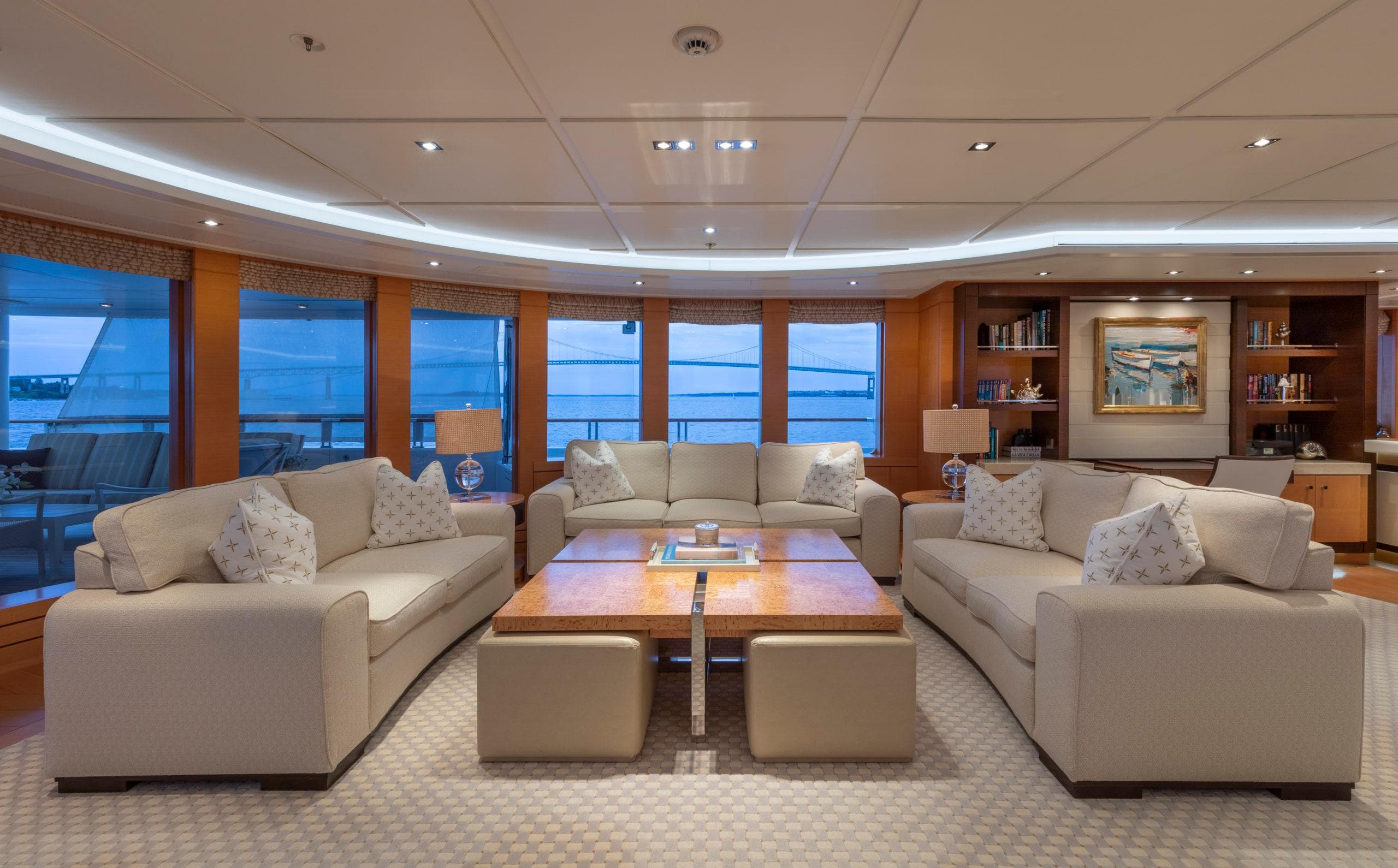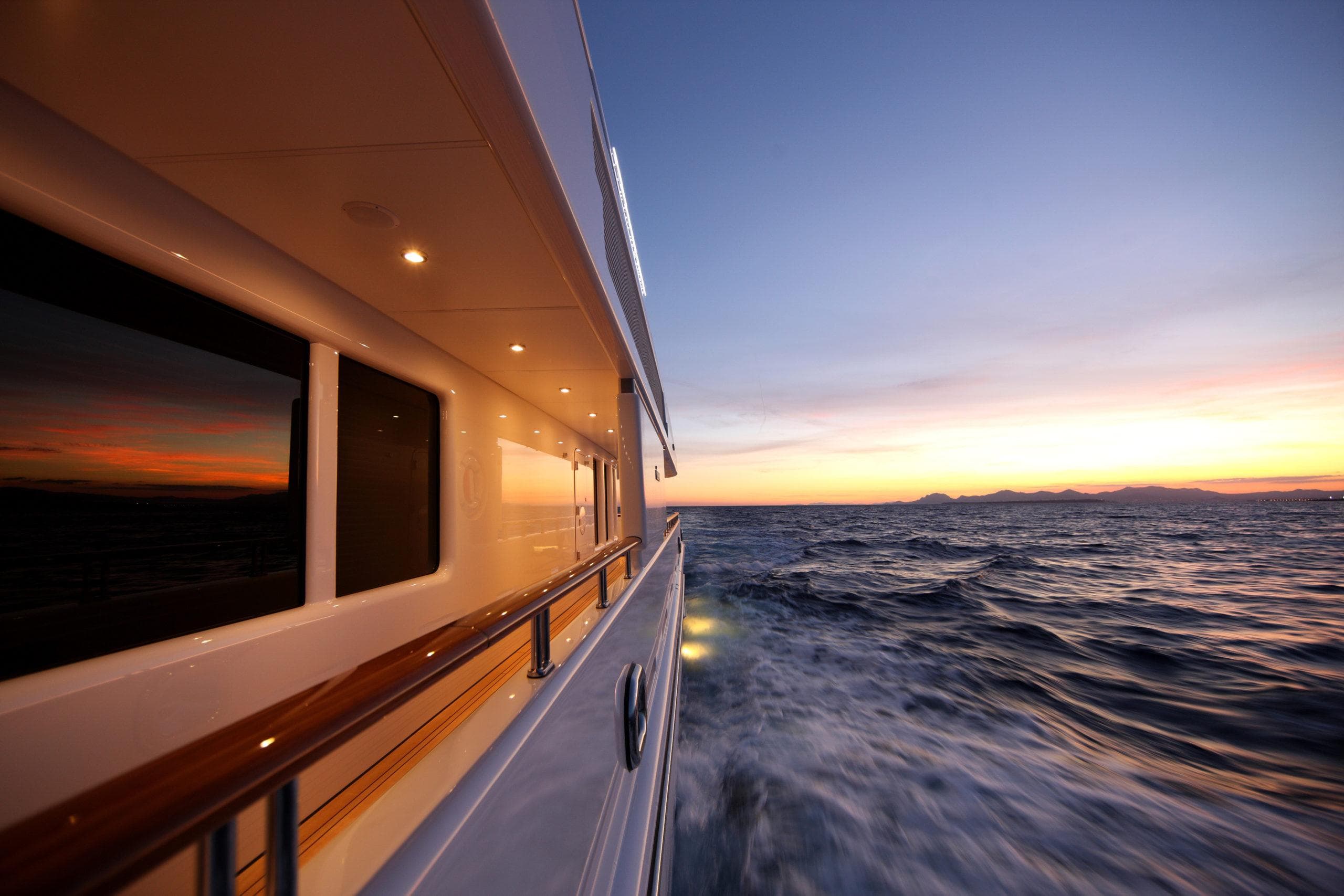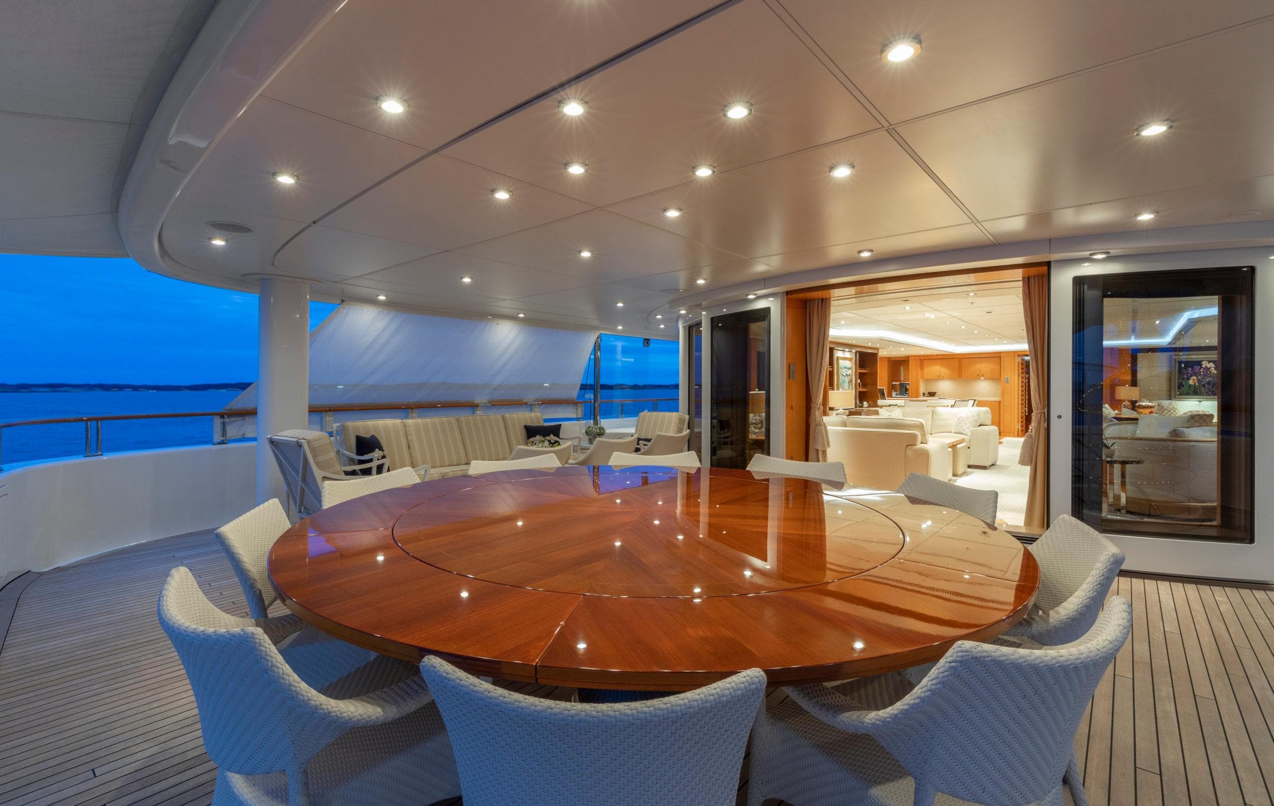 ОБЩЕЕ Размещение до 12 гостей в 6 каютах, главный салон залит естественным светом и отличается комфортными текстурами. Современное сочетание древесины ручной работы, контрастных тканей и профессионального освещения делает это пространство великолепным для светских встреч. Освещение, шторы и аудиовизуальные системы управляются с помощью интегрированных пультов на iPad. ВЛАДЕЛЕЦ Люкс владельца на всю ширину, расположенный на главной палубе, наполнен естественным светом от 6 больших овальных окон, подчёркивающих просторную зону отдыха и величественную кровать king-size в раме из чёрного anigre beauty. Телевизор Sony 70" LED HD обеспечивает доступ к фильмам на борту, а тщательно продуманное освещение создаёт насыщенную и экзотическую атмосферу. Ванная комната при каюте владельца включает джакузи с уютным декором из тёмного дерева ручной работы и мраморного пола, обрамляющего две раковины (dual vanities). Ароматерапевтический душ достаточно большой для двоих. ГОСТИ 1 VIP-люкс и 4 гостевые каюты. VIP-люкс расположен на мостиковой палубе и выполнен в современном стиле. 4 гостевые каюты расположены на нижней палубе: две каюты double и 2 каюты twin. Две гостевые каюты double одинаковые, и две гостевые каюты twin одинаковые. ЭКИПАЖ До 15 членов экипажа в 8 каютах