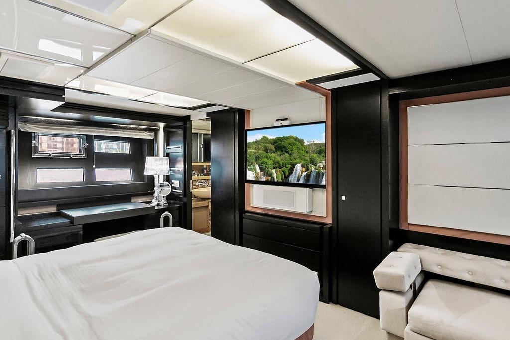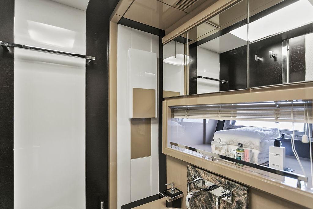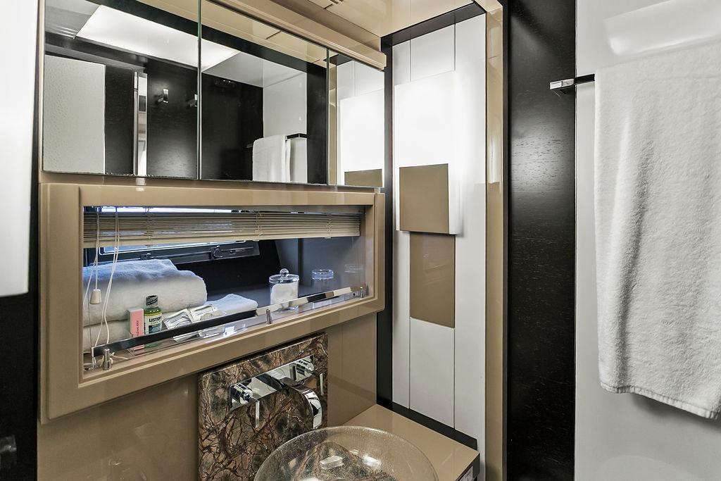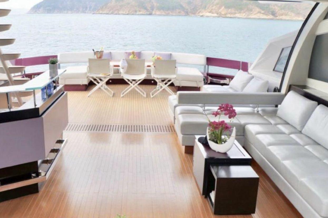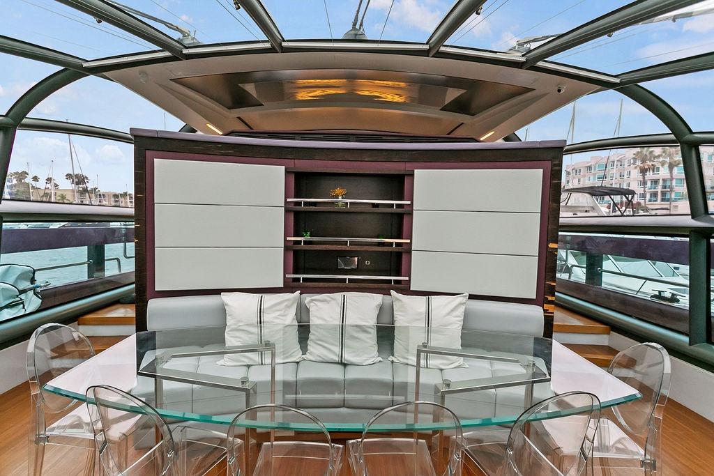 демонстрирует одну из самых впечатляющих трансформаций пространства «интерьер–экстерьер» среди яхт своего размера. Панорамный главный салон, мостик и формальная обеденная зона оснащены раздвижными стеклянными панелями, которые полностью открываются, объединяясь с внешними палубами, либо закрываются для приватности и климат-контроля. Верхнее остекление в носовой части наполняет пространство естественным светом, создавая воздушную и элегантную атмосферу.