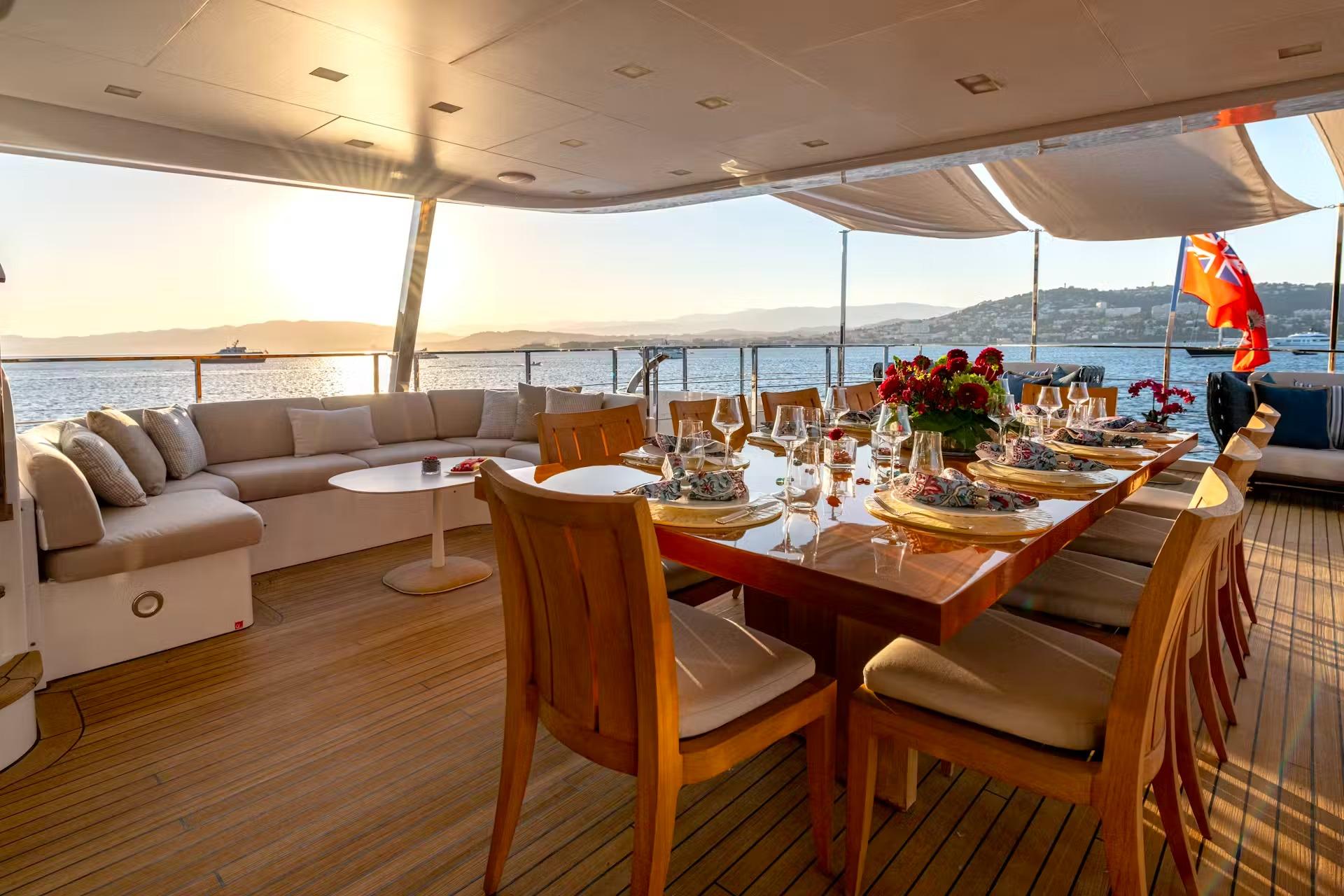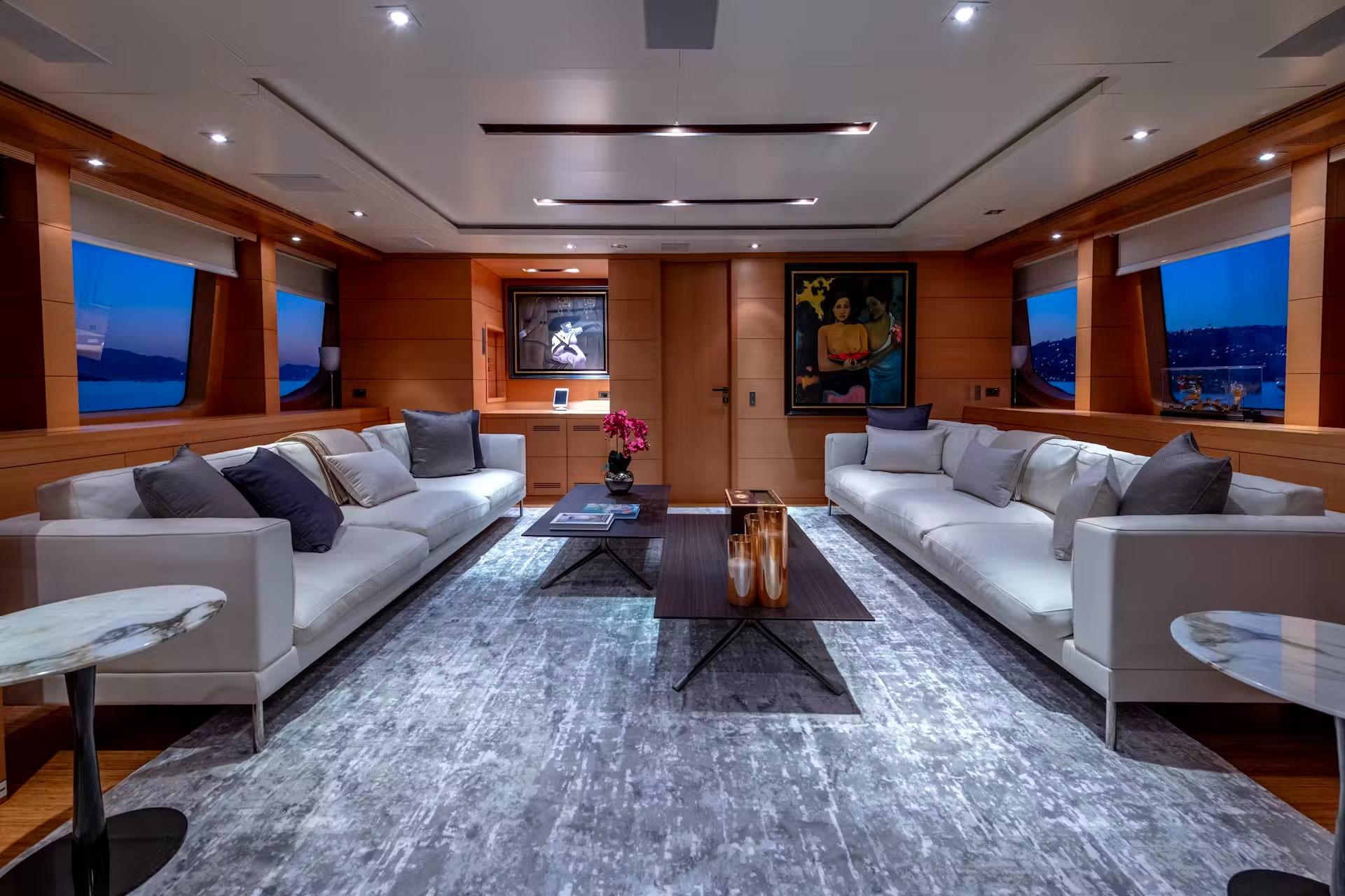 Интерьеры наполнены естественным светом благодаря большим окнам по всему корпусу, создавая светлую и гостеприимную атмосферу. Гости могут собираться в просторном главном салоне, наслаждаться кинопросмотрами в элегантном sky lounge или отдыхать на солнечной палубе с джакузи, шезлонгами, затенённой обеденной зоной и панорамными видами. Открытые пространства яхты органично перетекают друг в друга и идеально подходят как для отдыха, так и для светских мероприятий.