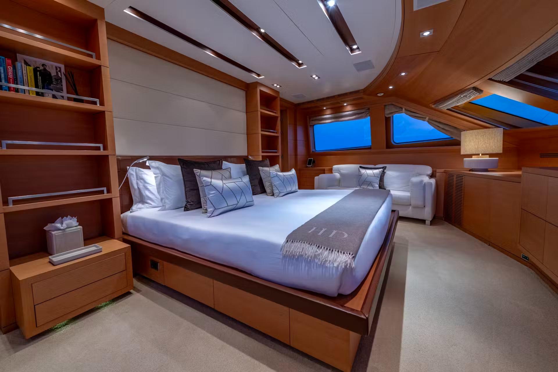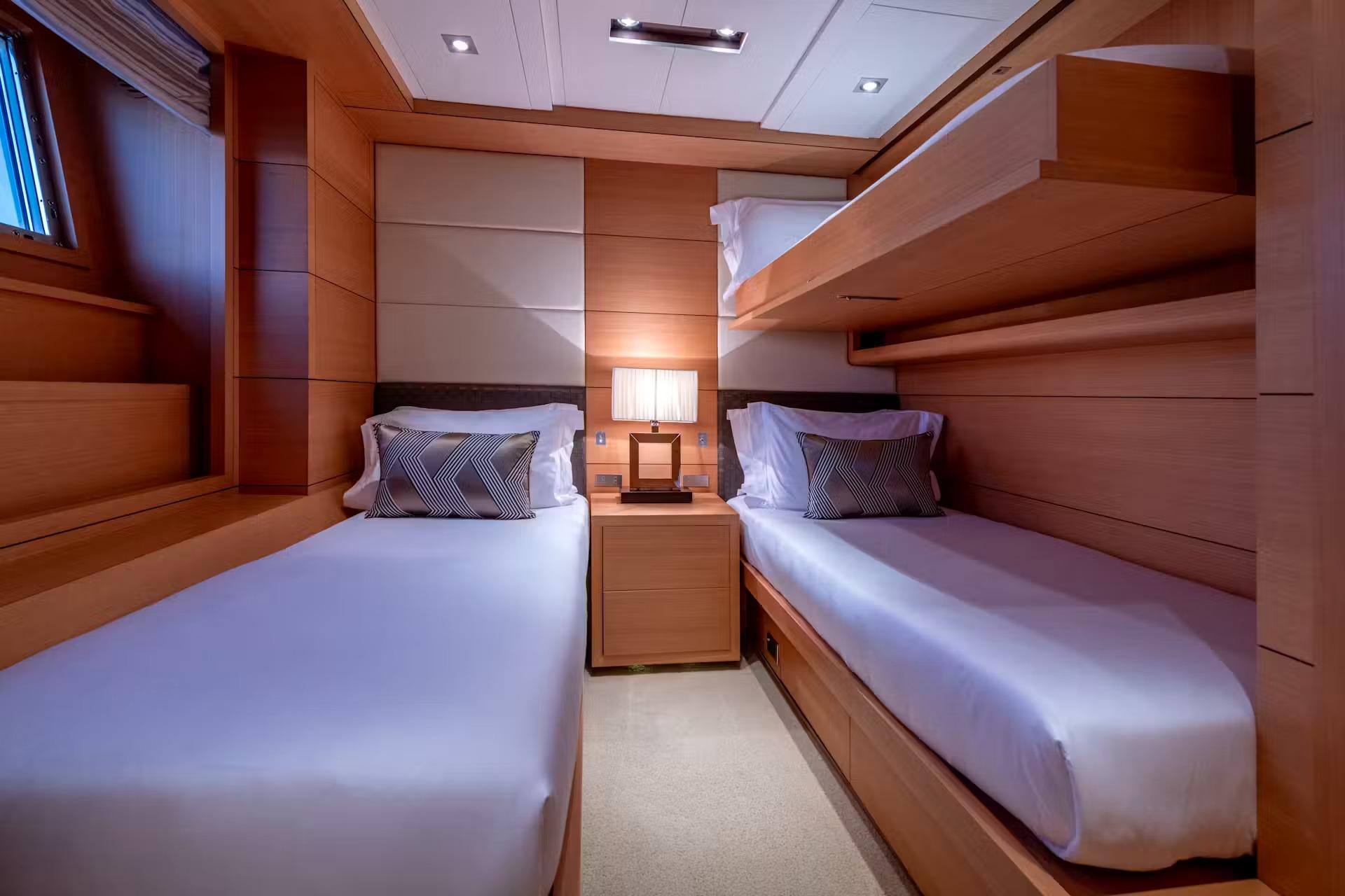 Просторная трёхпалубная компоновка яхты тщательно продумана для размещения до 12 гостей в 5 элегантно оформленных каютах. Полноширинная каюта владельца на главной палубе предлагает панорамные виды на море, кровать king-size, приватный кабинет, гардеробную и роскошную ванную комнату с хаммамом. Две VIP-каюты и две каюты с раздельными кроватями и дополнительными Pullman-местами дополняют гостевые помещения — каждая с собственной ванной комнатой. Отдельные каюты экипажа на 7 человек обеспечивают высокий уровень сервиса на борту.
