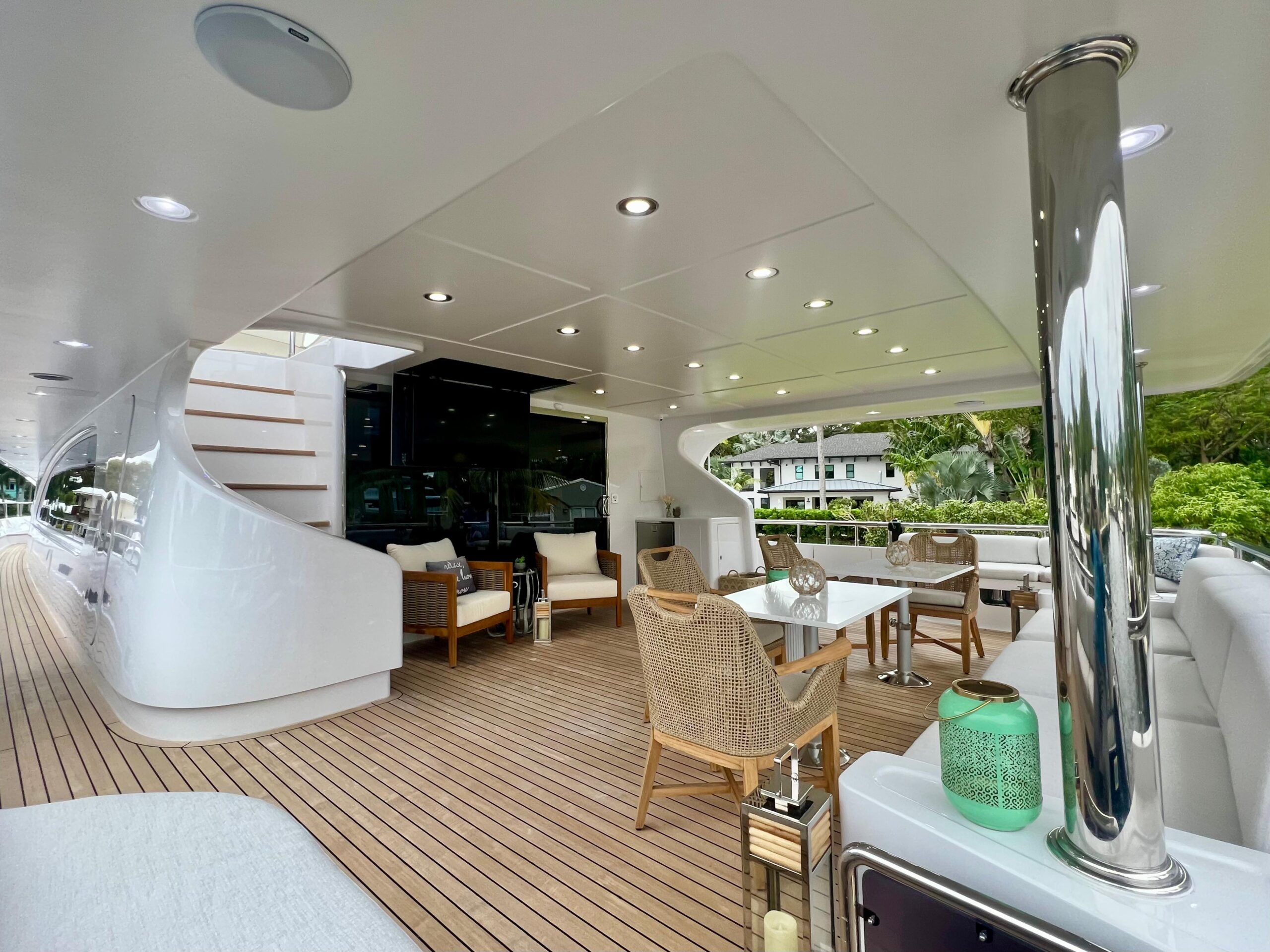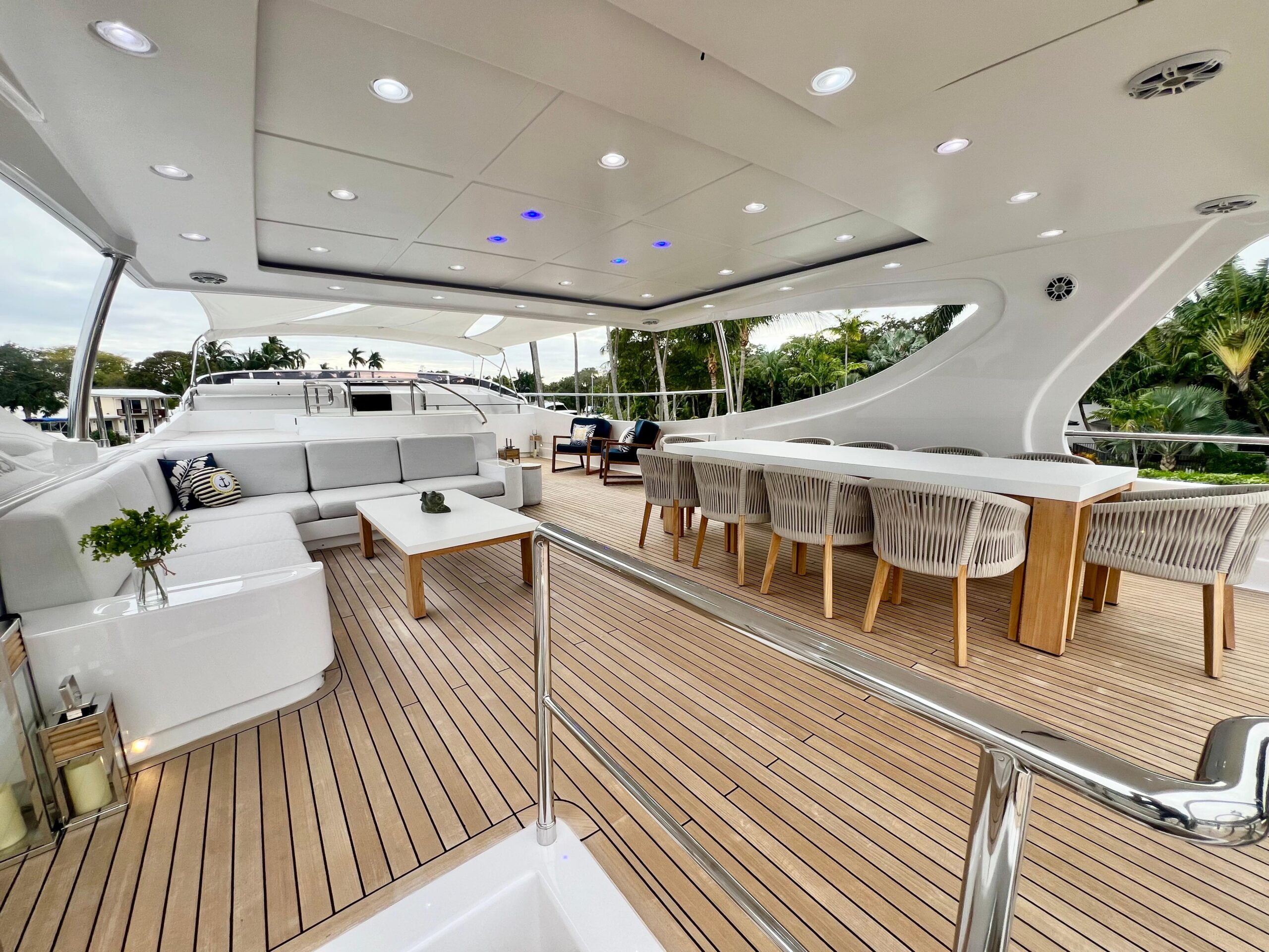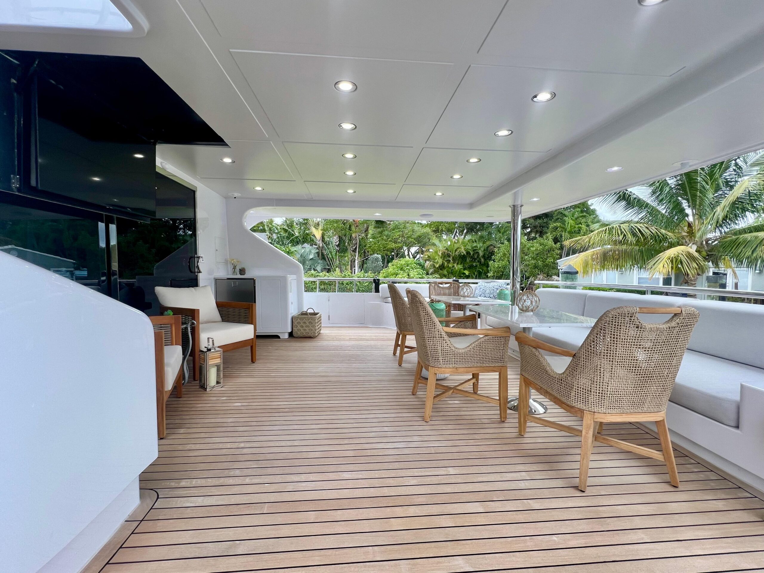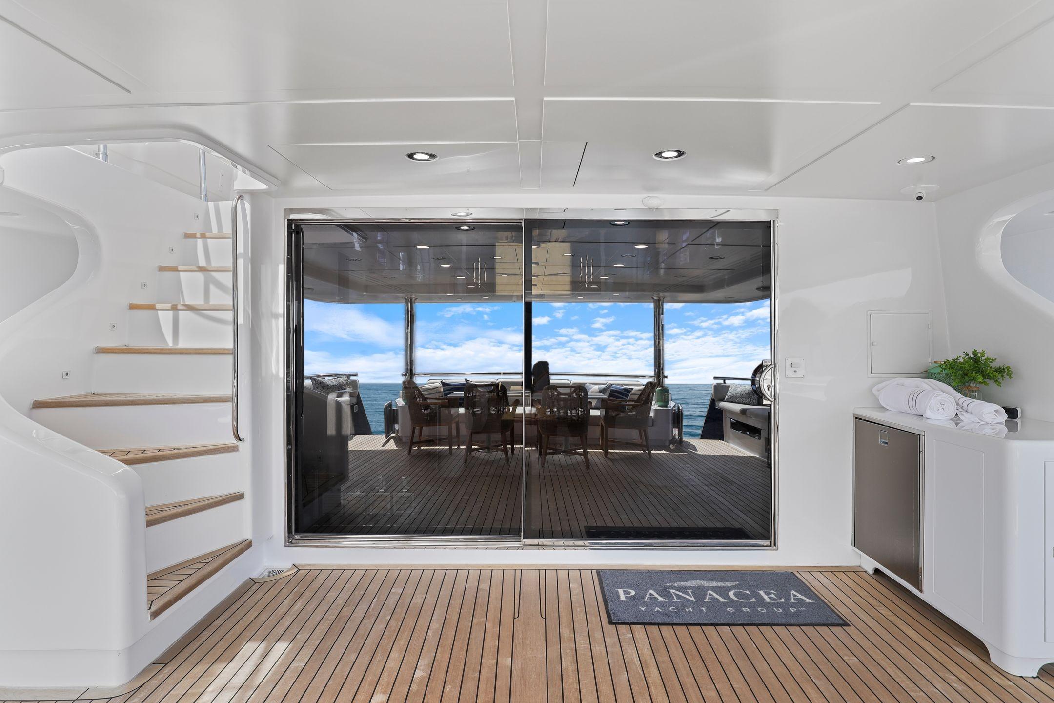 Просторная кормовая палуба оснащена лаунж-зонами по бортам, новой мебелью, новой обивкой и современной светодиодной потолочной подсветкой. Флайбридж PANACEA сопоставим с тем, что можно увидеть на значительно более крупных яхтах: огромная ровная палуба, большая зона для загара в корме с местом для водных игрушек, обеденная и лаунж-зона под хардтопом, а также зона отдыха с джакузи и баром в носовой части. Найти яхту этого класса с аналогичной внутренней и внешней планировкой будет крайне сложно.
