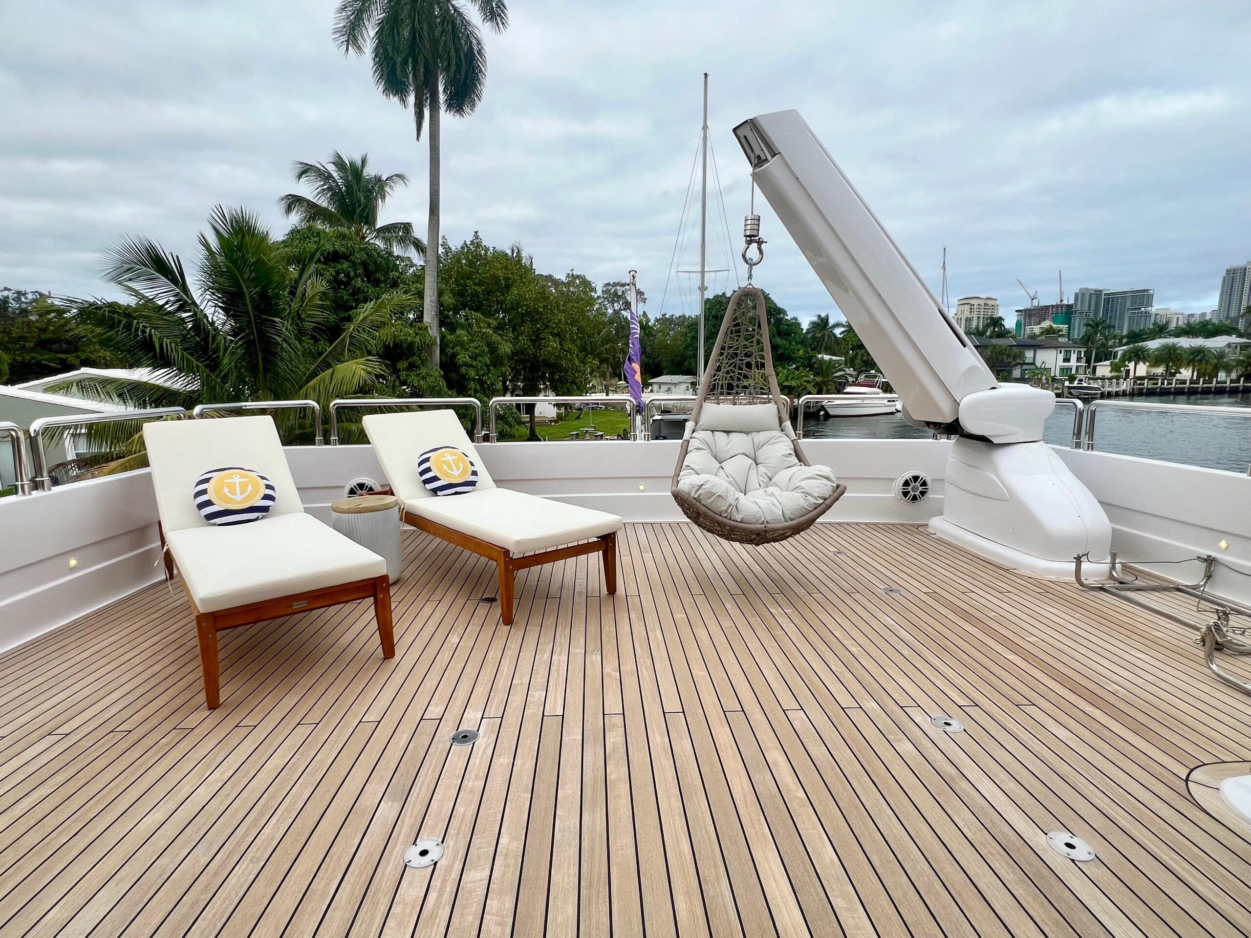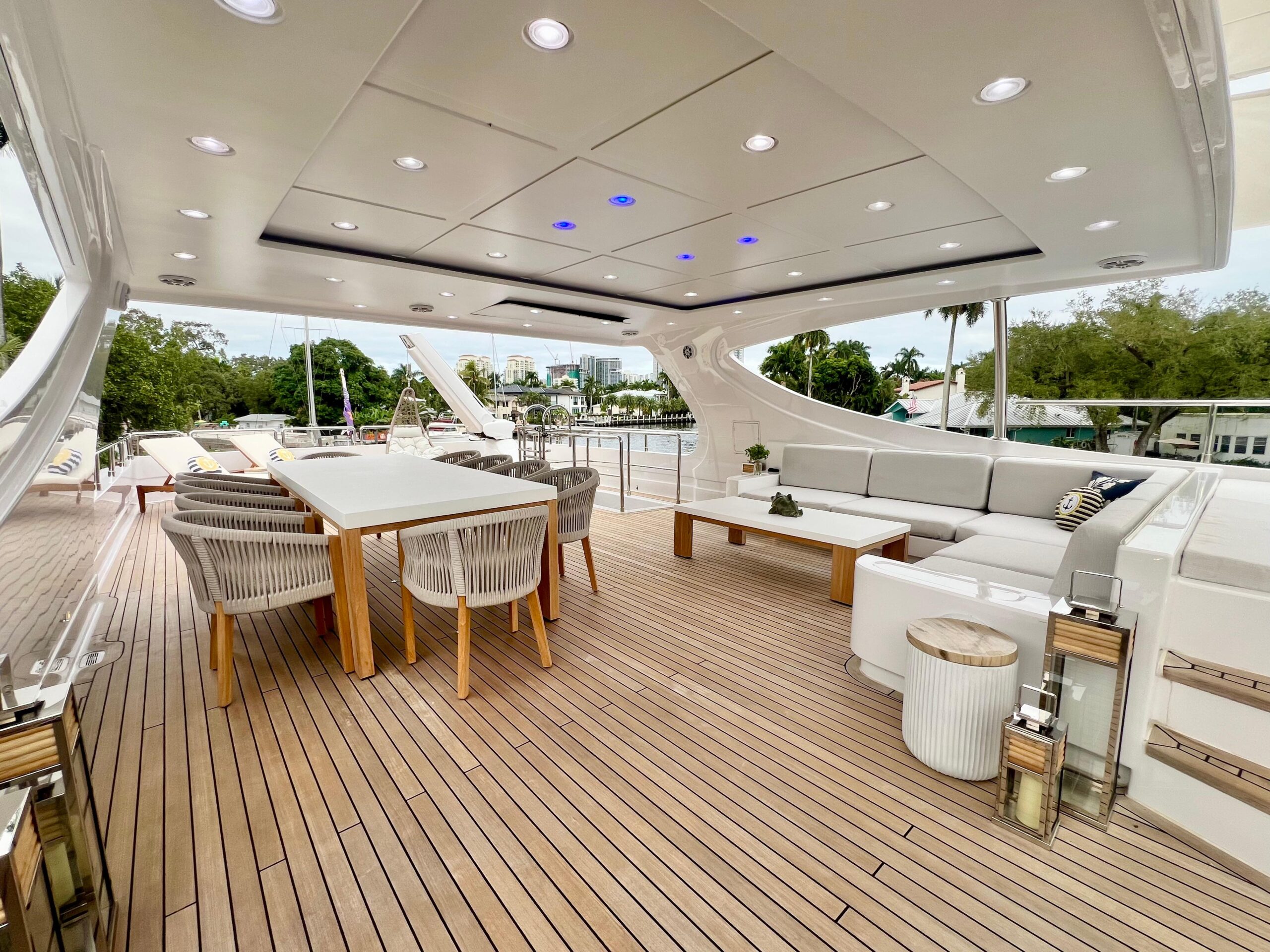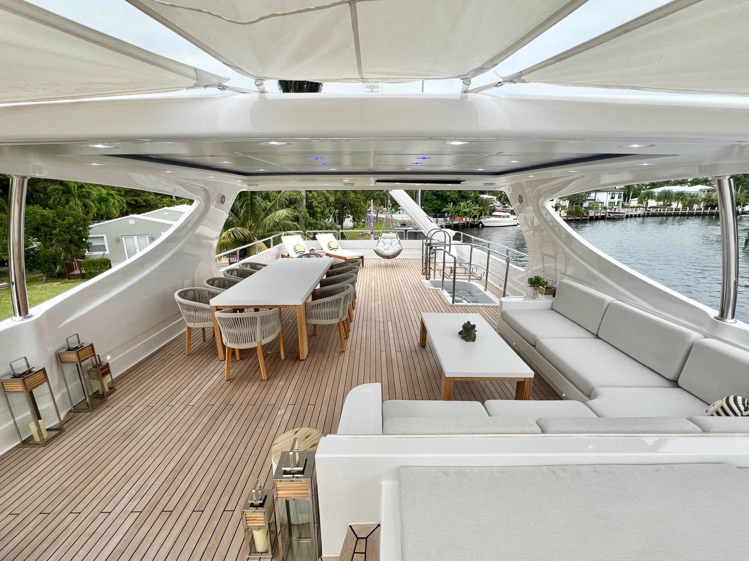Просторная кормовая палуба оснащена лаунж-зонами по бортам, новой мебелью, новой обивкой и современной светодиодной потолочной подсветкой. Флайбридж PANACEA сопоставим с тем, что можно увидеть на значительно более крупных яхтах: огромная ровная палуба, большая зона для загара в корме с местом для водных игрушек, обеденная и лаунж-зона под хардтопом, а также зона отдыха с джакузи и баром в носовой части. Найти яхту этого класса с аналогичной внутренней и внешней планировкой будет крайне сложно.