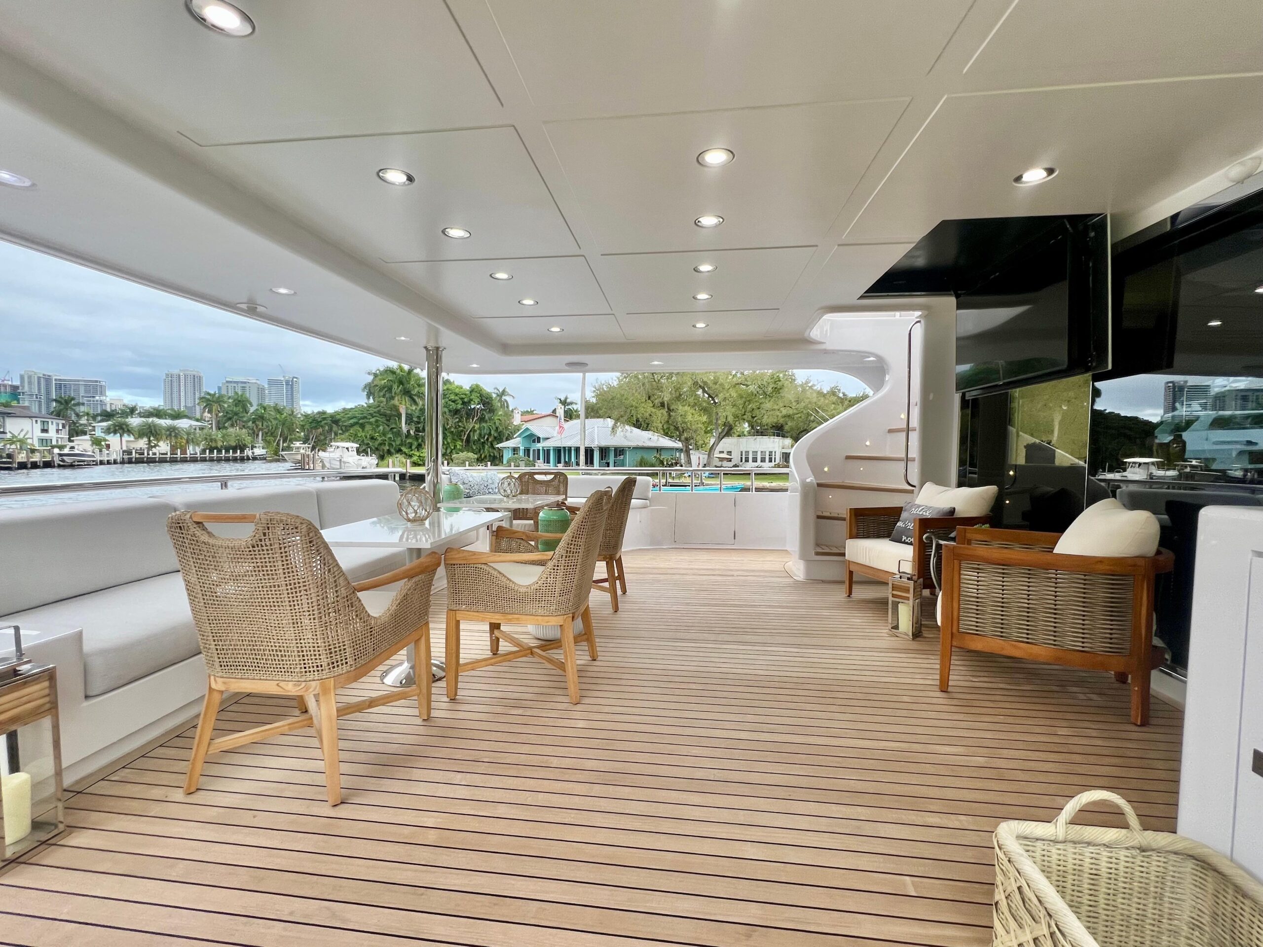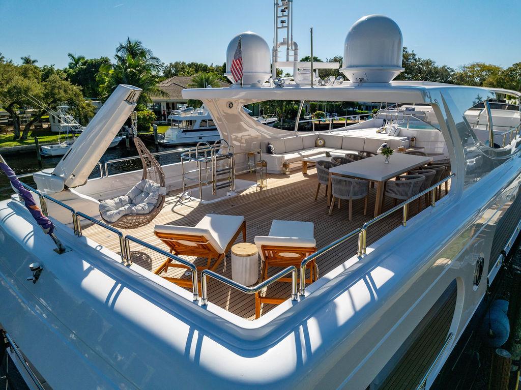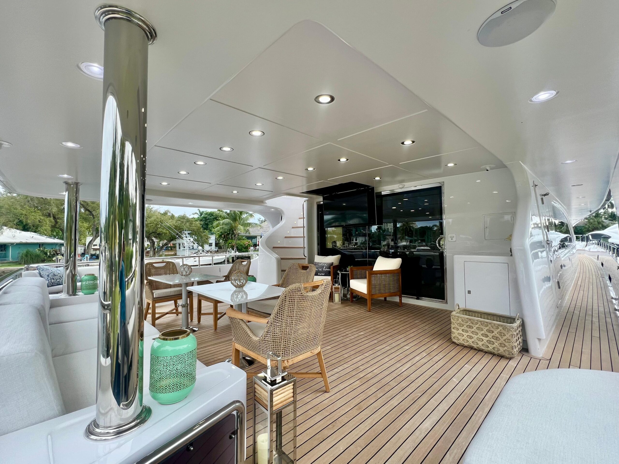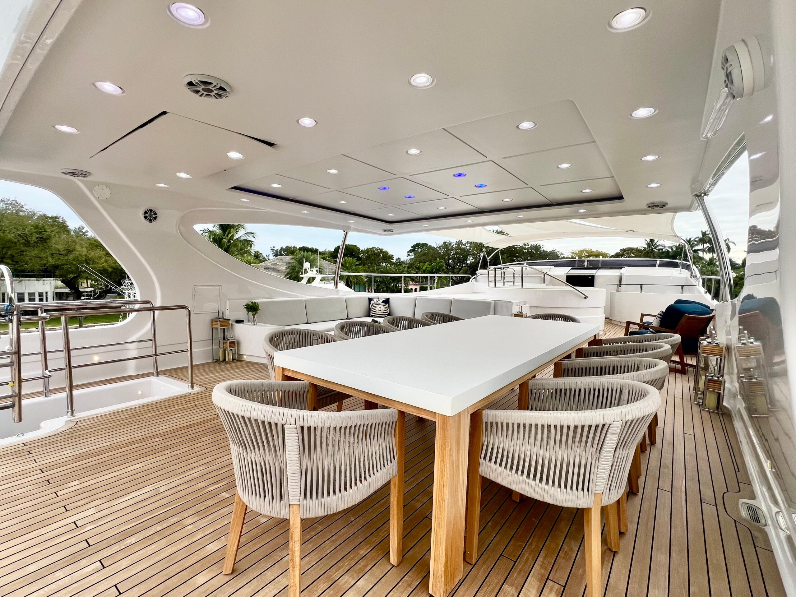 Просторная кормовая палуба оснащена лаунж-зонами по бортам, новой мебелью, новой обивкой и современной светодиодной потолочной подсветкой. Флайбридж PANACEA сопоставим с тем, что можно увидеть на значительно более крупных яхтах: огромная ровная палуба, большая зона для загара в корме с местом для водных игрушек, обеденная и лаунж-зона под хардтопом, а также зона отдыха с джакузи и баром в носовой части. Найти яхту этого класса с аналогичной внутренней и внешней планировкой будет крайне сложно.