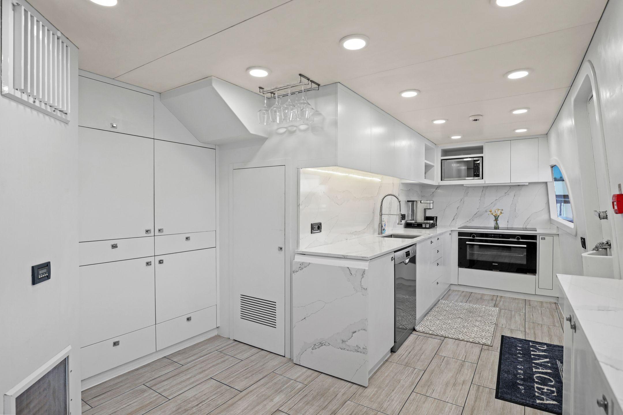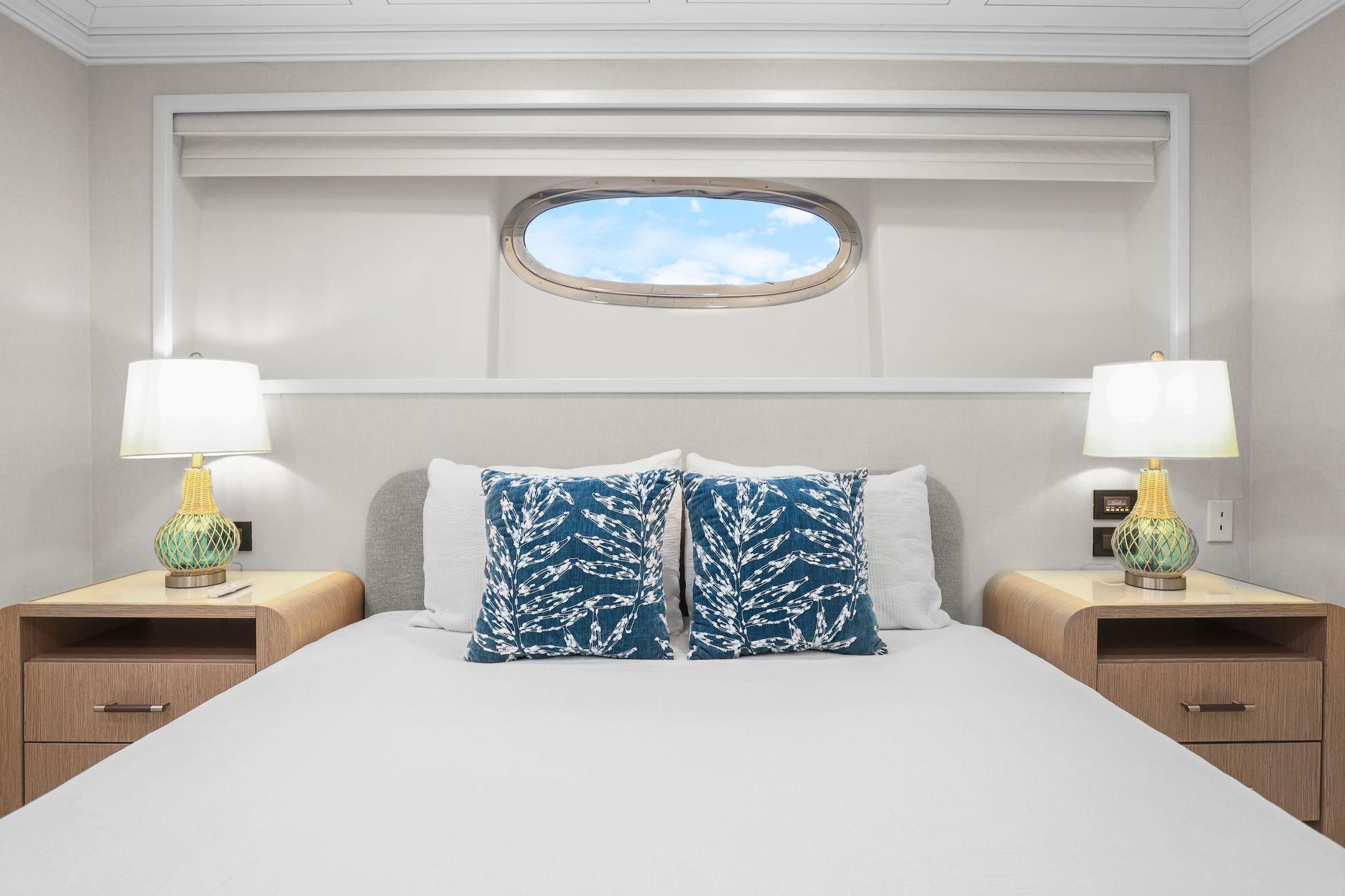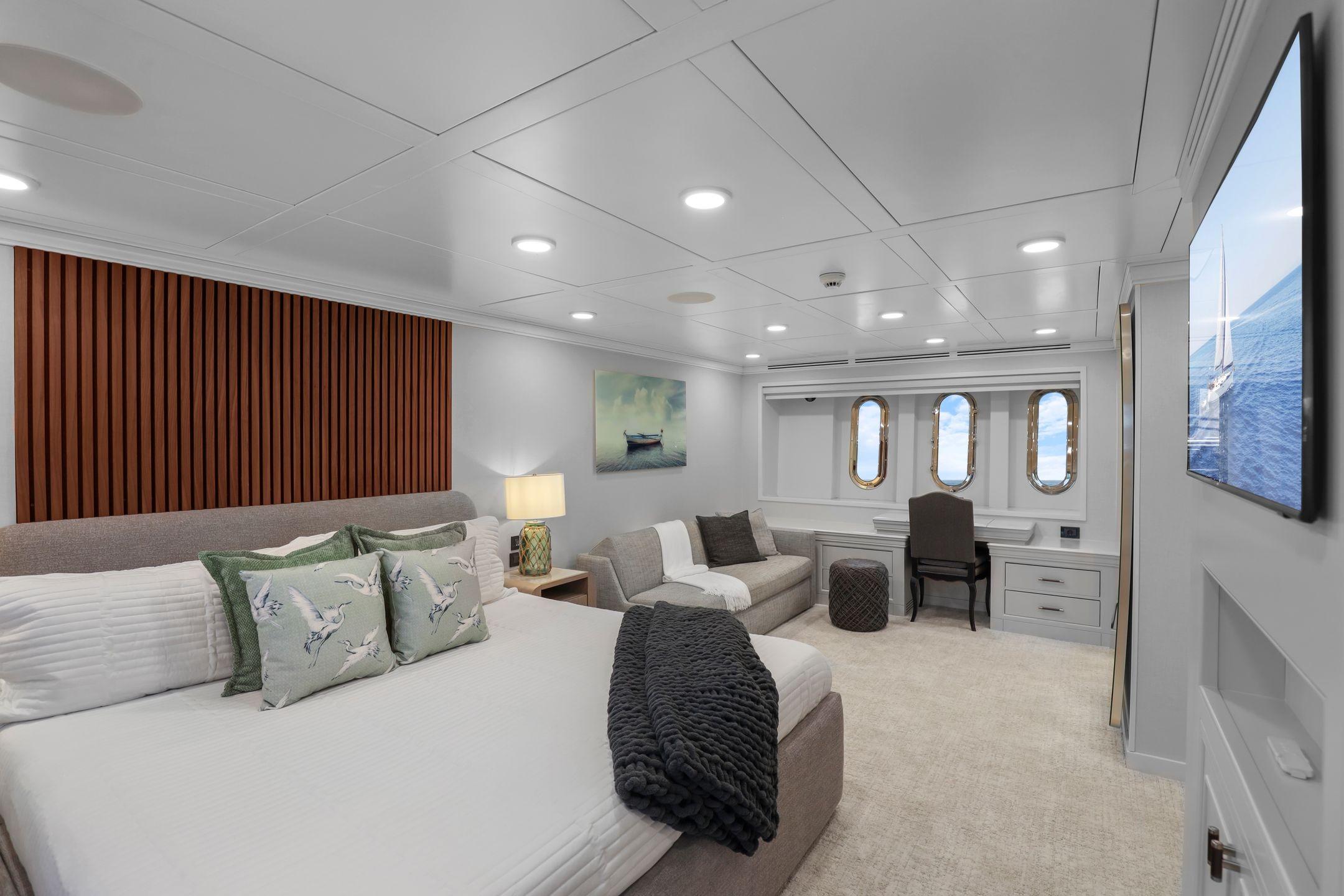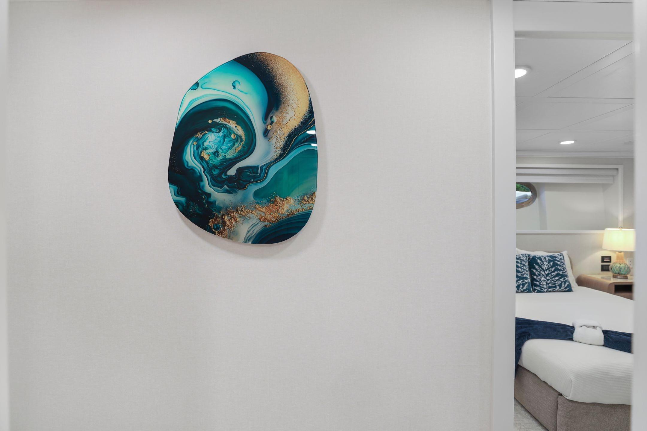 Только что завершённый рефит PANACEA можно назвать по-настоящему впечатляющим. В интерьере обновлено абсолютно всё: деревянные панели и мебель, напольные покрытия, стеновые покрытия, полностью заменено светодиодное освещение, кварцевые столешницы в санузлах и камбузе, индивидуально выполненный мрамор SkinRock Carrara в ванных комнатах, сантехника, обновлённые аудио- и видеосистемы, обслужена система кондиционирования, установлена индивидуальная мебель — и это далеко не полный список.