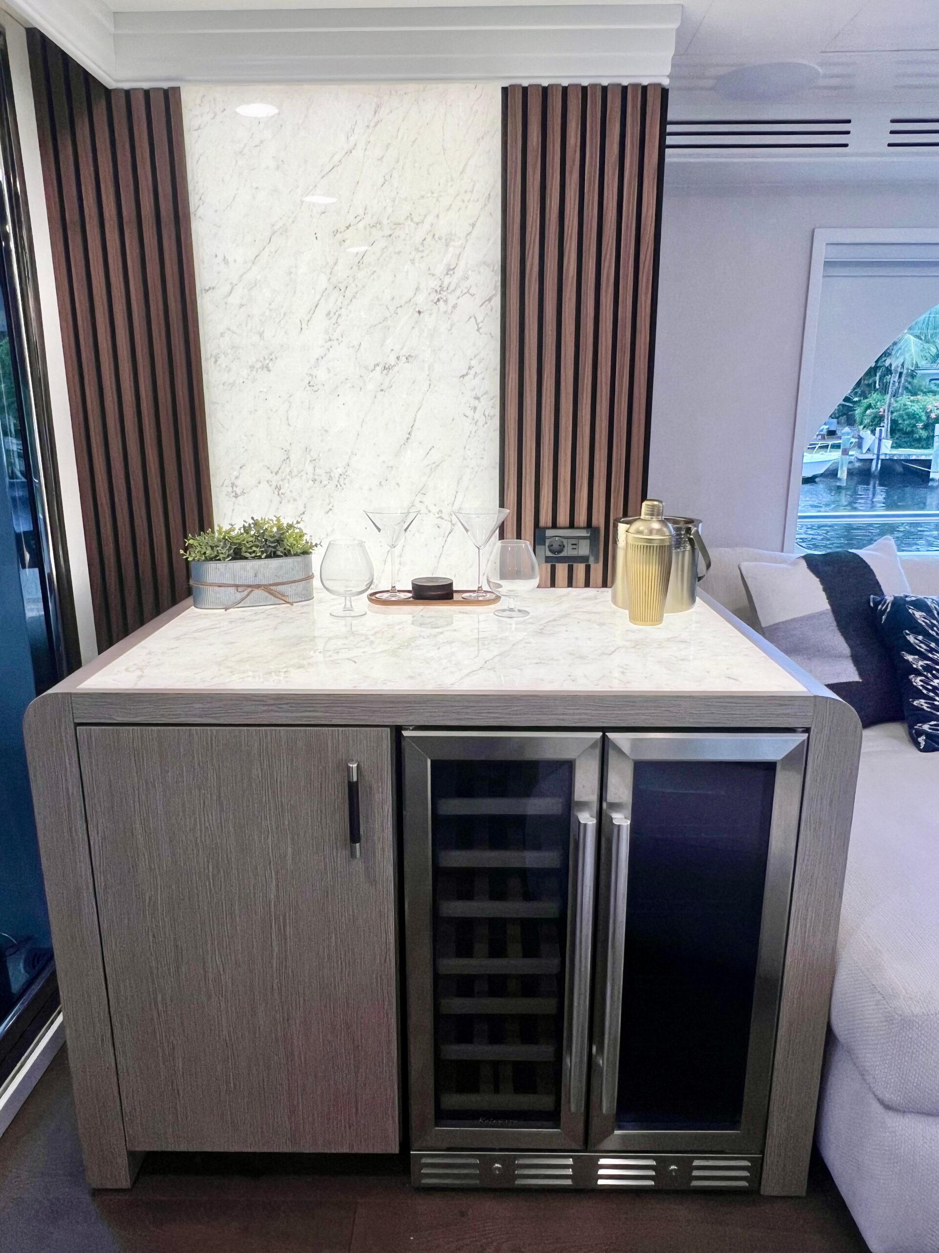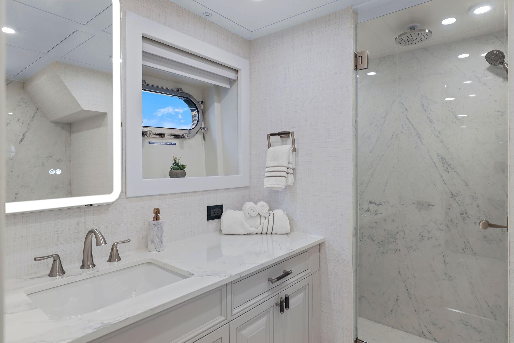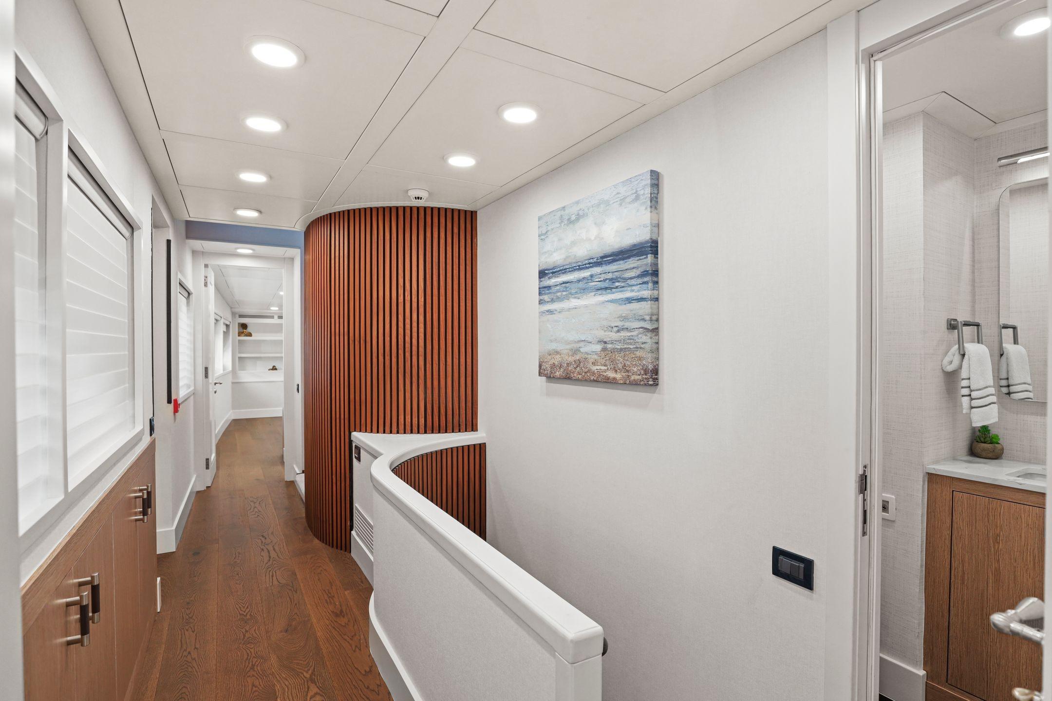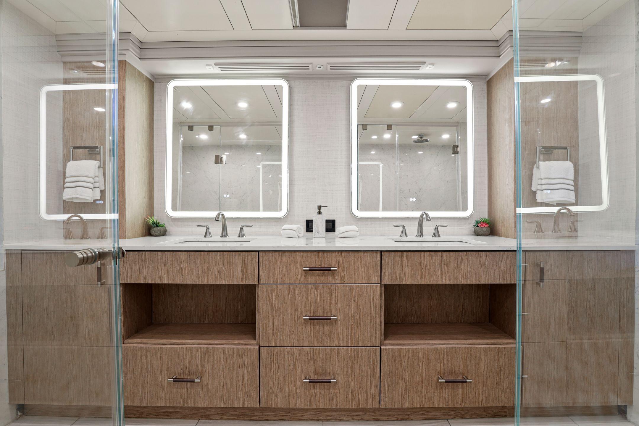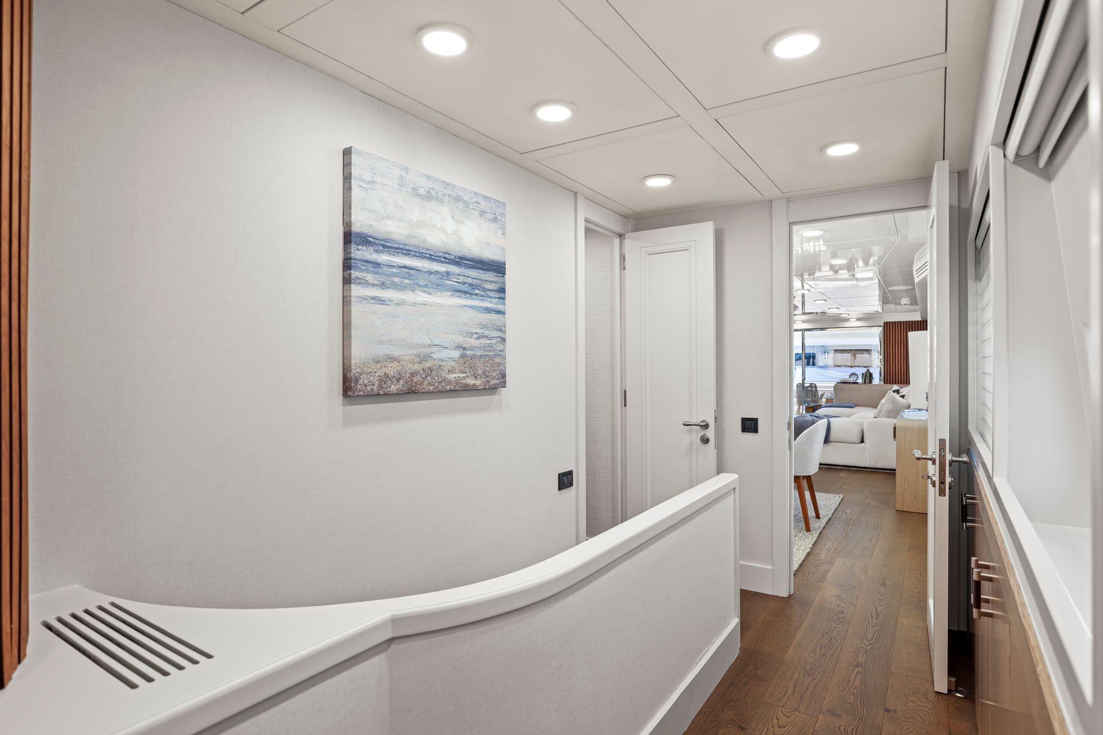 Только что завершённый рефит PANACEA можно назвать по-настоящему впечатляющим. В интерьере обновлено абсолютно всё: деревянные панели и мебель, напольные покрытия, стеновые покрытия, полностью заменено светодиодное освещение, кварцевые столешницы в санузлах и камбузе, индивидуально выполненный мрамор SkinRock Carrara в ванных комнатах, сантехника, обновлённые аудио- и видеосистемы, обслужена система кондиционирования, установлена индивидуальная мебель — и это далеко не полный список.
