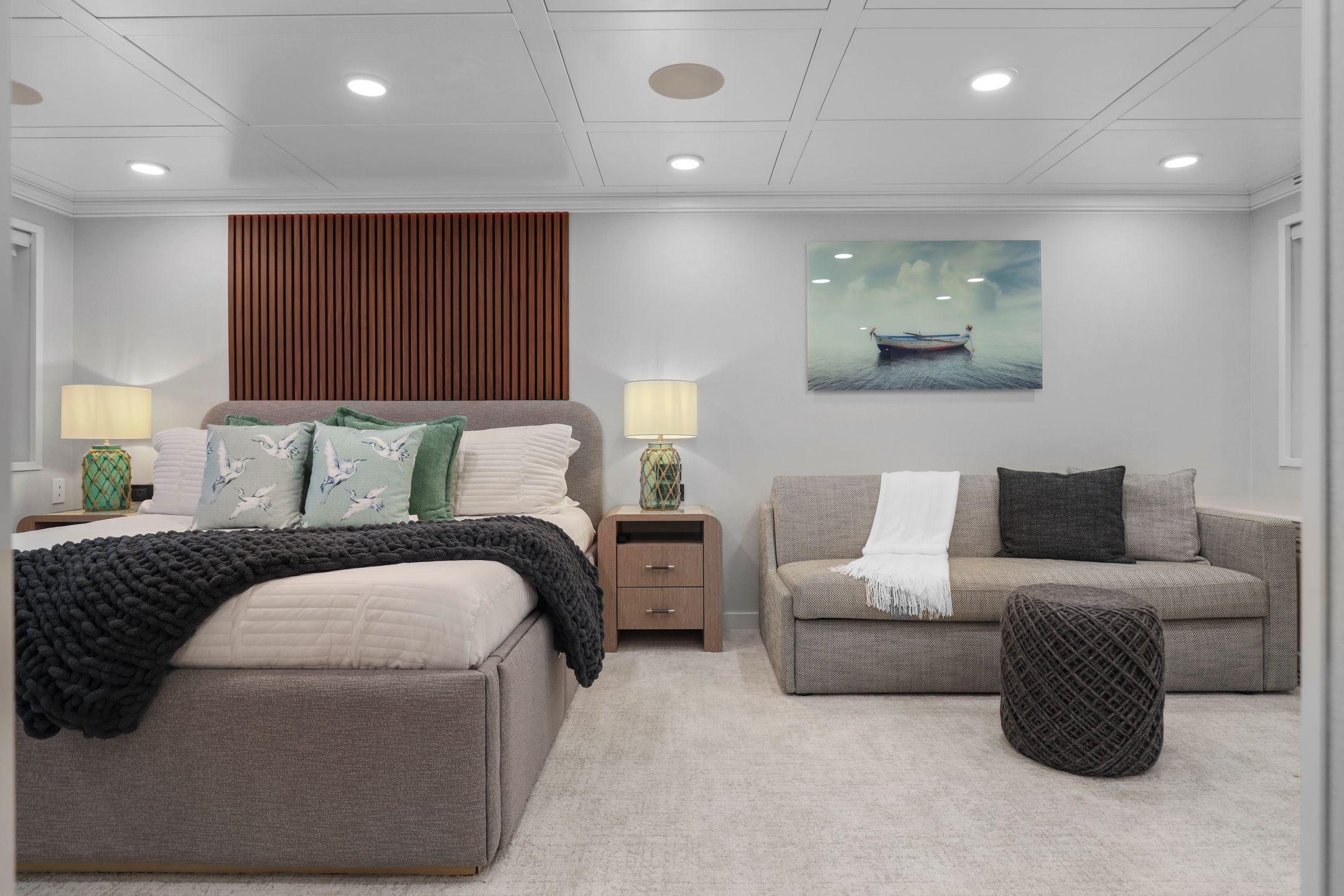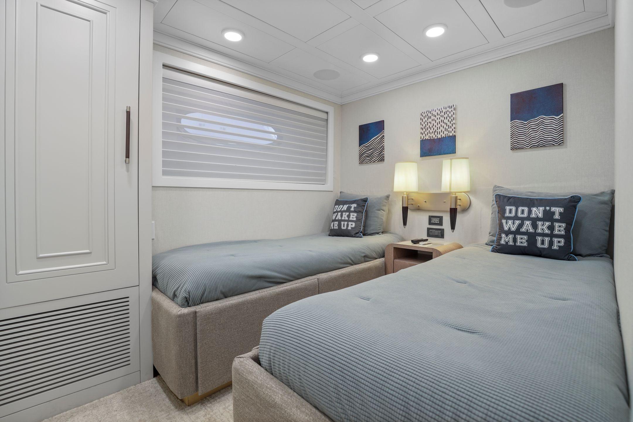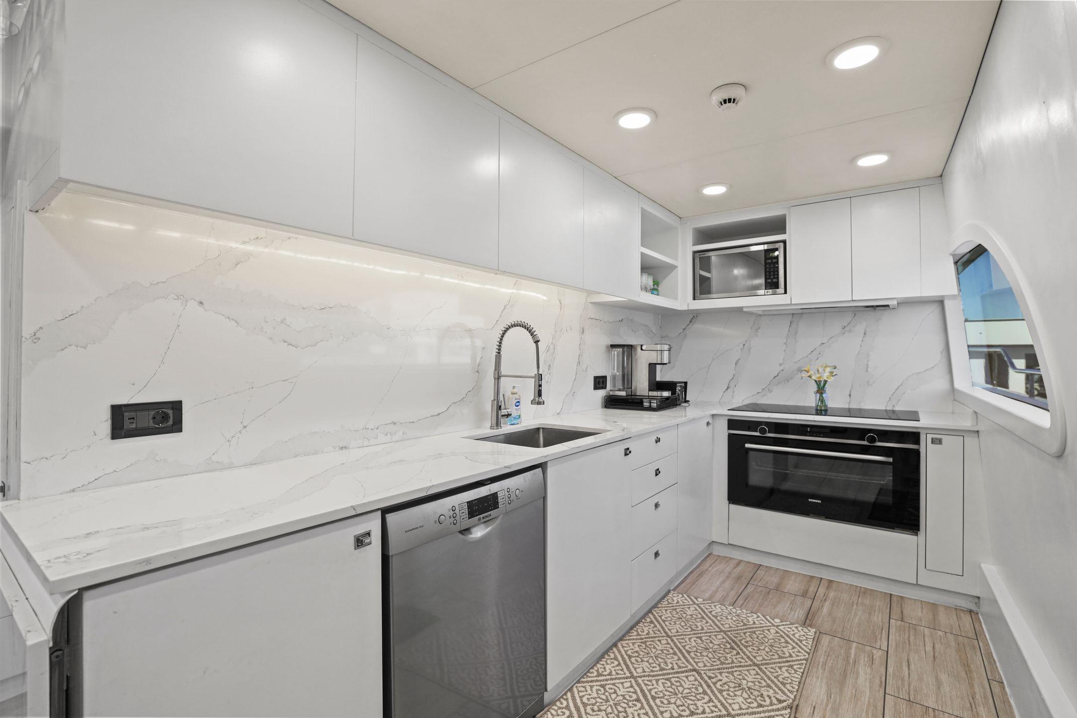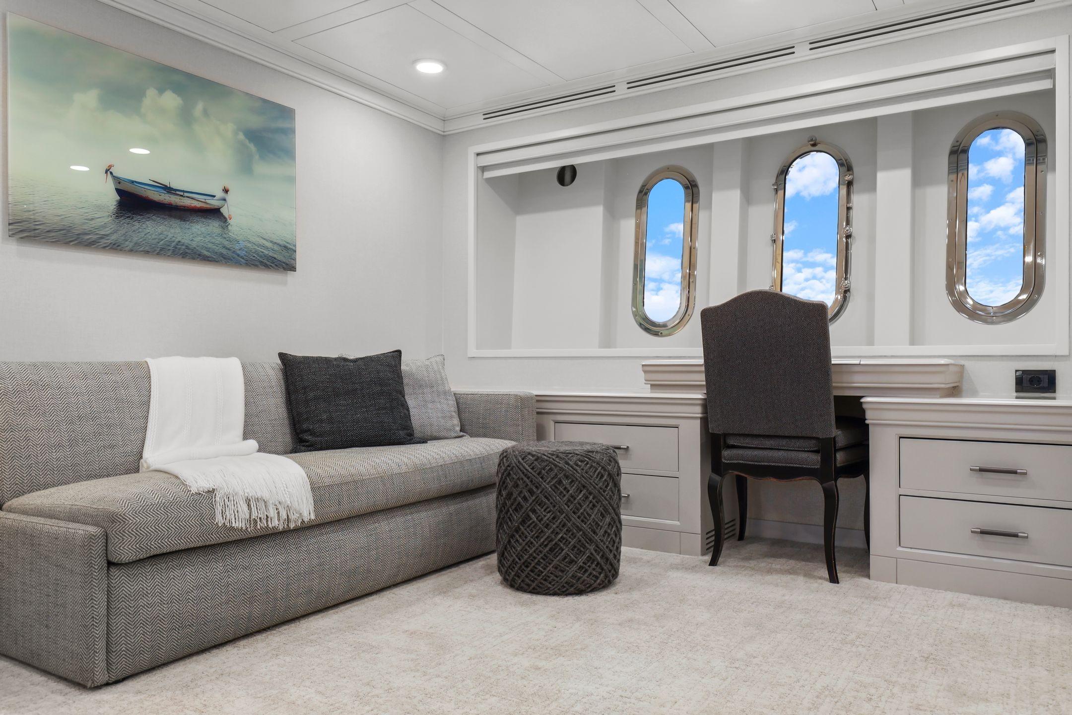 Только что завершённый рефит PANACEA можно назвать по-настоящему впечатляющим. В интерьере обновлено абсолютно всё: деревянные панели и мебель, напольные покрытия, стеновые покрытия, полностью заменено светодиодное освещение, кварцевые столешницы в санузлах и камбузе, индивидуально выполненный мрамор SkinRock Carrara в ванных комнатах, сантехника, обновлённые аудио- и видеосистемы, обслужена система кондиционирования, установлена индивидуальная мебель — и это далеко не полный список.