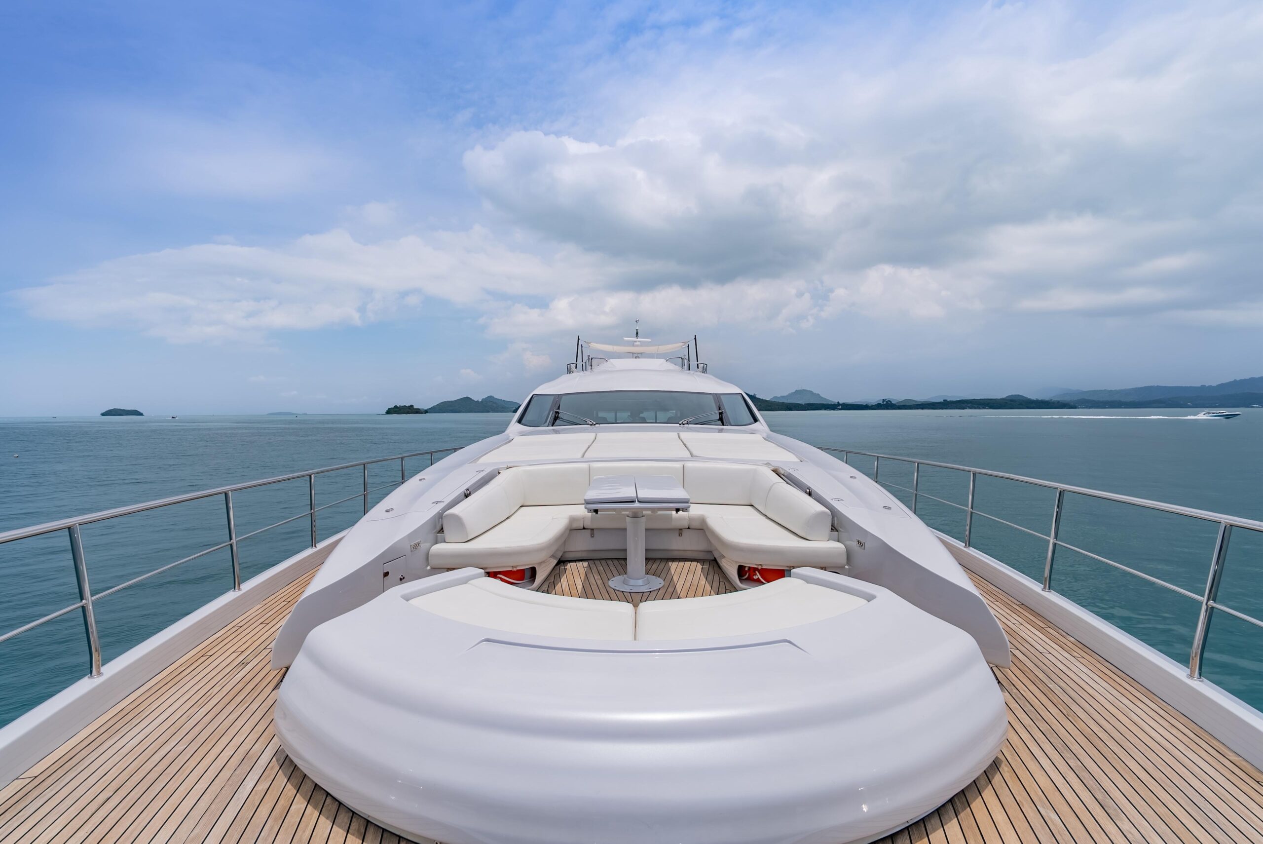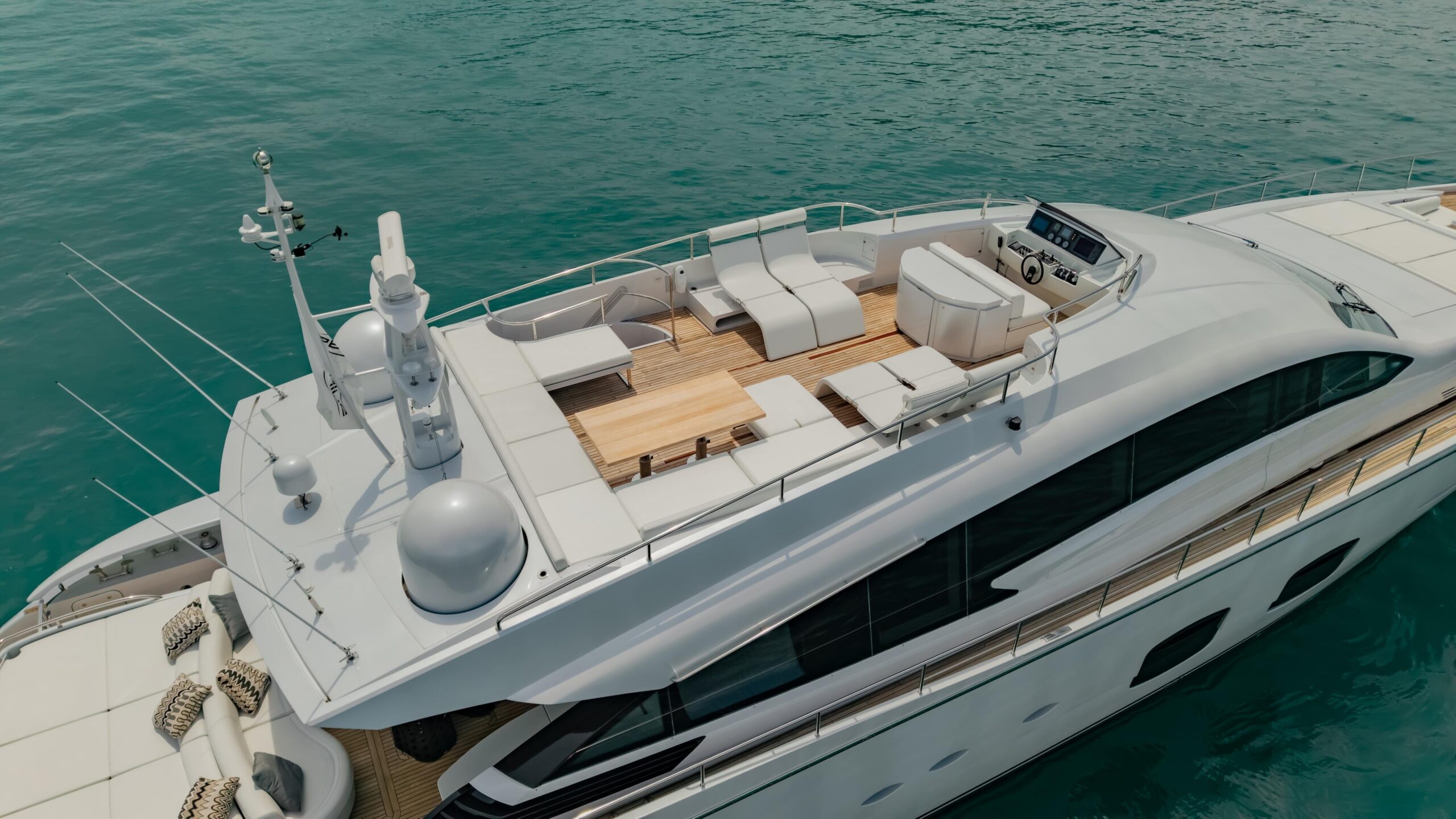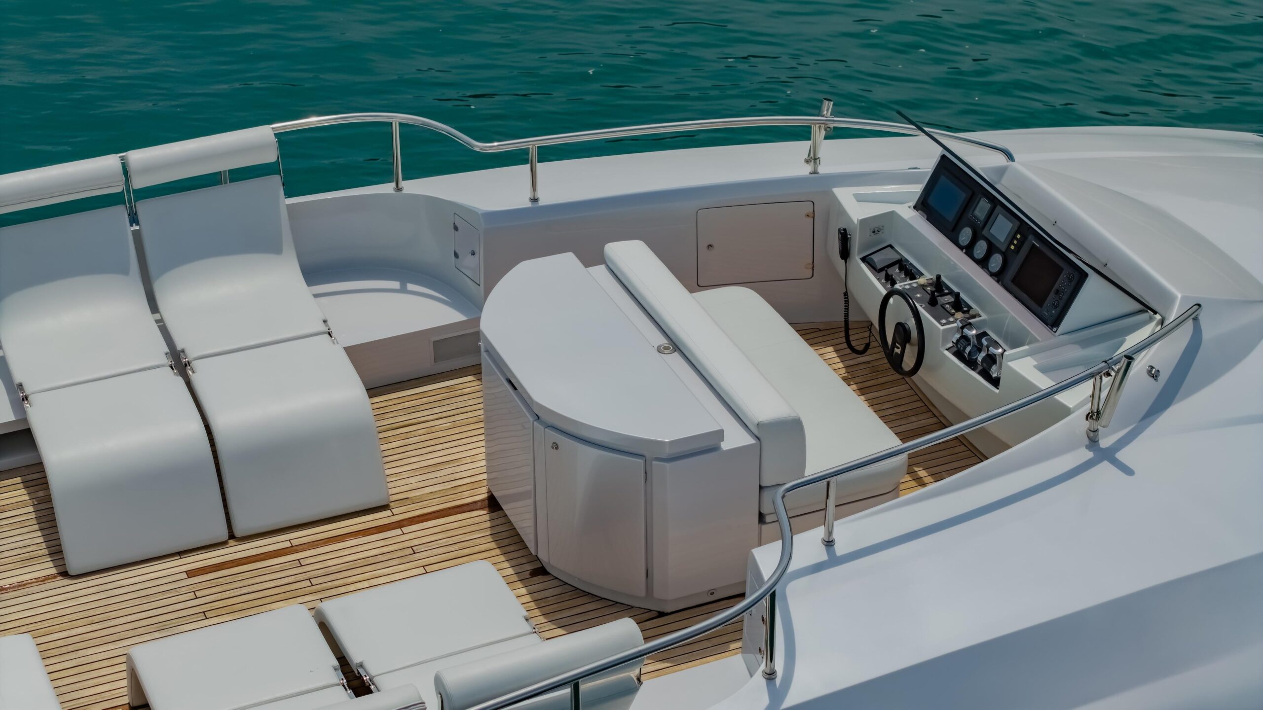 Невероятно просторная солнечная палуба оснащена выдвижной консолью управления, большим С-образным диваном со столом, который можно опустить до уровня сидений, а также четырьмя складными шезлонгами, превращающимися в удобные эргономичные кресла. Это автономная и функциональная зона, которой лучше всего наслаждаться в моменты расслабленного отдыха на борту.