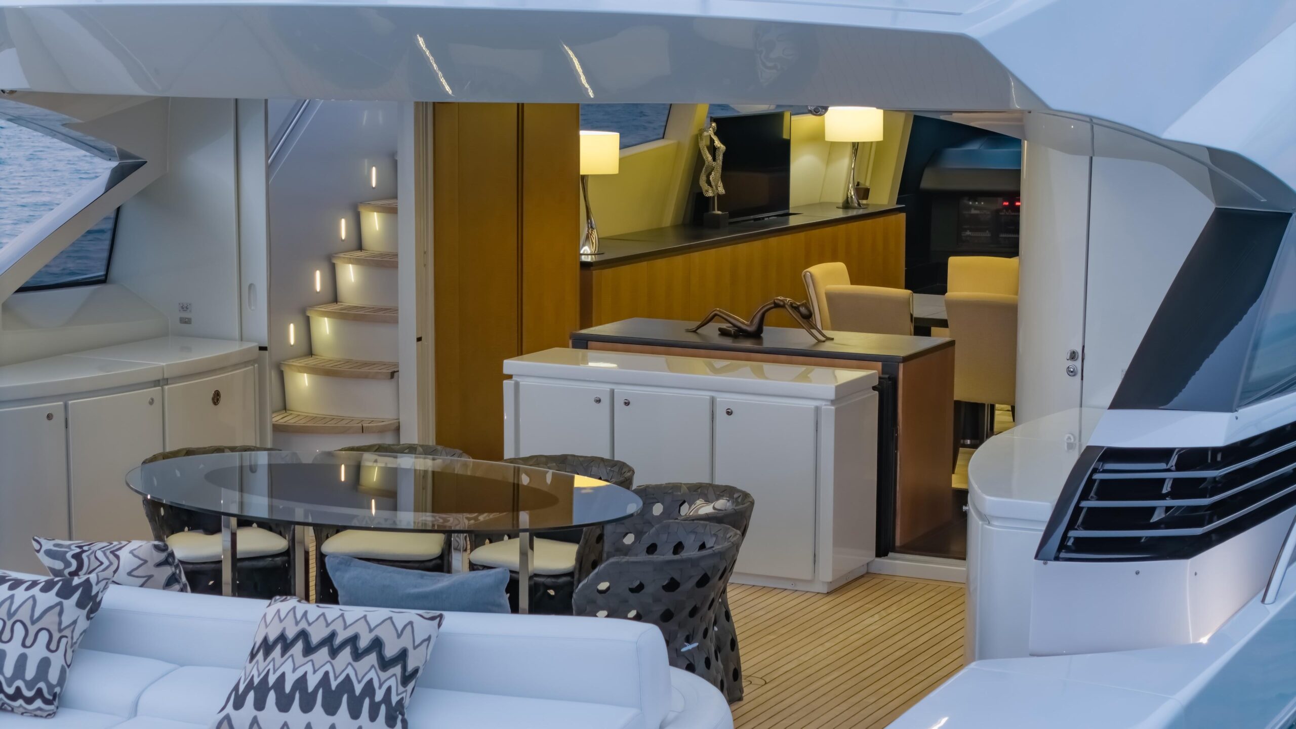 Большой кормовой кокпит можно использовать и днём, и вечером; это просторная крытая зона с диваном и столом, за которым могут разместиться до 10 человек, с элегантной столешницей из хрусталя на стальном основании, а также пятью современными стульями.