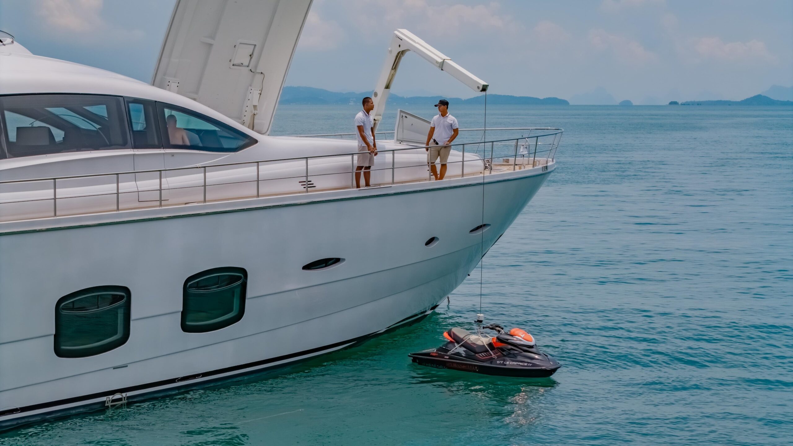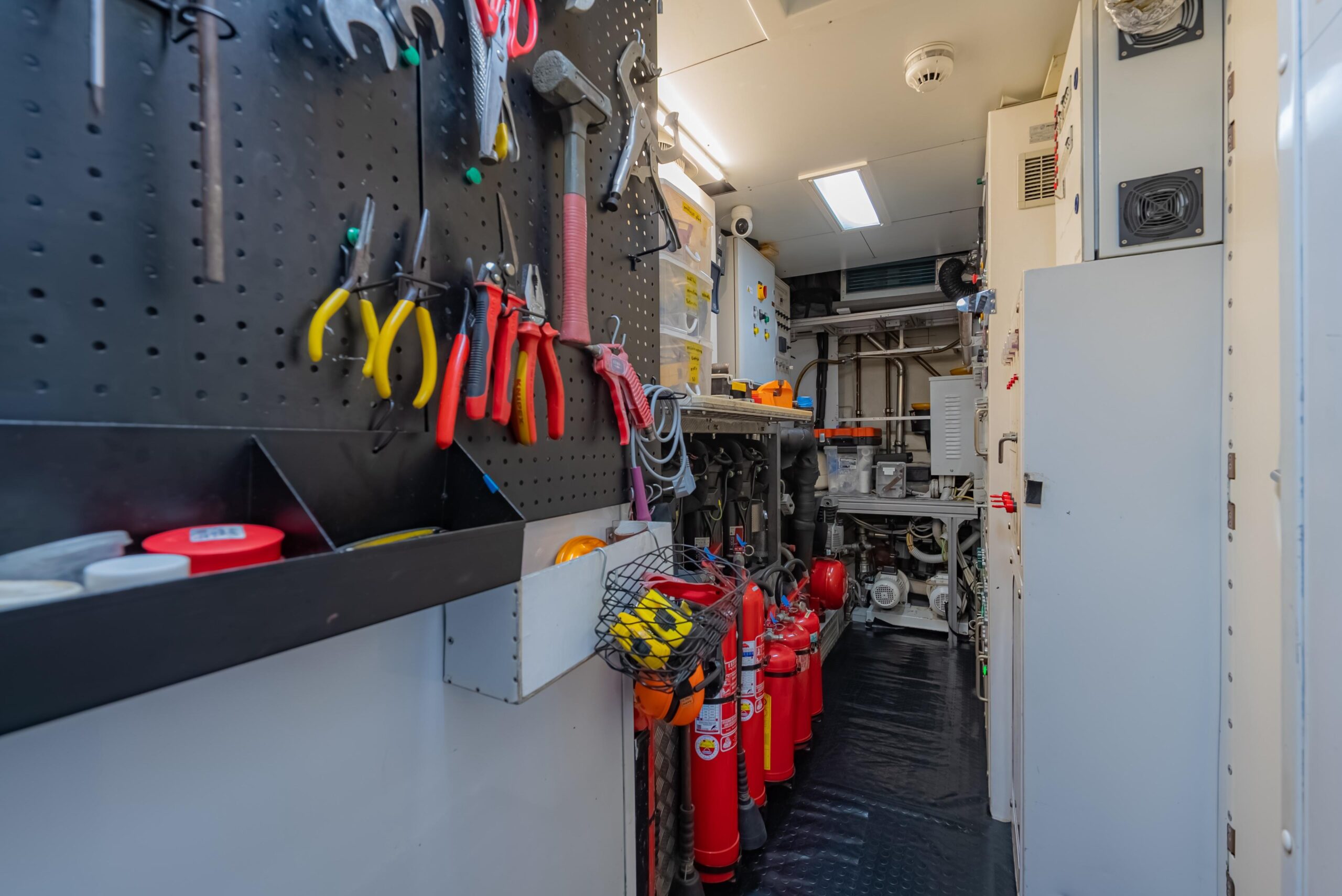 Большой кормовой ангар с откидным мостиком позволяет хранить 5-метровый тендер с собственной дизельной заправочной станцией. Также имеется второй ангар для водных игрушек и их спуска с помощью кран-балки. В этом пространстве могут разместиться 2 гидроцикла или аналогичная техника, а также другие игрушки и снаряжение.