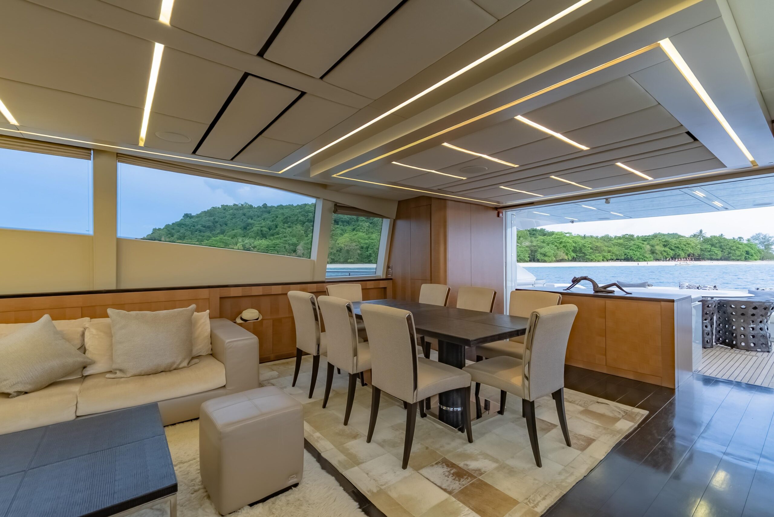 При входе в главный салон с кормы расположены обеденный стол с чёрной столешницей из кожи питона и большой диван, оба предмета выполнены на заказ Fendi Club House; напротив — тумба с телевизором 52", элегантный кофейный столик и два пуфа из кожи медового оттенка. Это великолепное пространство соединяется с зоной развлечений на кормовой палубе благодаря убираемой стеклянной кормовой перегородке.