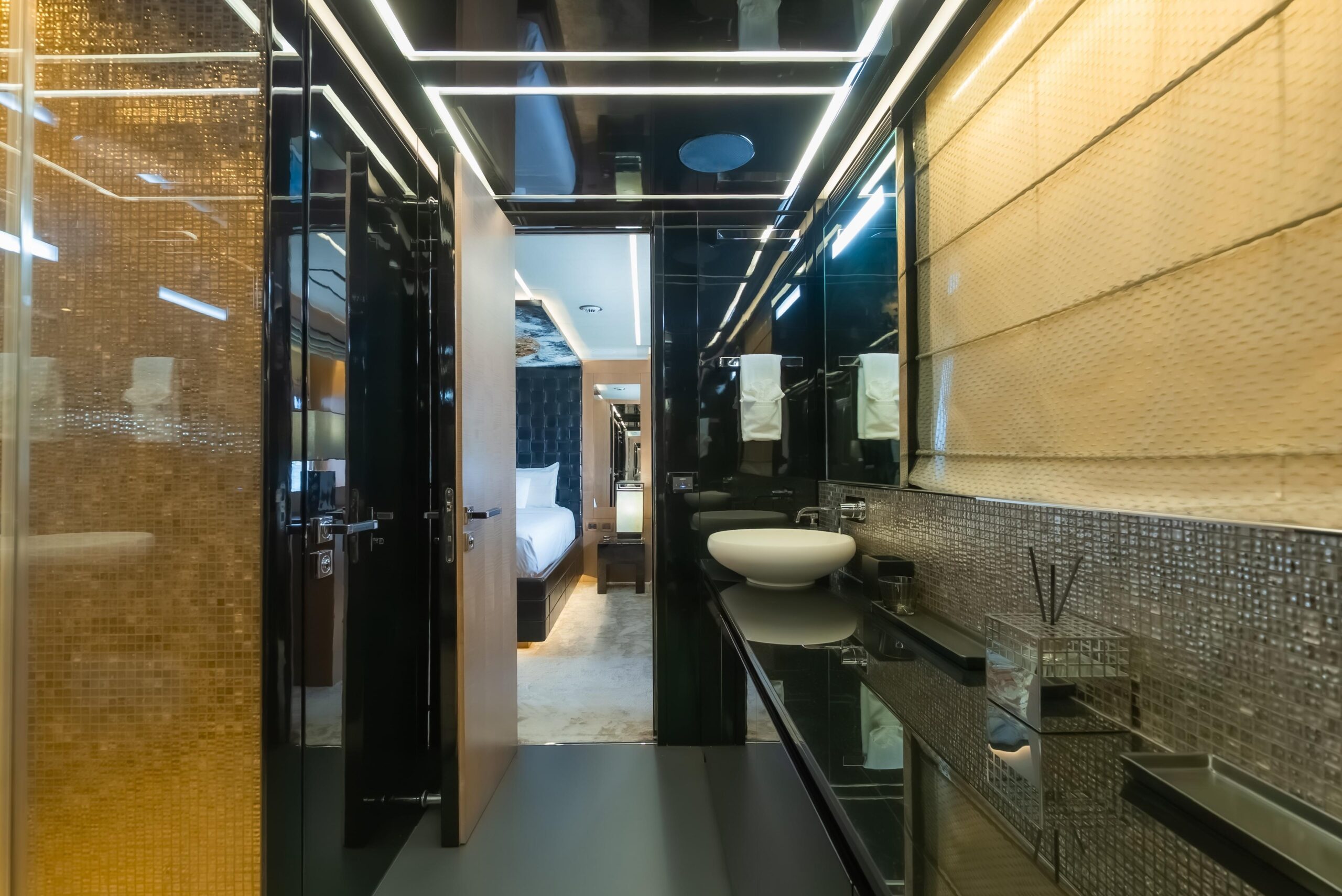 В носовой части расположена просторная, идеально правильной формы VIP-каюта с ванной комнатой, предлагающая широкое и удобное жилое пространство и достаточную высоту потолков, обеспечивая гостям высокий уровень комфорта.