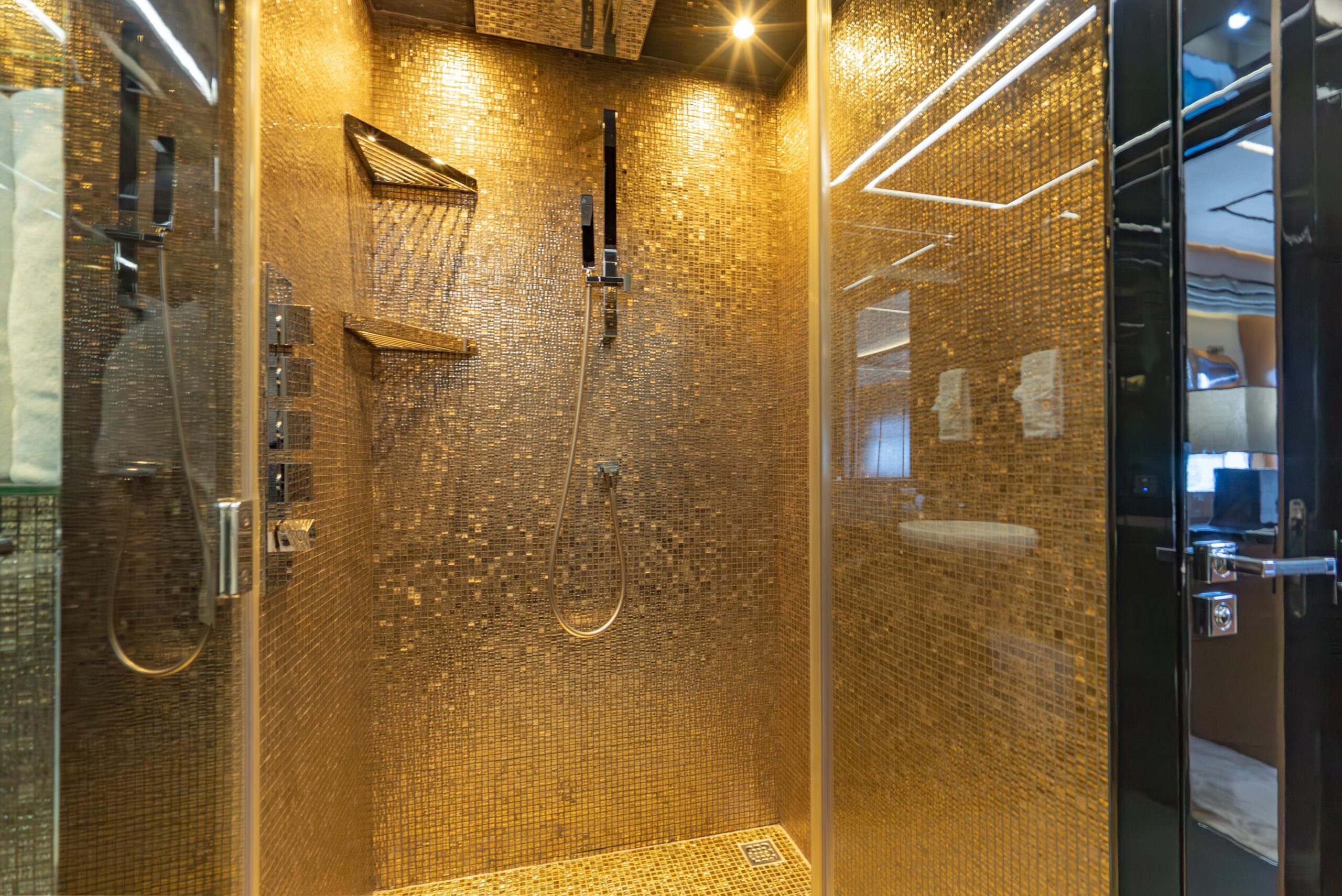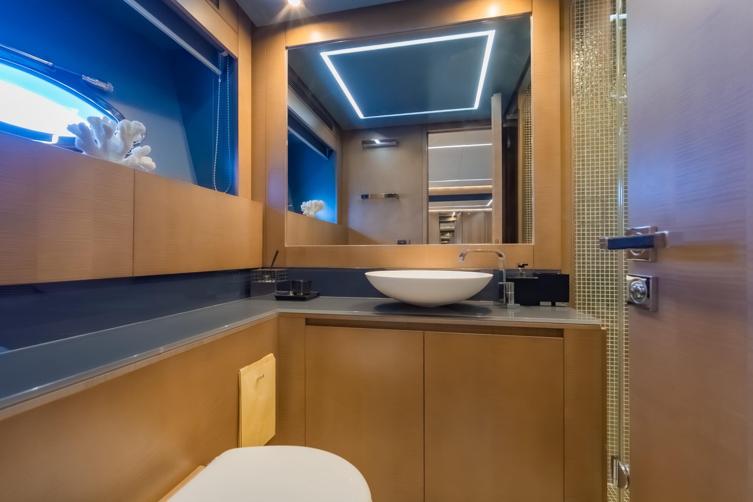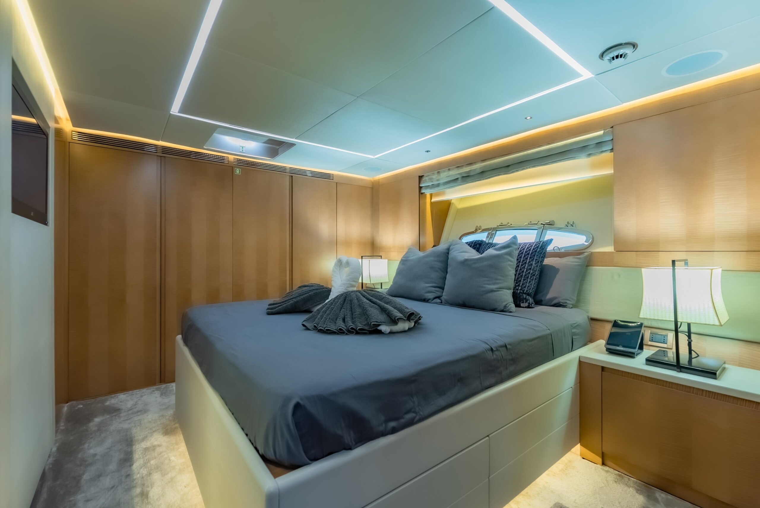 Главная особенность мастер-каюты на яхте — выразительная игра естественного света, поступающего через большие боковые окна. Световые эффекты и оттенки подчёркнуты чёрной кожей Fendi, украшающей столешницы мебели, изголовье и балдахин. В дополнение в каюте имеется ещё один диван-кровать с текстилем Armani Casa, разработанный Milano Bedding. Кроме того, в сьюте предусмотрены большой гардероб, полностью оборудованная рабочая зона, библиотека и холодильник.
