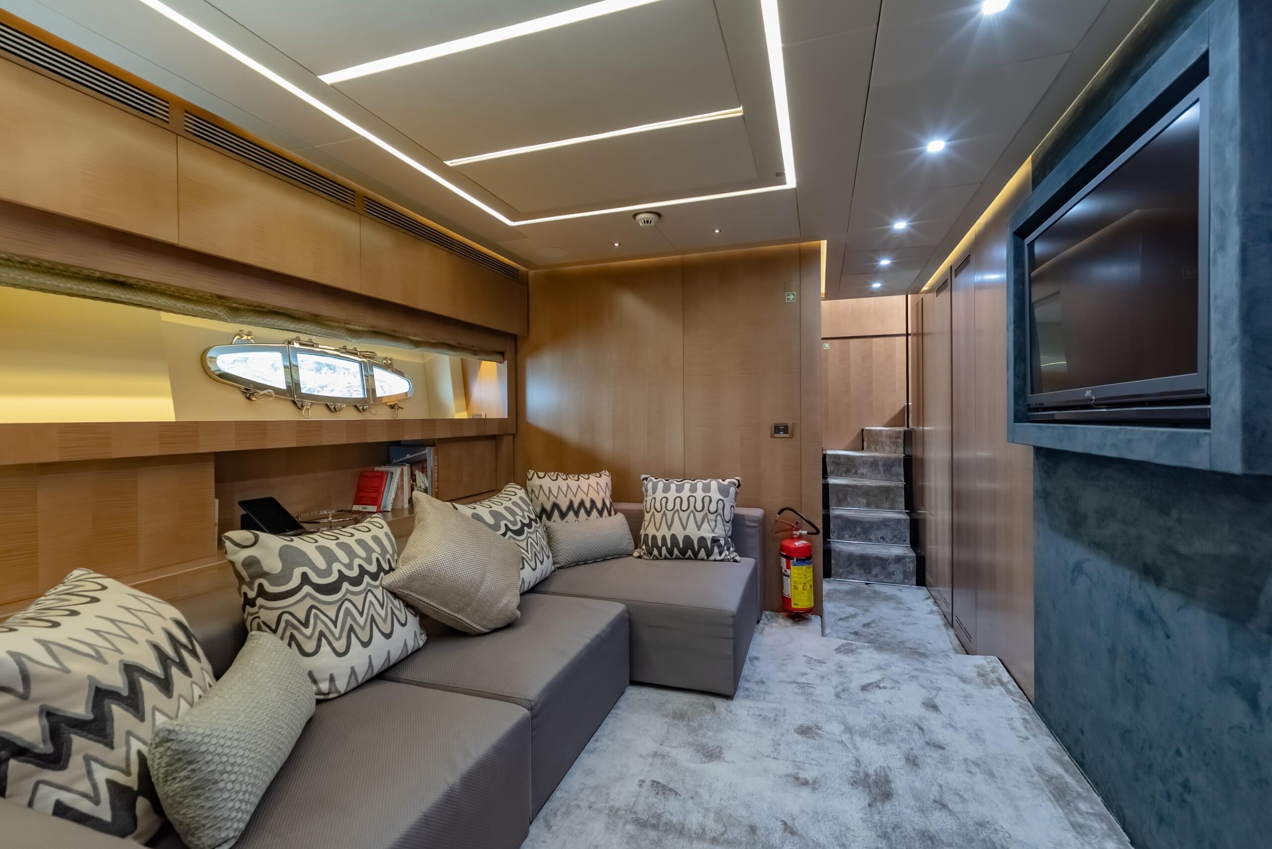 Вместо каюты по правому борту, предусмотренной в стандартной планировке P108', здесь расположена более практичная ТВ-комната, также известная как семейная комната, с большим удобным раскладным диваном-кроватью, выполненным на заказ в ткани из новой коллекции Armani Casa и размещённым напротив большого экрана телевизора.