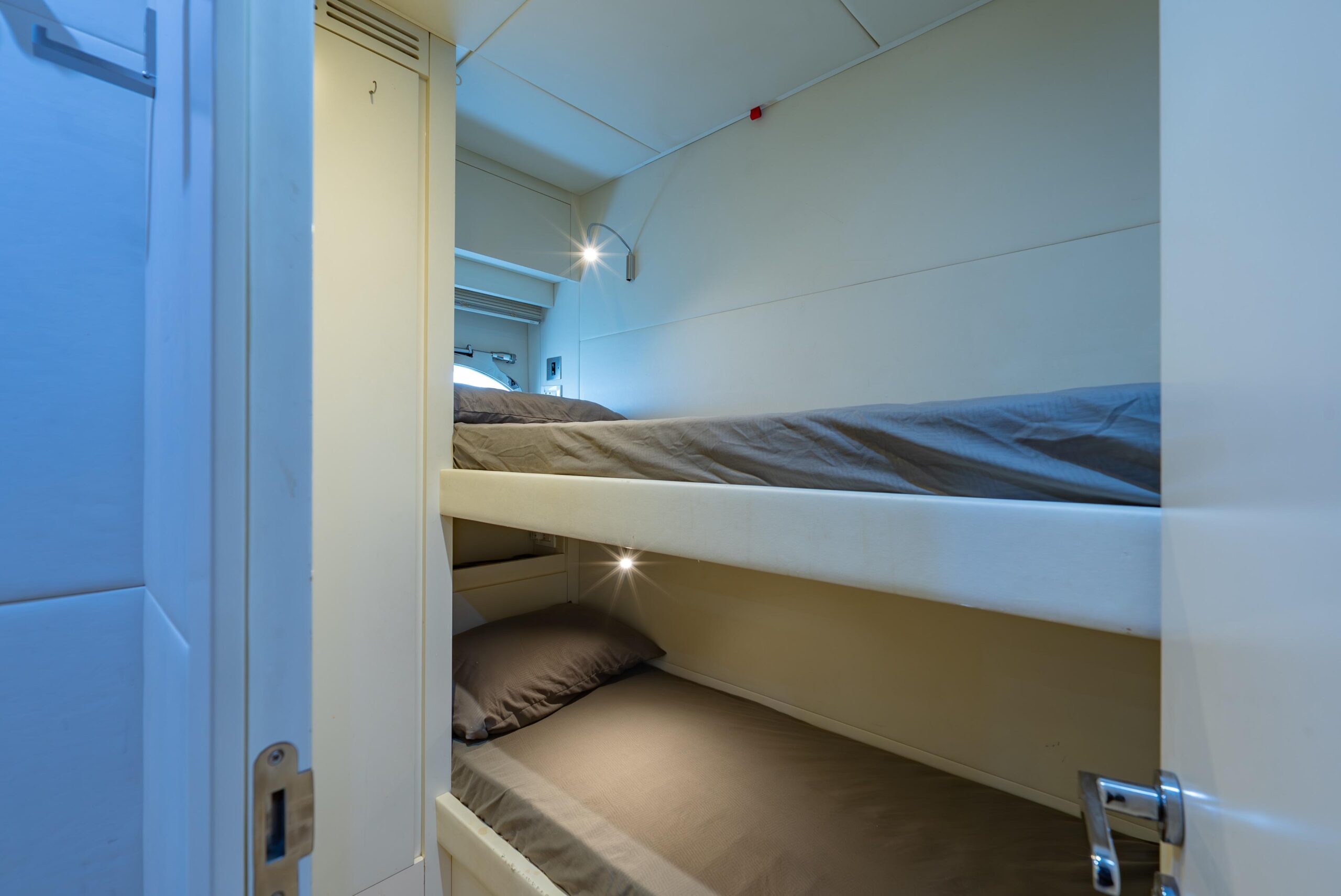 Гостевая каюта по левому борту с двумя односпальными кроватями и ванной комнатой — это большой шаг вперёд с точки зрения универсальности на борту. Кровати спроектированы таким образом, чтобы их можно было сдвинуть и сформировать двуспальную кровать king-size, либо использовать как две отдельные.