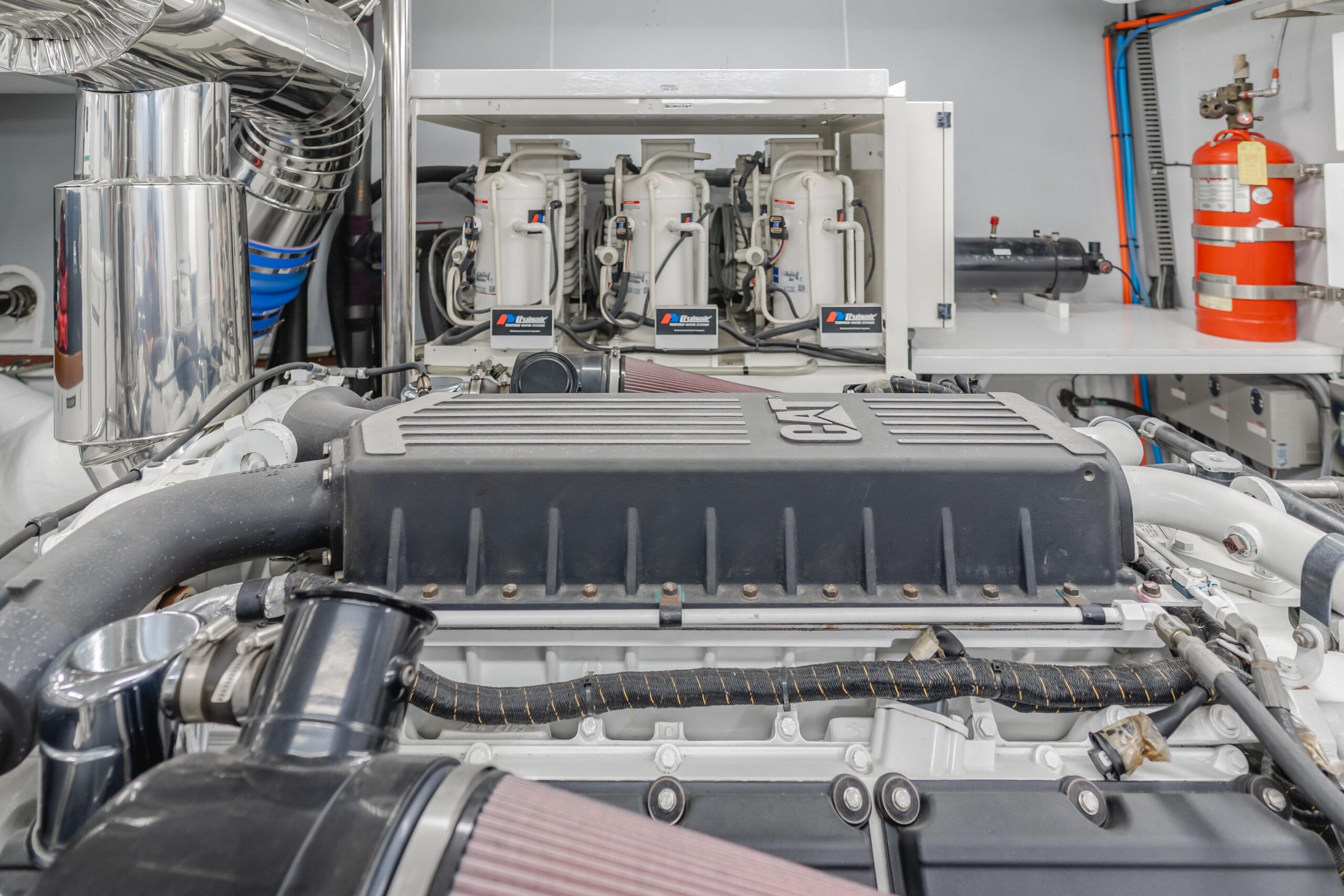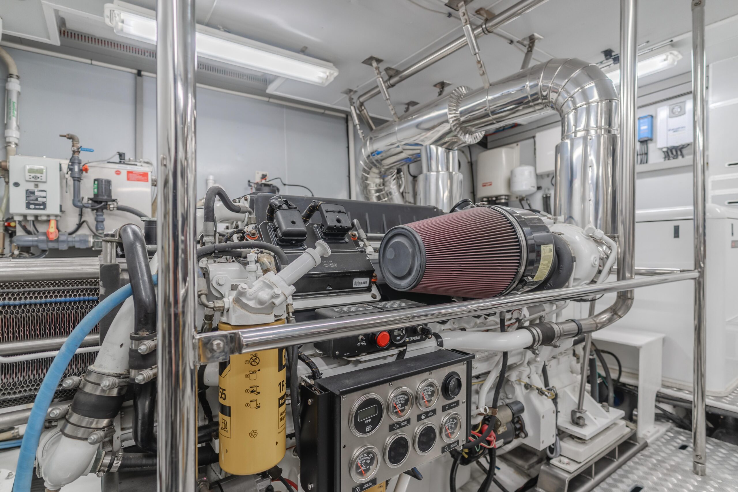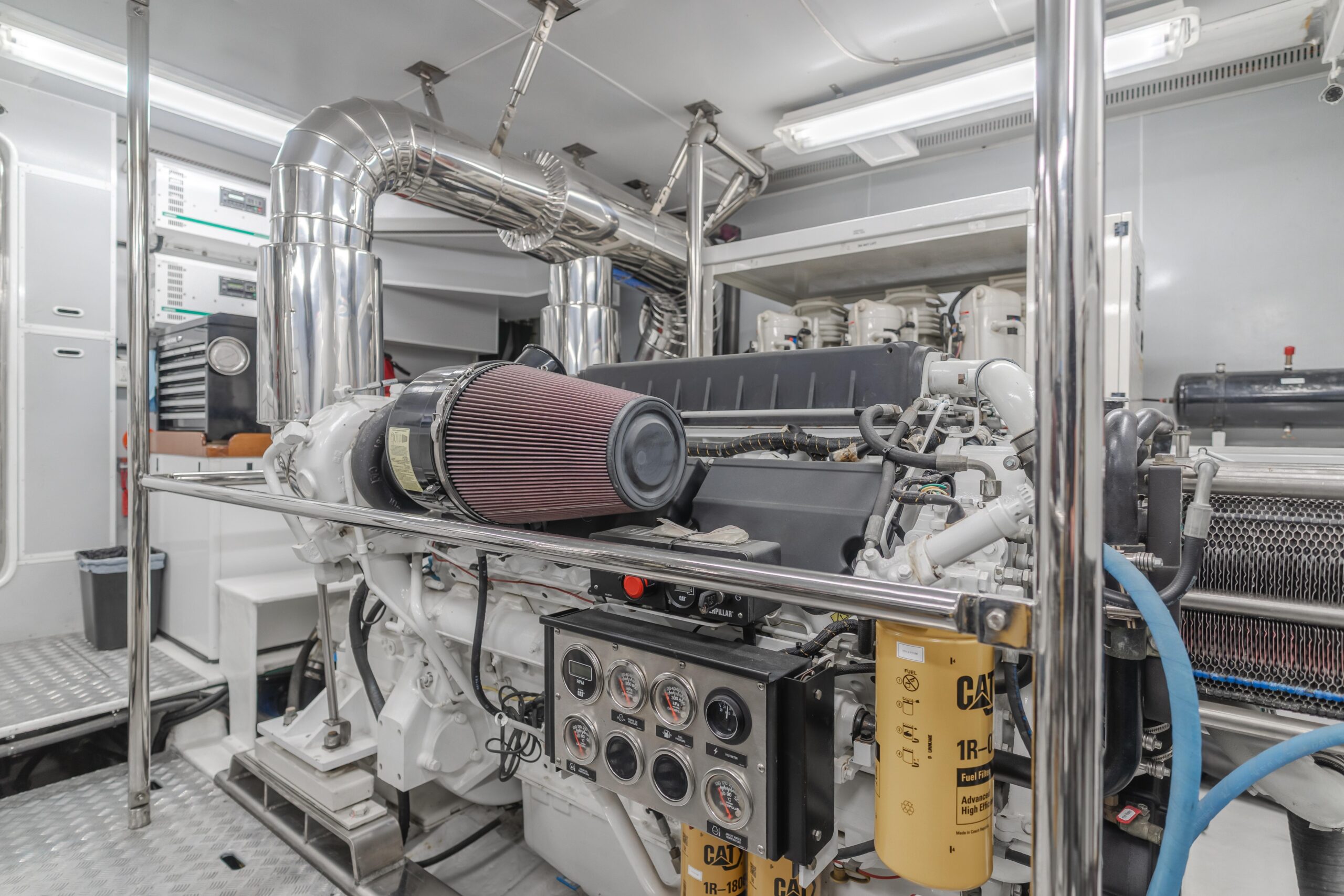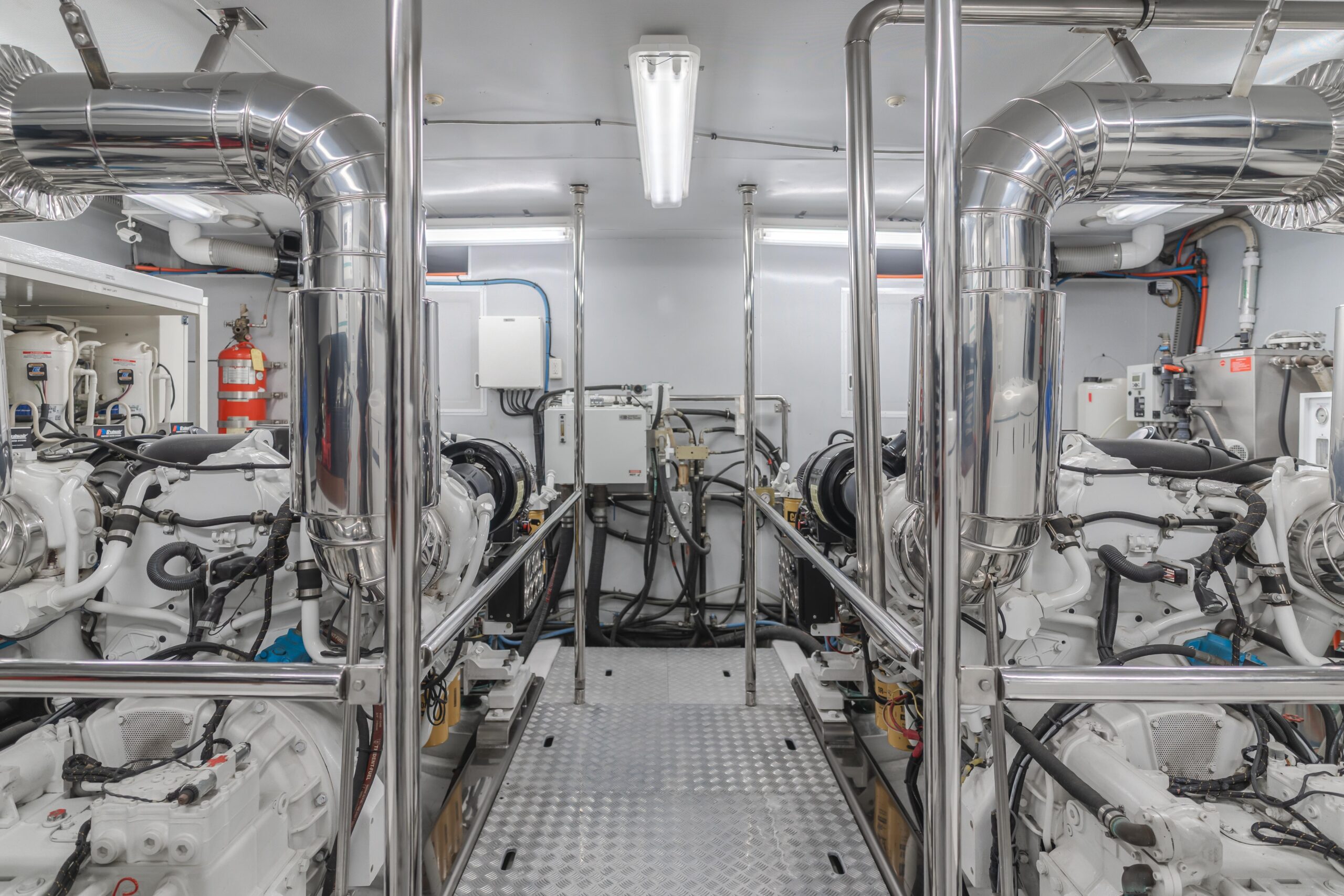 • Ходовые качества: Два двигателя Caterpillar C-32 Acert с наработкой всего 1,775 часов : крейсерская скорость 17 узлов, максимальная — 22 узла. Недавнее обслуживание включает новую противообрастающую окраску днища, сервис гидравлики и замену насосов пресной воды.