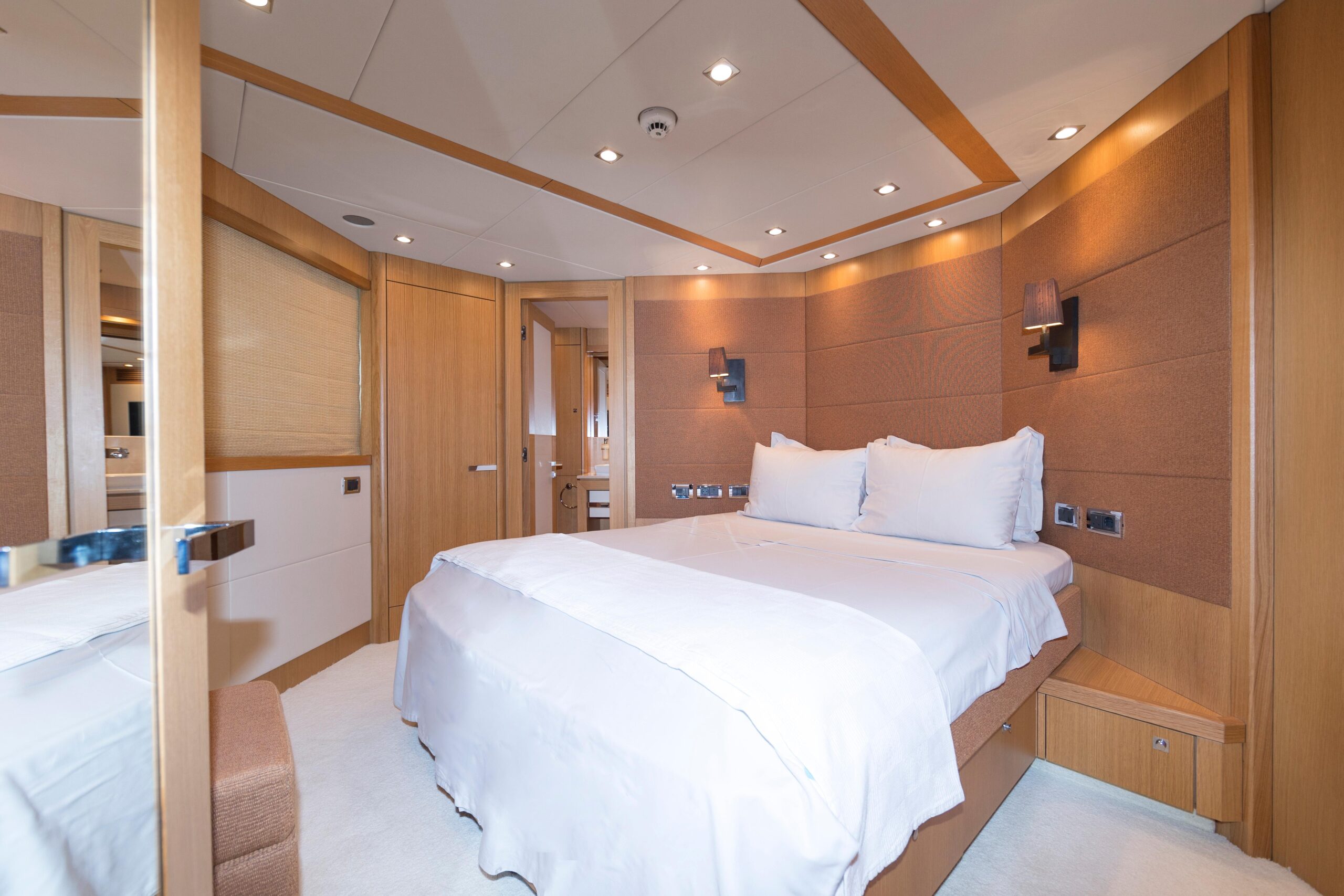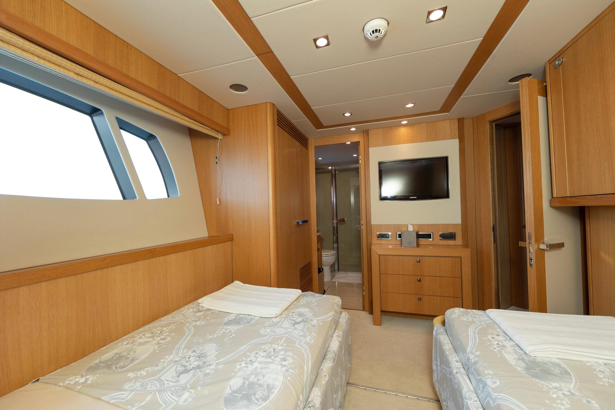 В отличие от стандартной модели Sunseeker 34M, данная яхта оснащена выдвижным балконом по правому борту, а гидравлическая купальная платформа увеличена, что позволяет перевозить тендер с подвесным двигателем мощностью 150 л.с. Каюты экипажа расположены в зоне гаража. Такая специальная планировка даёт мастер-каюте дополнительный уровень с расширенной ванной комнатой, максимально увеличивая пространство и приватность, что делает эту яхту по-настоящему уникальной суперъяхтой».