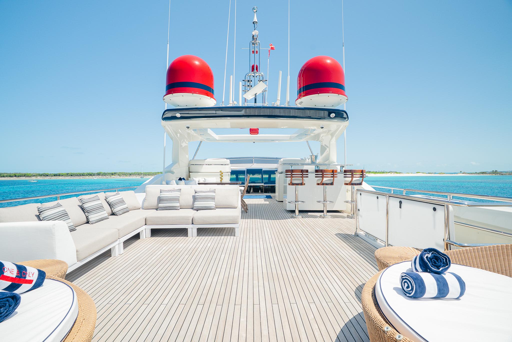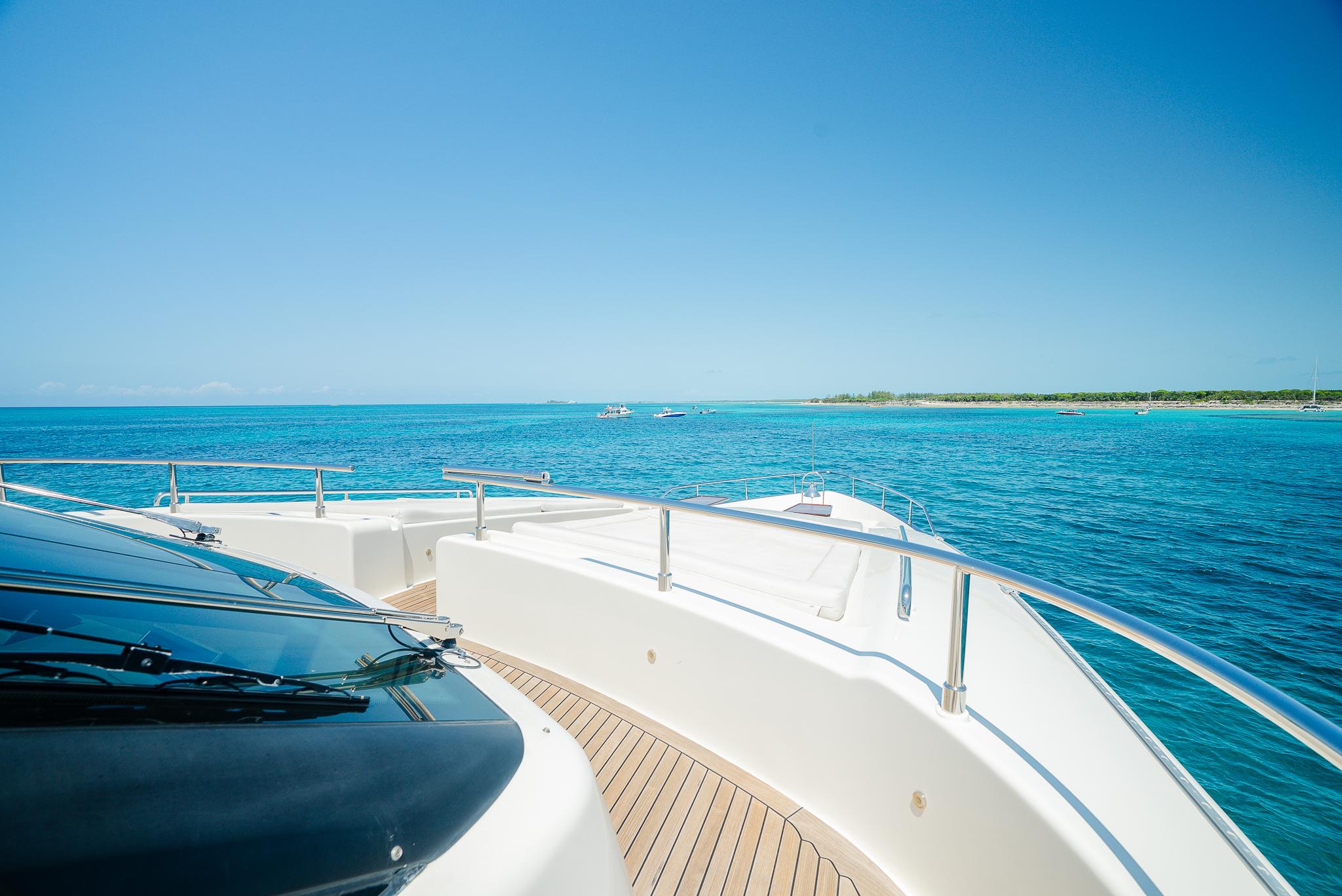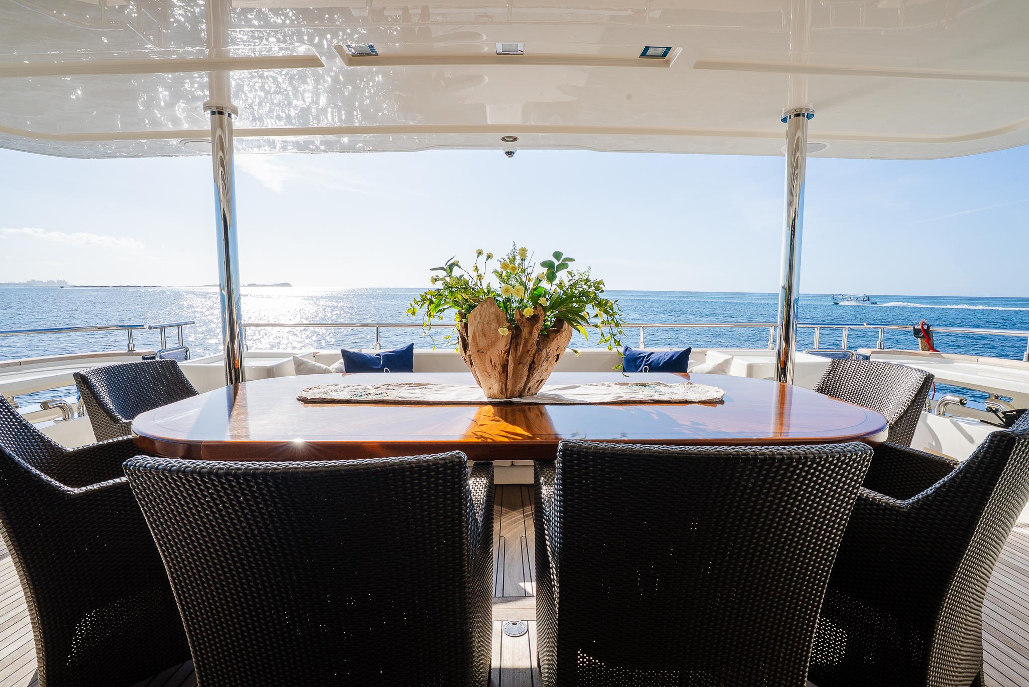 является одним из лучших предложений на рынке яхт с 5 каютами и мастер-каютой на главной палубе, доступных в настоящее время. Ширина корпуса 23 фута 8 дюймов придаёт этой 100-футовой яхте ощущение значительно большего объёма по сравнению с аналогичными по размеру судами. Большие окна как на главной палубе, так и в каждой каюте нижней палубы наполняют интерьеры естественным светом, усиливая ощущение пространства. Все обновления выполнялись регулярно для последнего владельца, который никогда не экономил на обслуживании судна. Совсем недавно, в 2025 году, были полностью перебраны и обнулены оба генератора Kohler мощностью по 50 кВт, заменено ковровое покрытие по всей яхте и уложен паркет на главной палубе. Тиковые палубы на купальной платформе были обновлены, корпус перекрашен в 2023 году. Внешняя обивка также была заменена в течение последних нескольких лет.