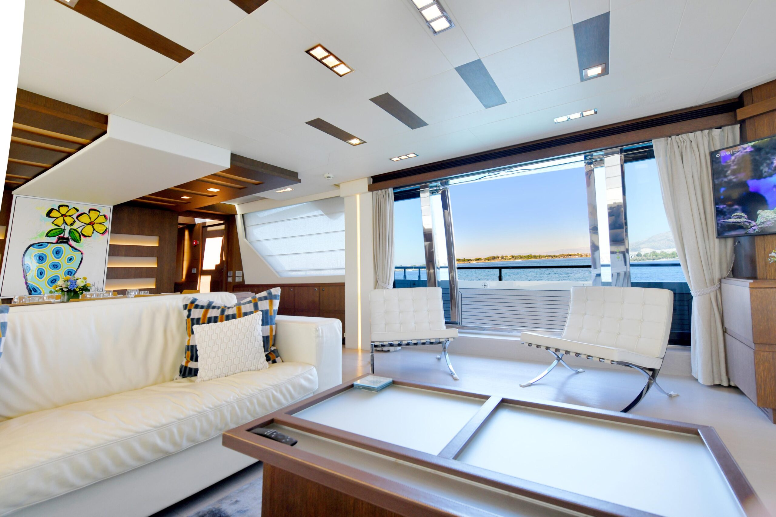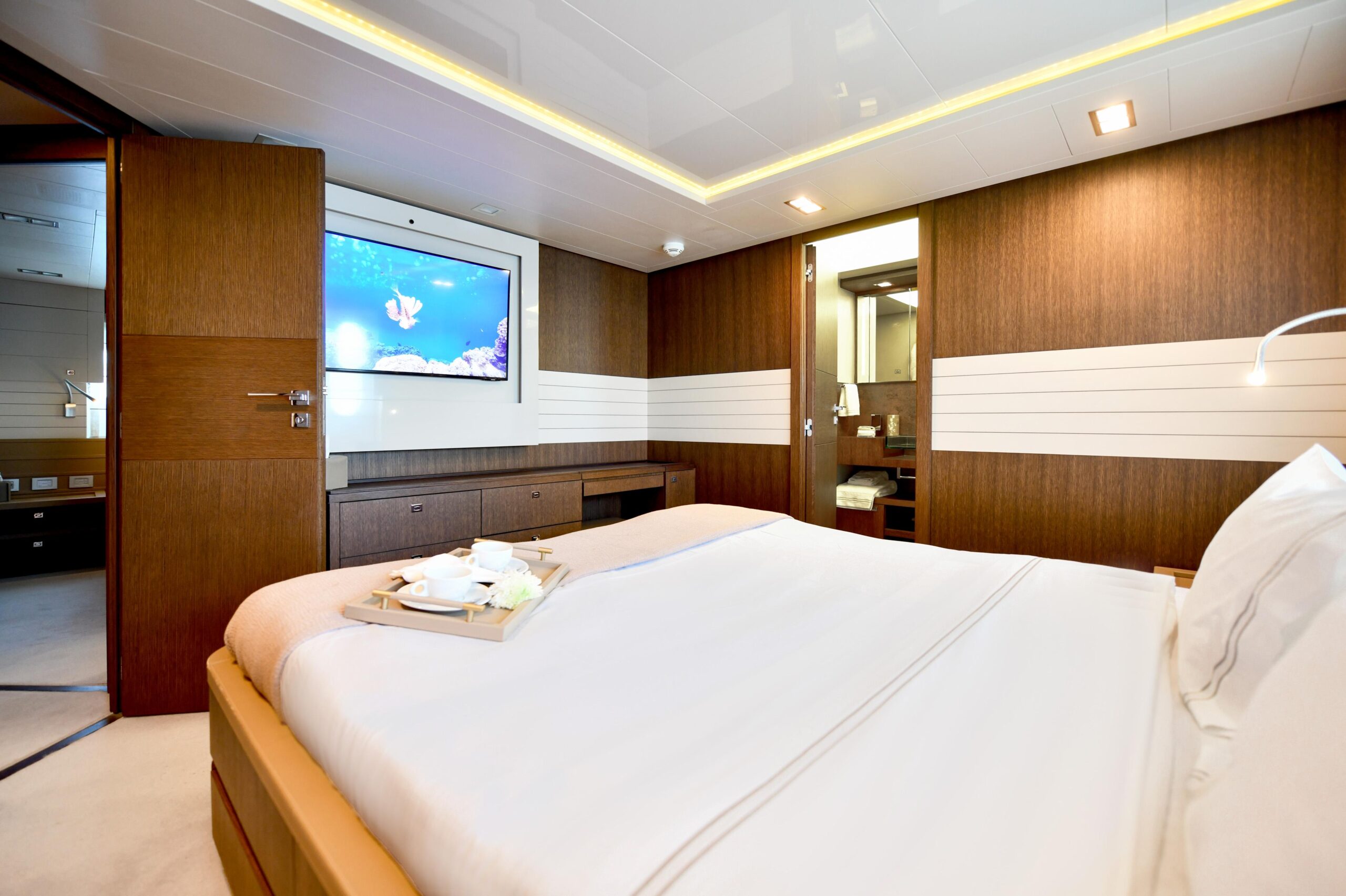 The full-beam, on-deck owner's suite offers panoramic views and natural light via its top to bottom windows.