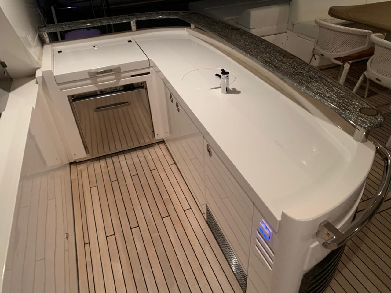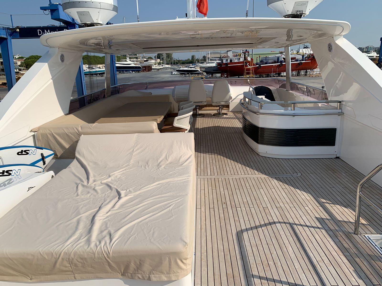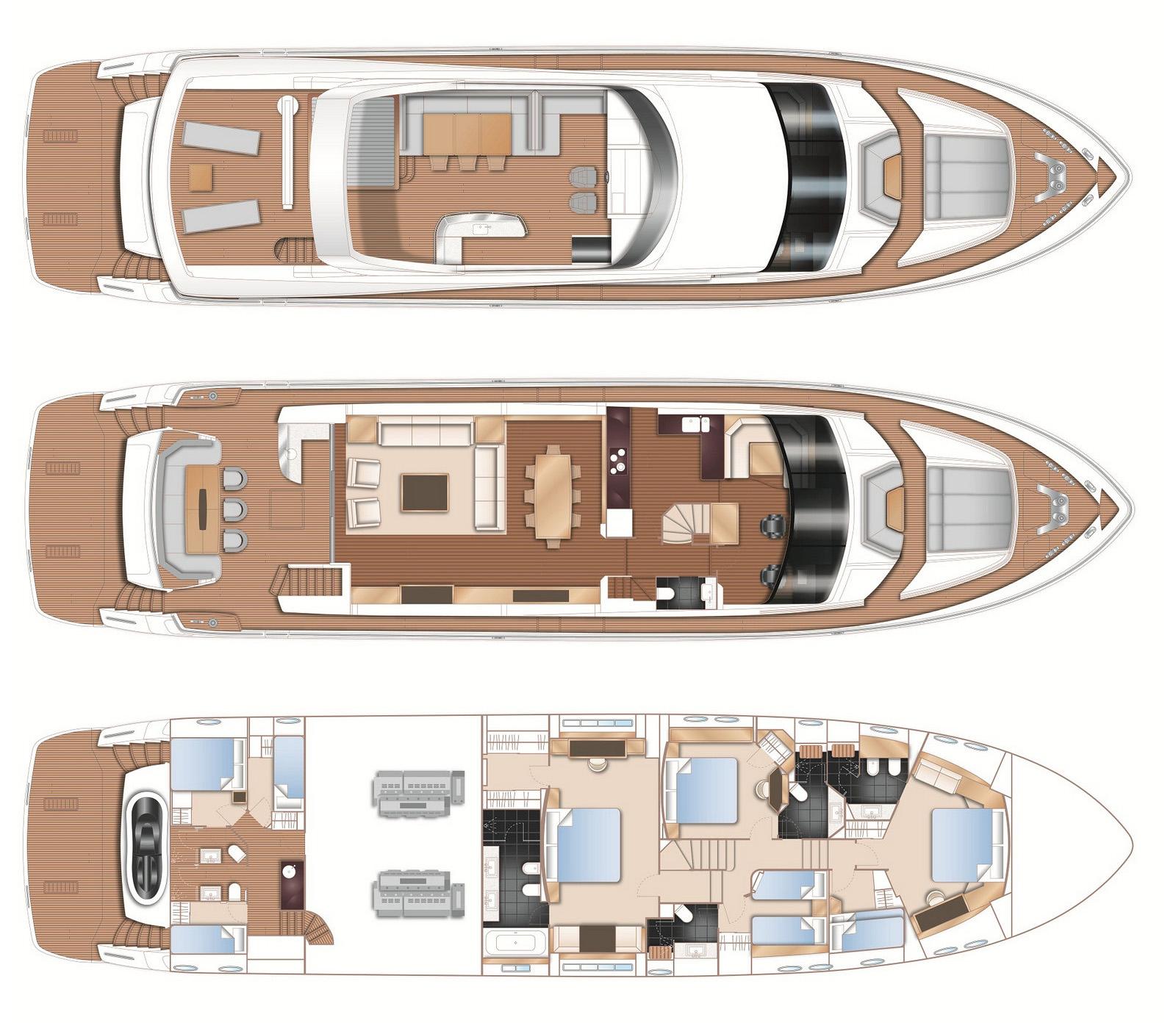 Тиковые палубы уложены в кокпите, на бортовых проходах и на флайбридже. Планировка с круговым проходом включает носовую зону отдыха с кофейным столиком и зоной для загара. Душ на флайбридже с горячей и холодной водой. Дистанционно управляемый трап и гидравлическая купальная платформа. Большой кормовой гараж вмещает трёхместный гидроцикл. Кран на флайбридже грузоподъёмностью 1200 кг. Тиковый кокпит с барной зоной и мягкими сиденьями.