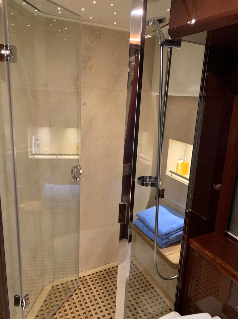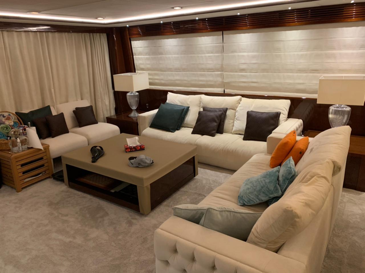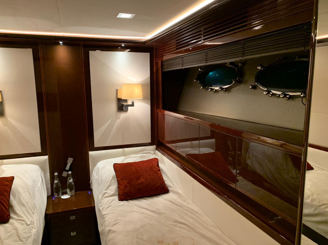 Размещение до 10 гостей в 5 каютах с собственными ванными комнатами. Интерьер включает мебель Fendi, LED-телевизоры и качественную AV-систему во всех каютах. Камбуз оборудован большим холодильником/морозильником с льдогенератором, посудомоечной машиной, духовкой и встроенной кофемашиной. В салоне — холодильник, винный шкаф и подъёмно-опускающийся телевизор с системой объёмного звучания. Размещение экипажа не указано.
