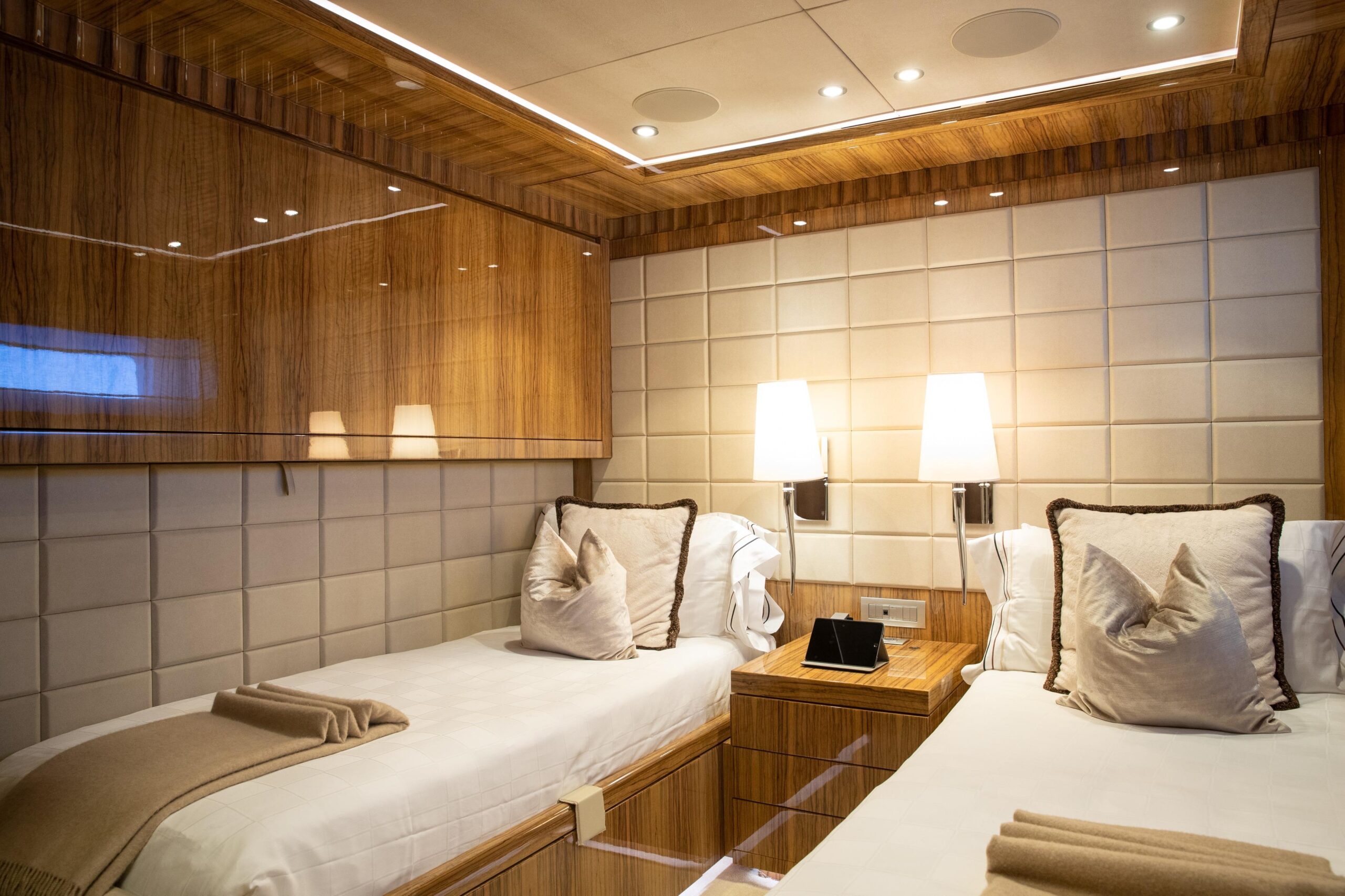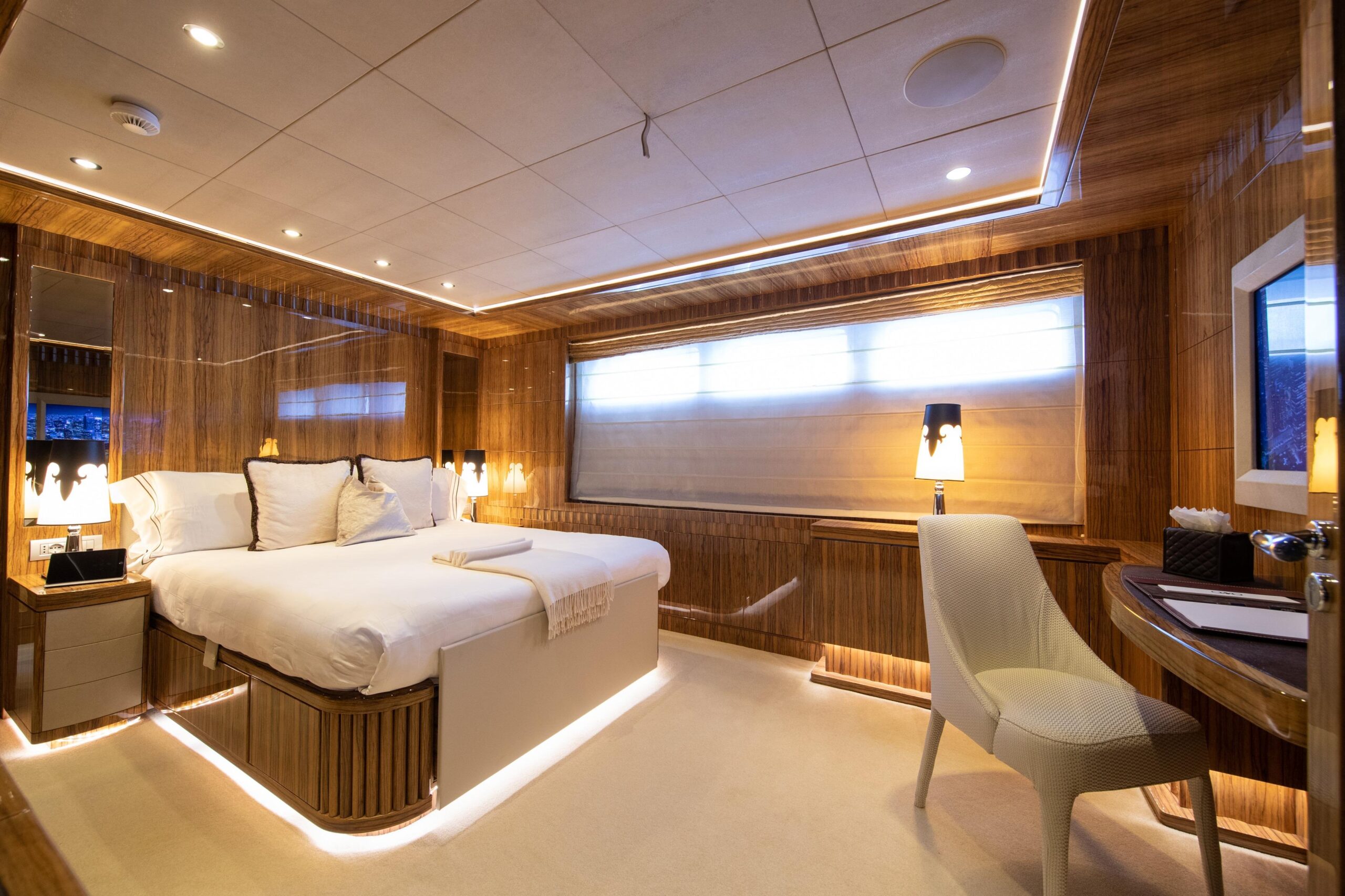 OKKO размещает до 12 гостей в пяти каютах с собственными ванными комнатами, включая просторную каюту владельца на главной палубе. Планировка обеспечивает максимальную приватность и комфорт, а команда из семи человек гарантирует исключительный сервис на борту. Оснащённая стабилизаторами как на ходу, так и на якоре, яхта обеспечивает плавный и устойчивый ход, дополнительно выигрывая за счёт низкого расхода топлива, что делает её экономичной и экологически ответственной.