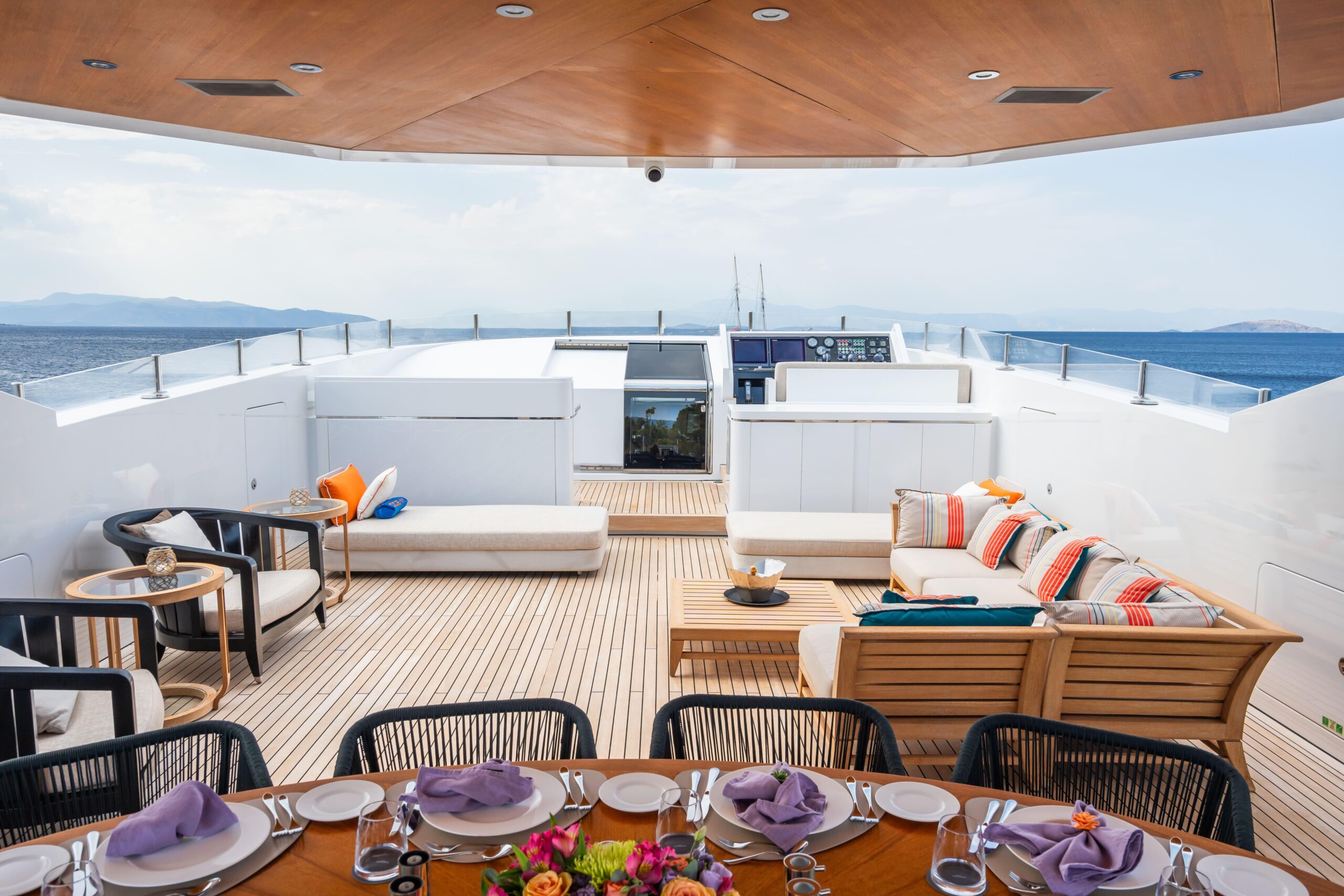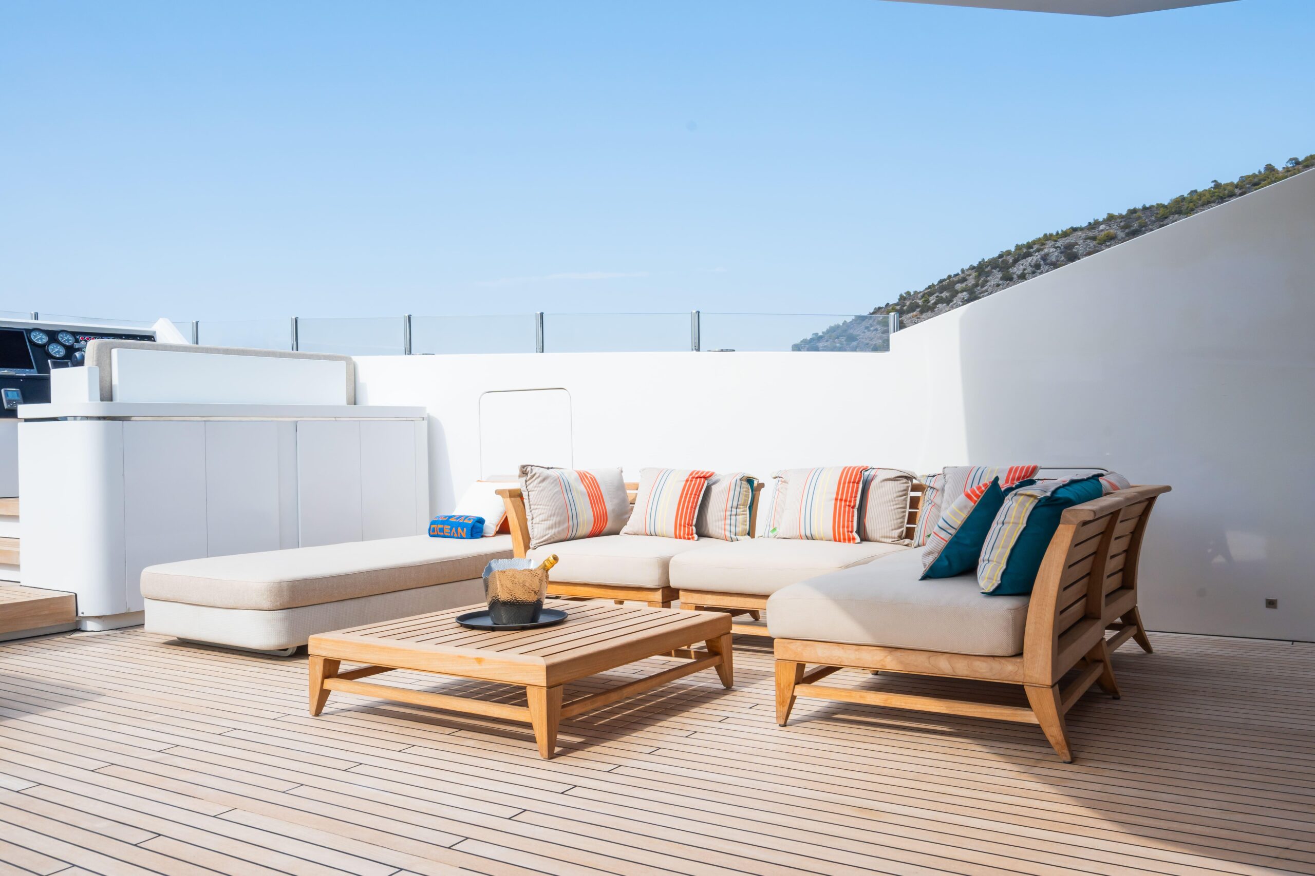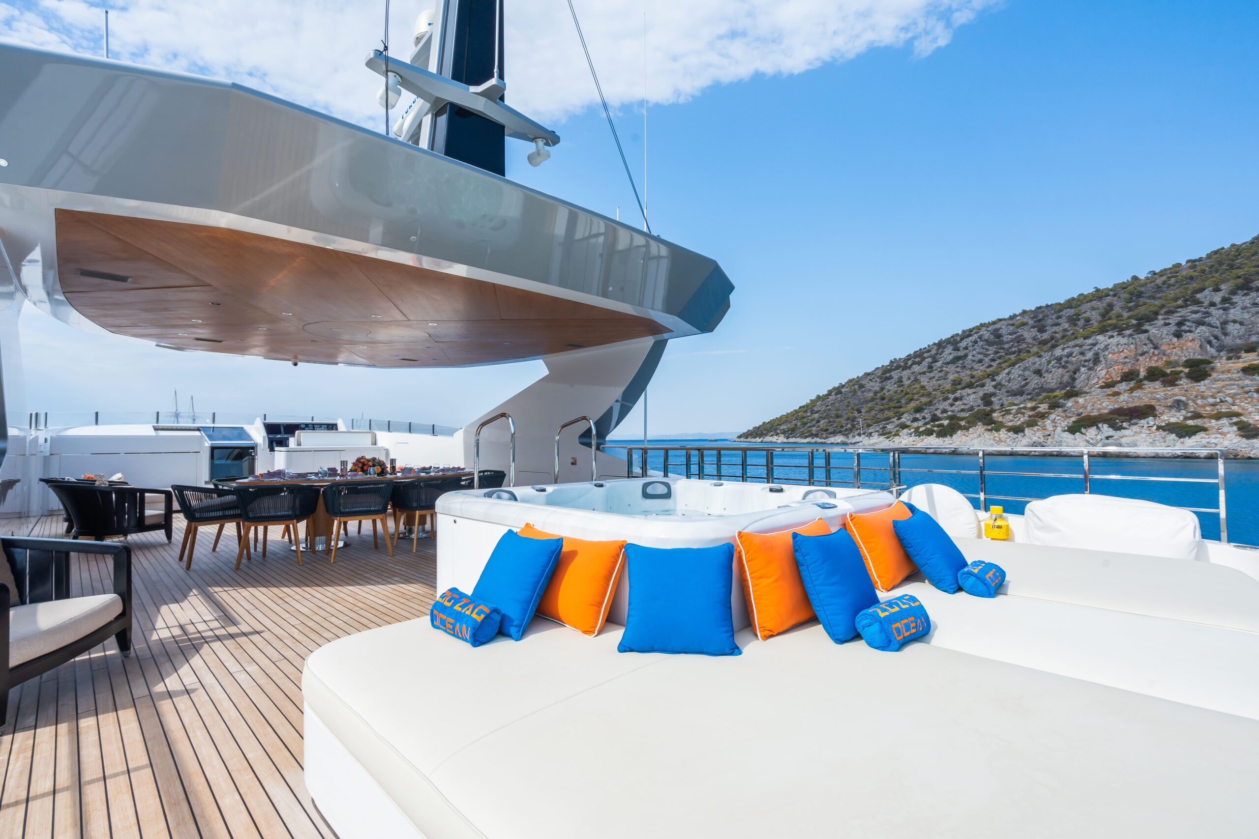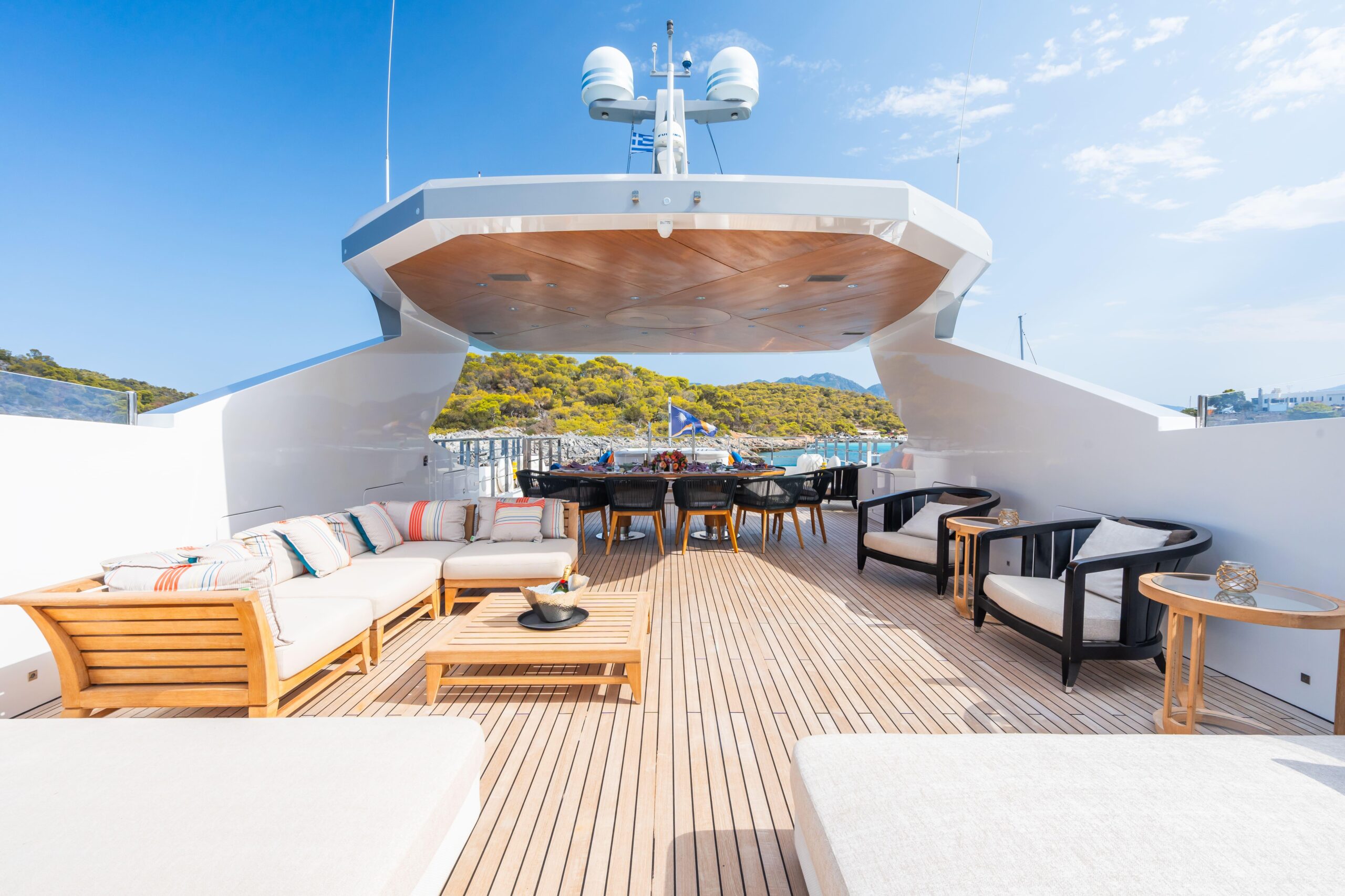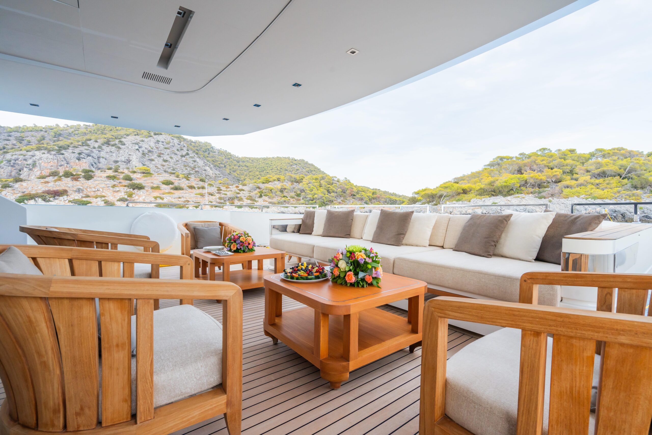 Универсальное пространство для развлечений: солнечная палуба представляет собой обширную зону, идеально подходящую для проведения крупных мероприятий и вечеринок, с возможностью размещения до 30 гостей. Это идеальное место для общения, праздников и наслаждения панорамными морскими видами. Роскошные зоны для загара: носовая зона для загара комфортно вмещает до 8 гостей, предлагая спокойное место для отдыха.