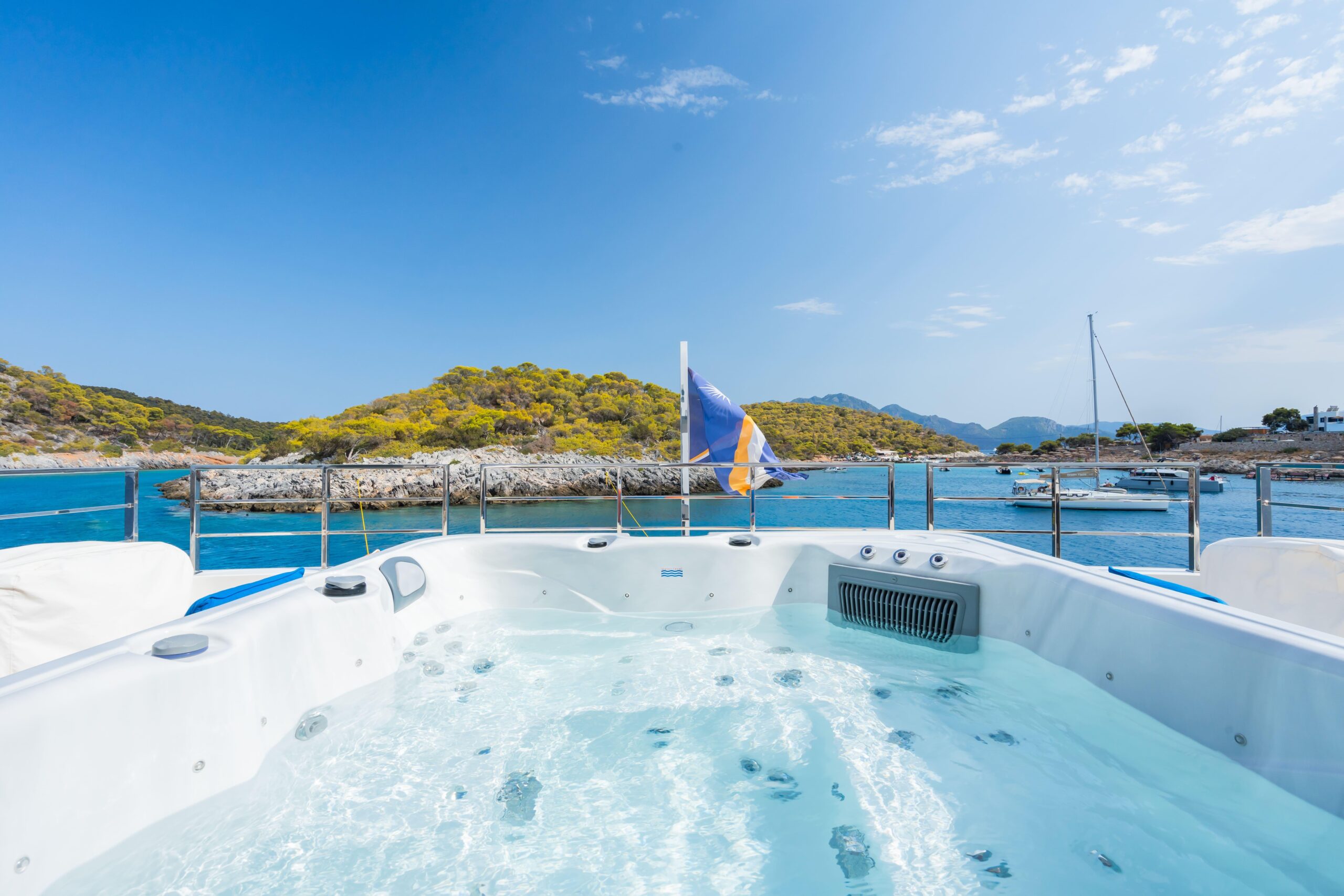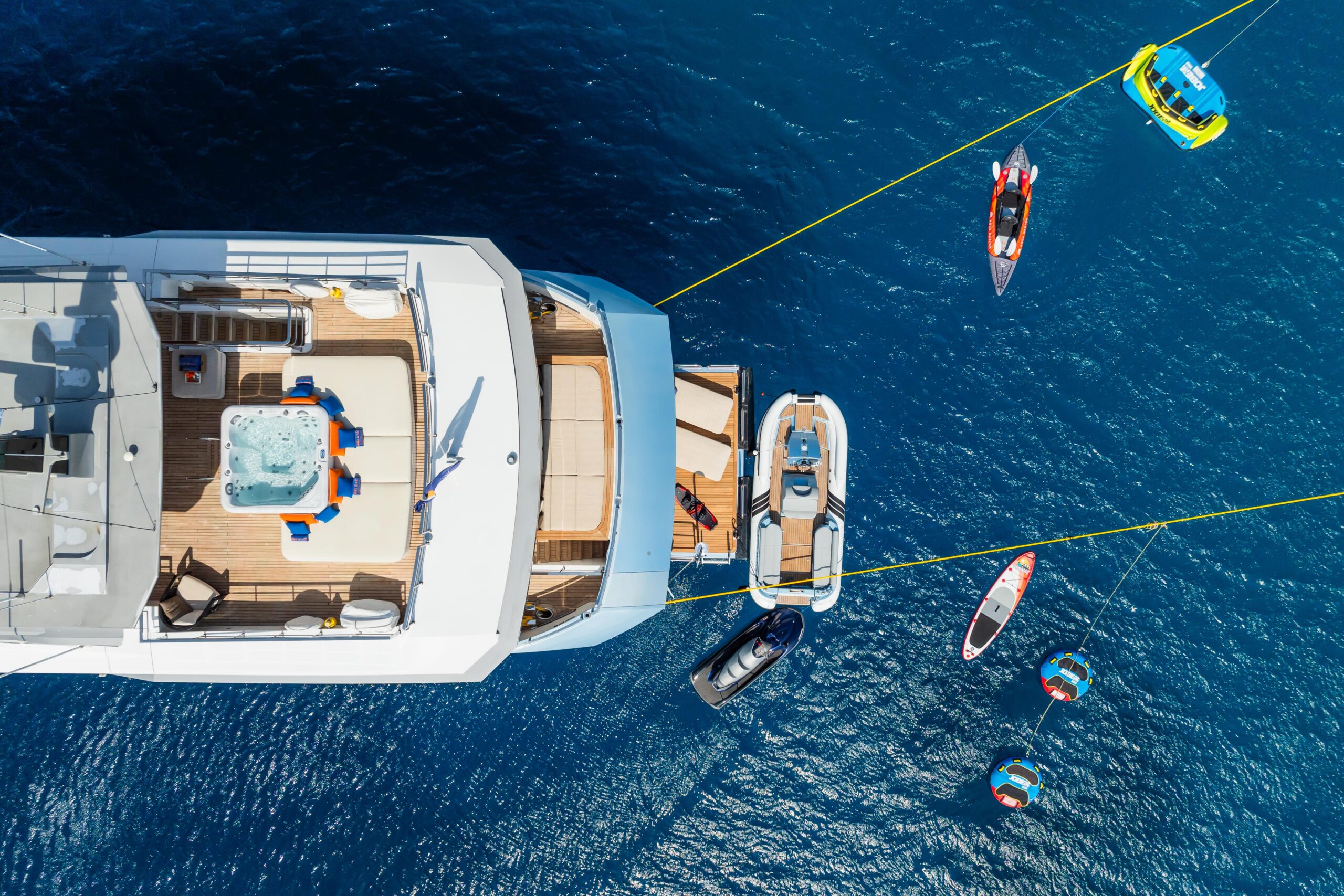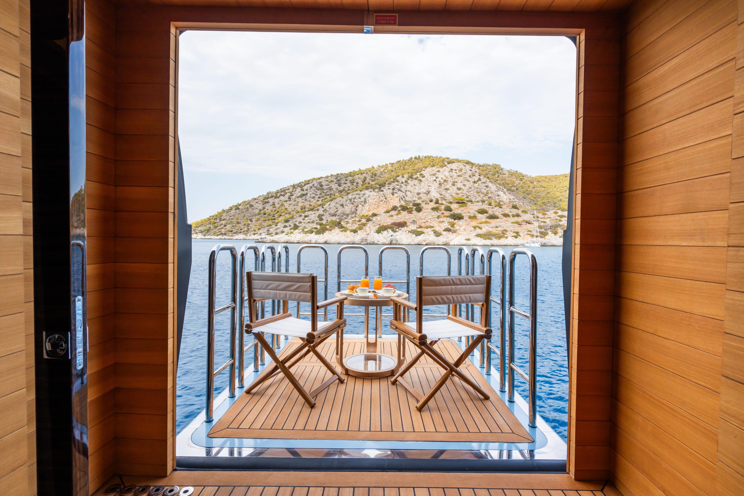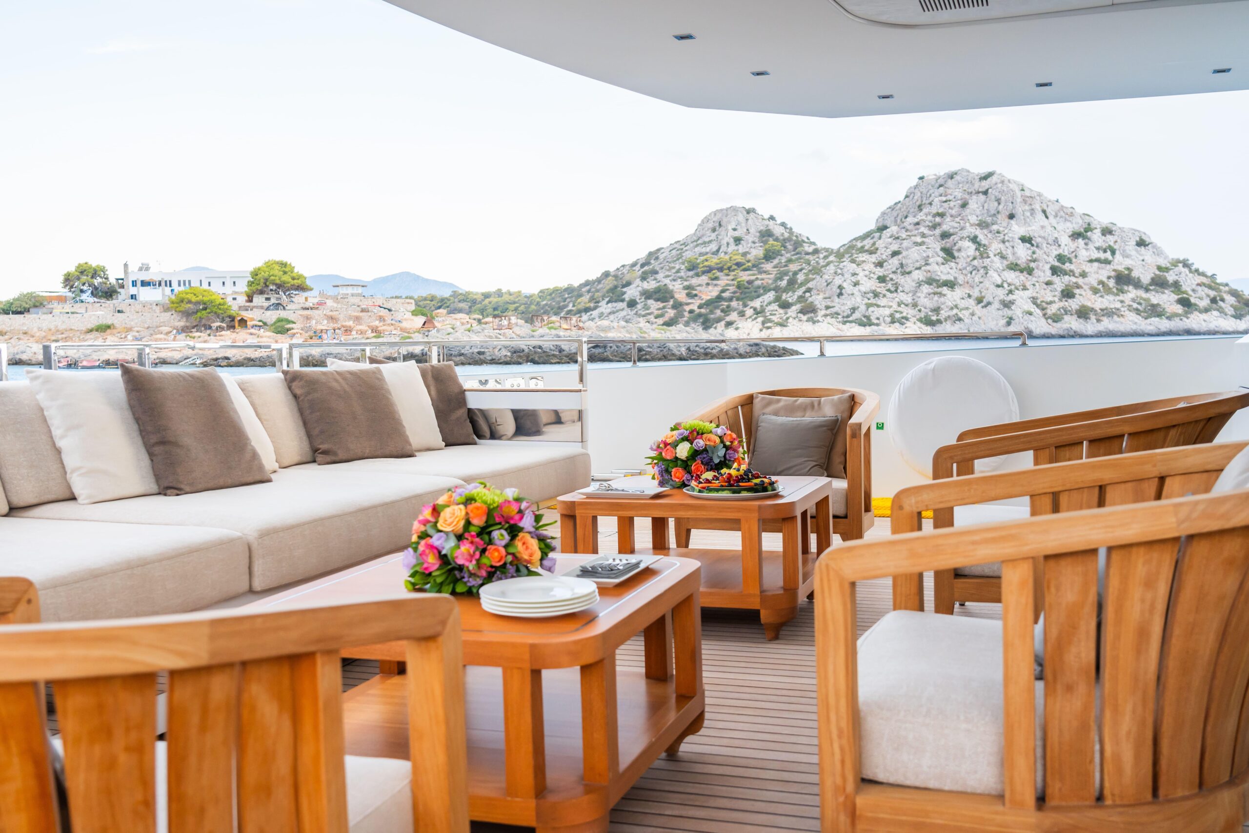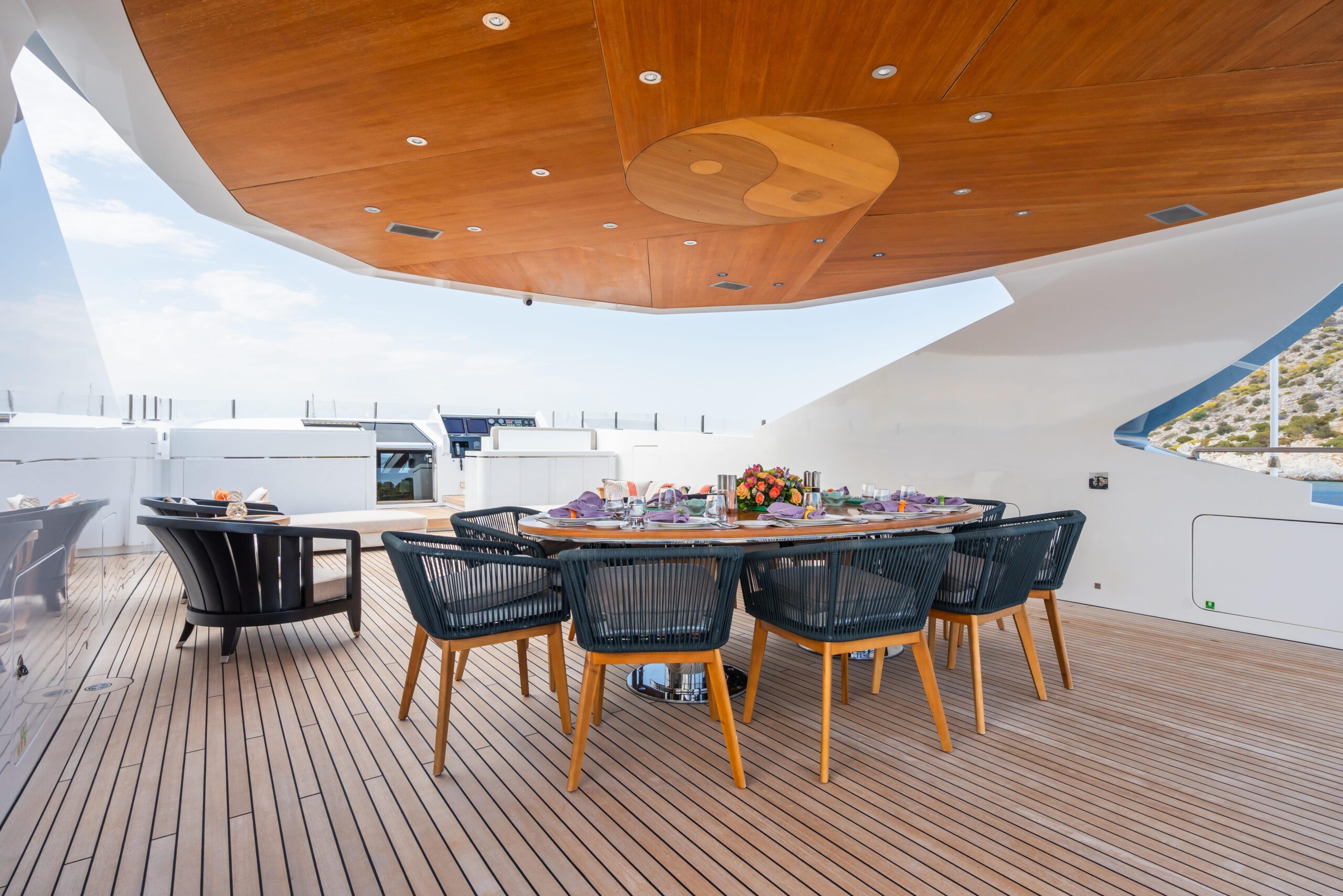 Универсальное пространство для развлечений: солнечная палуба представляет собой обширную зону, идеально подходящую для проведения крупных мероприятий и вечеринок, с возможностью размещения до 30 гостей. Это идеальное место для общения, праздников и наслаждения панорамными морскими видами. Роскошные зоны для загара: носовая зона для загара комфортно вмещает до 8 гостей, предлагая спокойное место для отдыха.