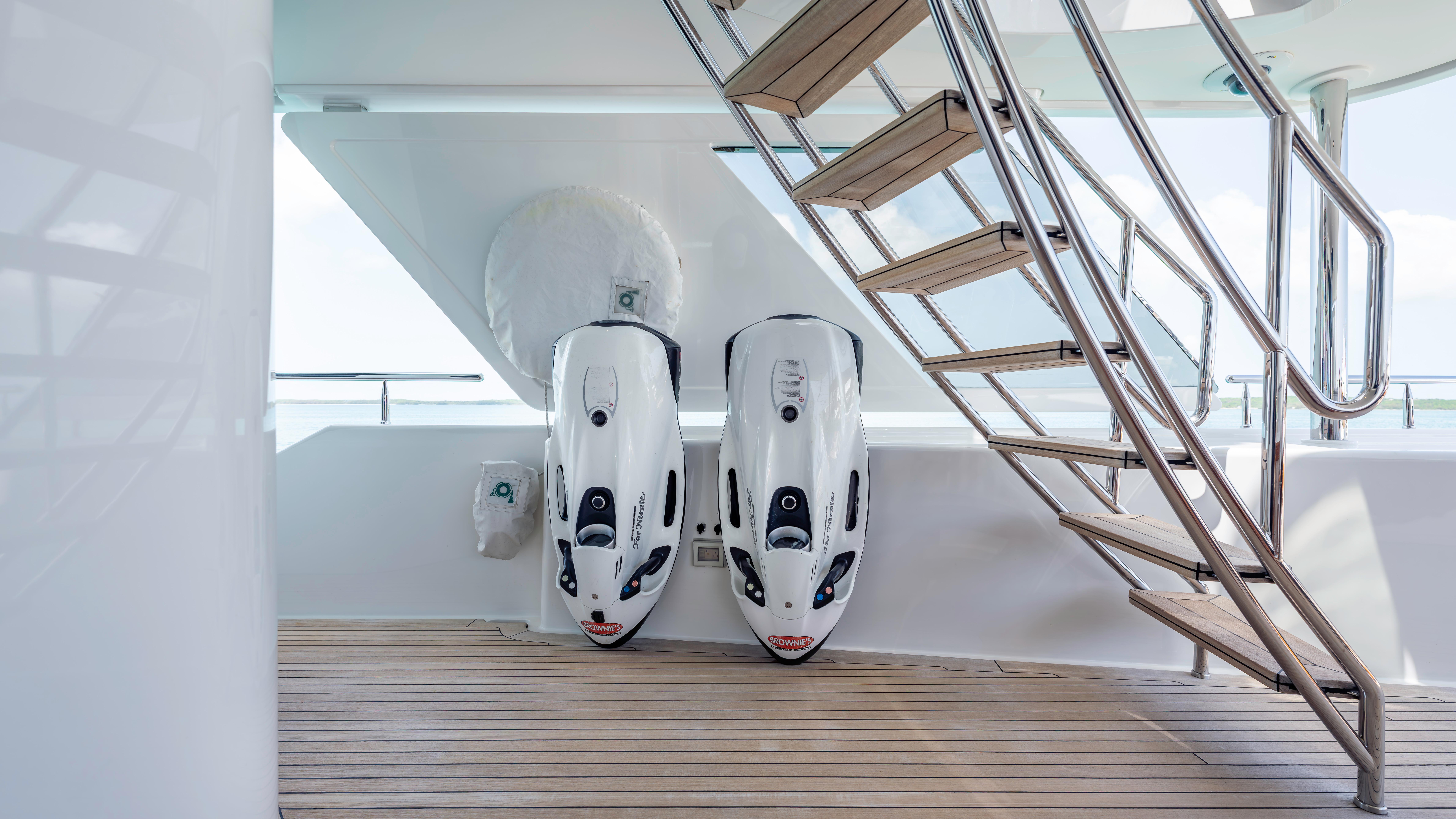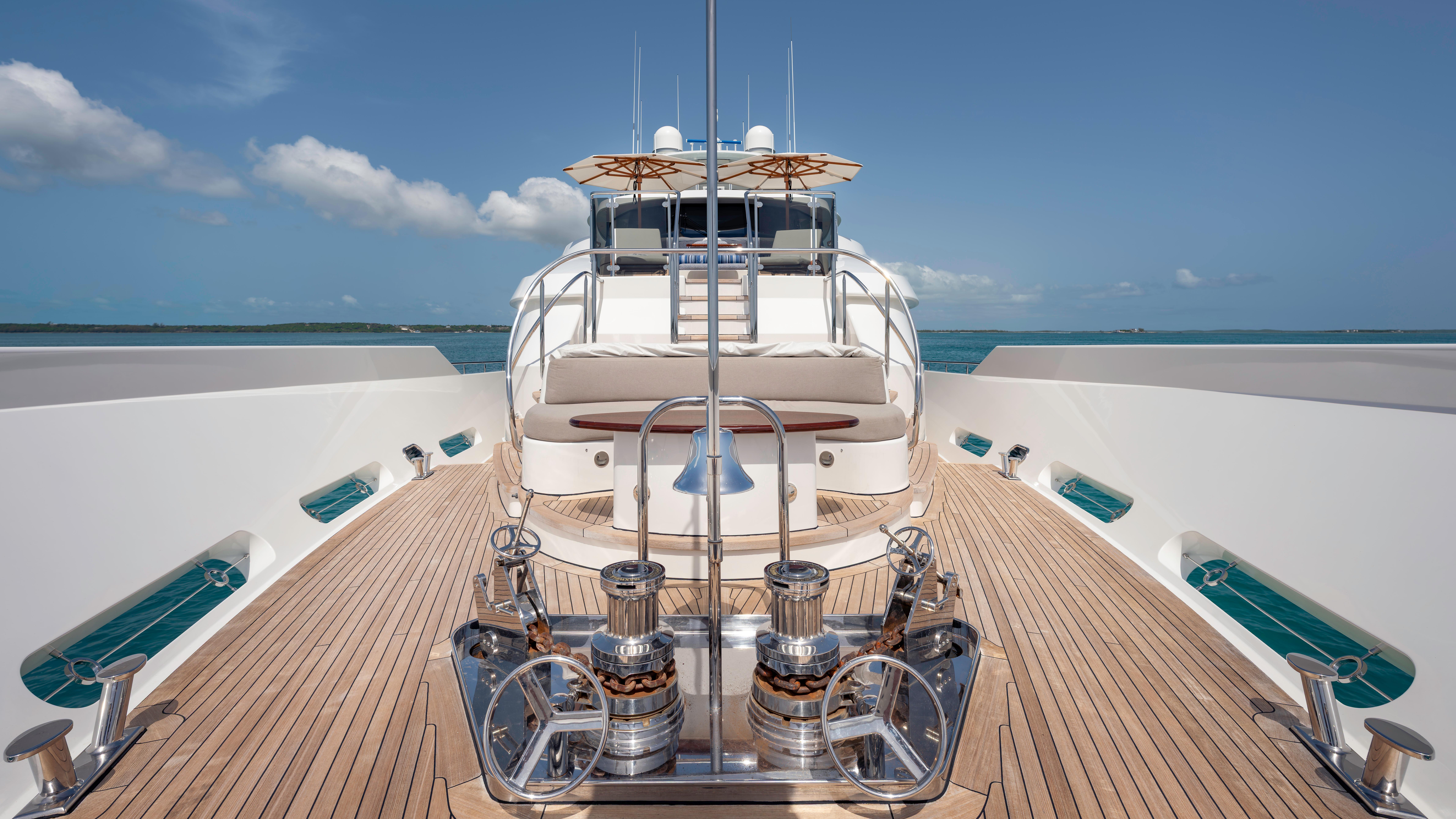 Кормовая часть лодочной палубы доступна через ещё одну пару автоматических стеклянных дверей из скайлаунжа и используется для размещения тендера и водных игрушек. В потолке скрыт большой телевизор с плоским экраном, а по левому борту расположен сервис-бар с грилем BBQ.