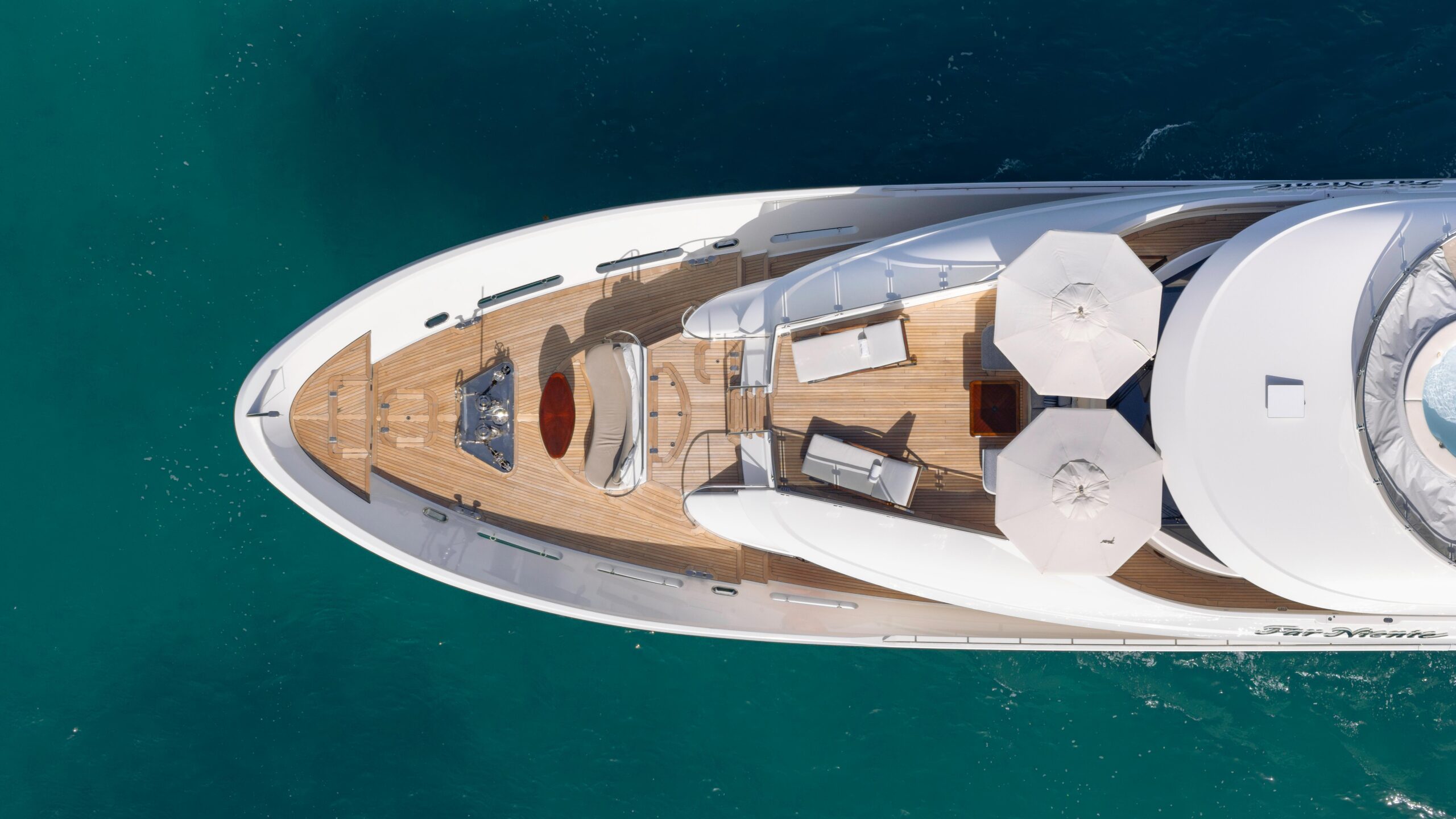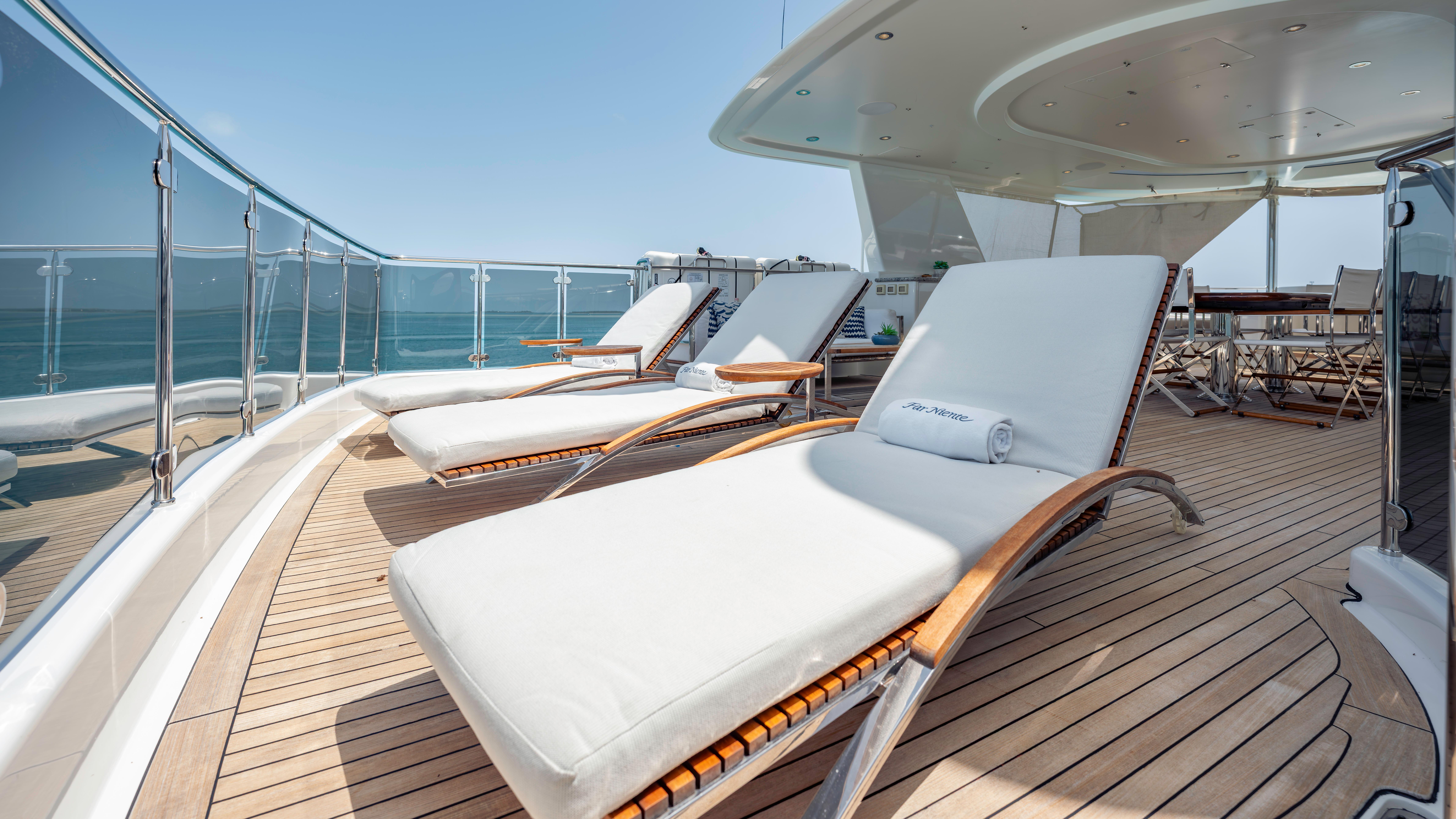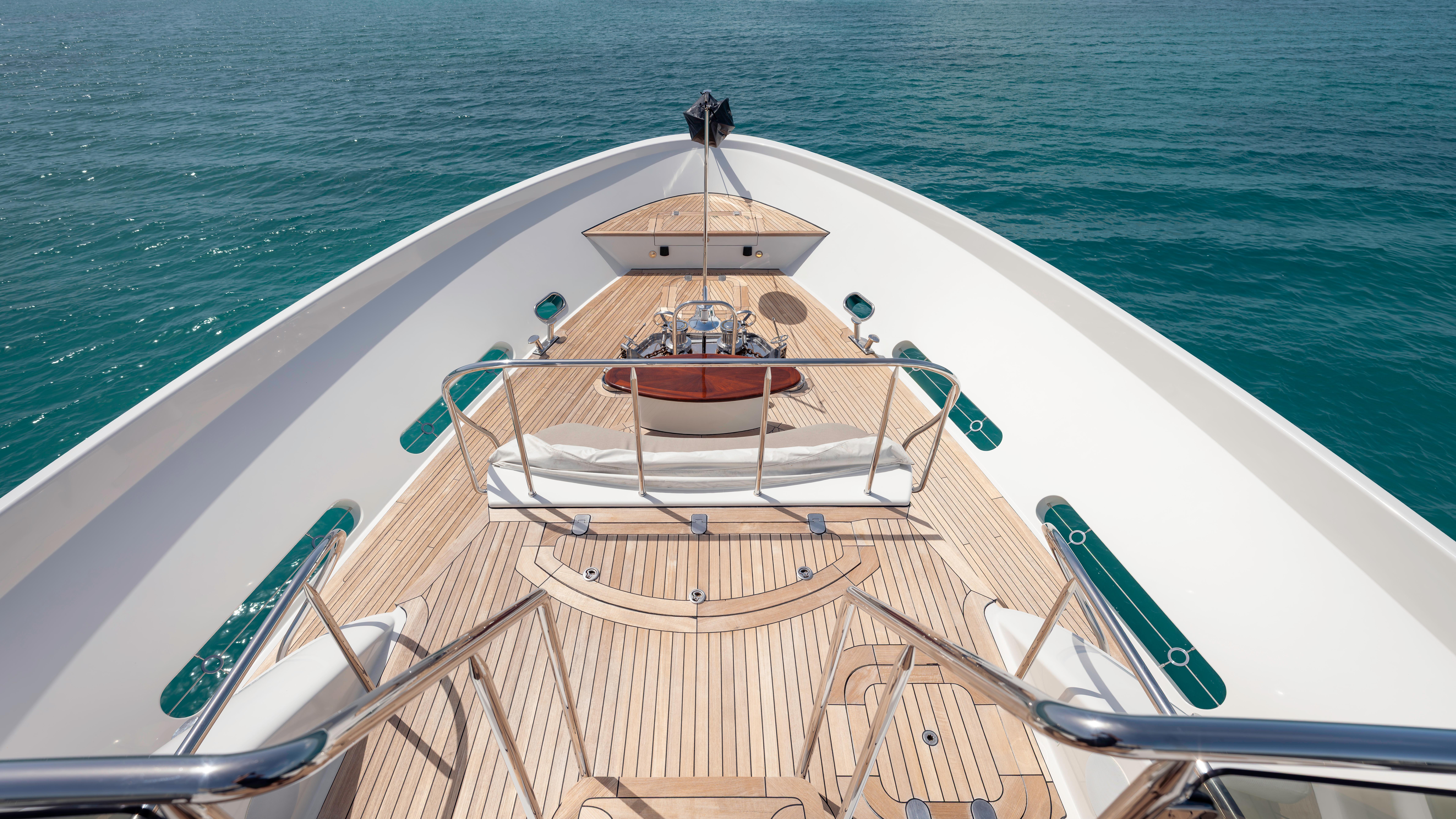 Перед рулевой рубкой находится открытая гостевая терраса с тиковым покрытием, шезлонгами и впечатляющим обзором. Отсюда ведут лестницы на главную палубу и к нижней смотровой зоне с диваном и столом на носу. Эти две приватные зоны на открытом воздухе идеально подходят для чтения, аперитивов перед ужином, а также для наблюдения за рассветами и закатами.