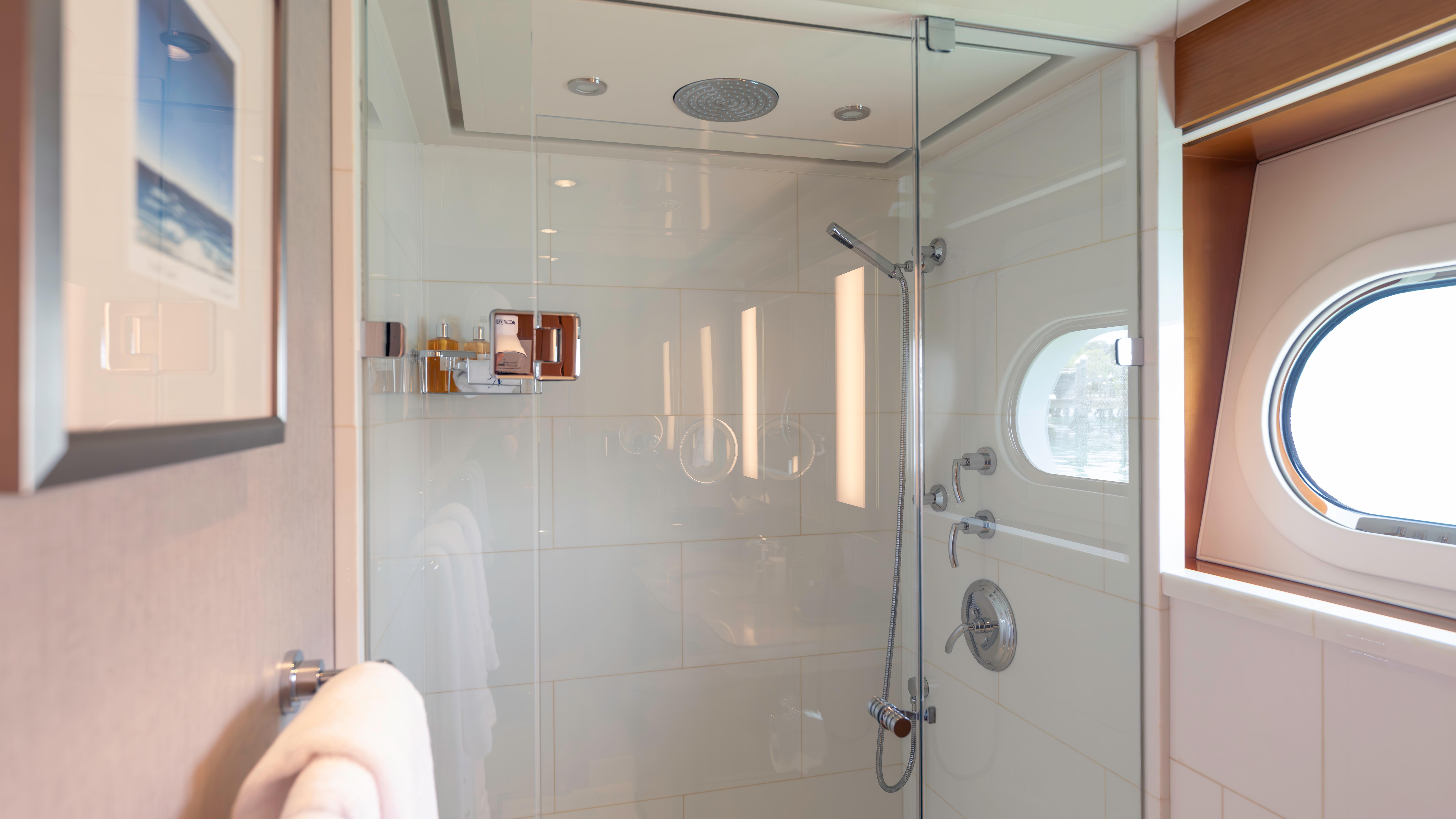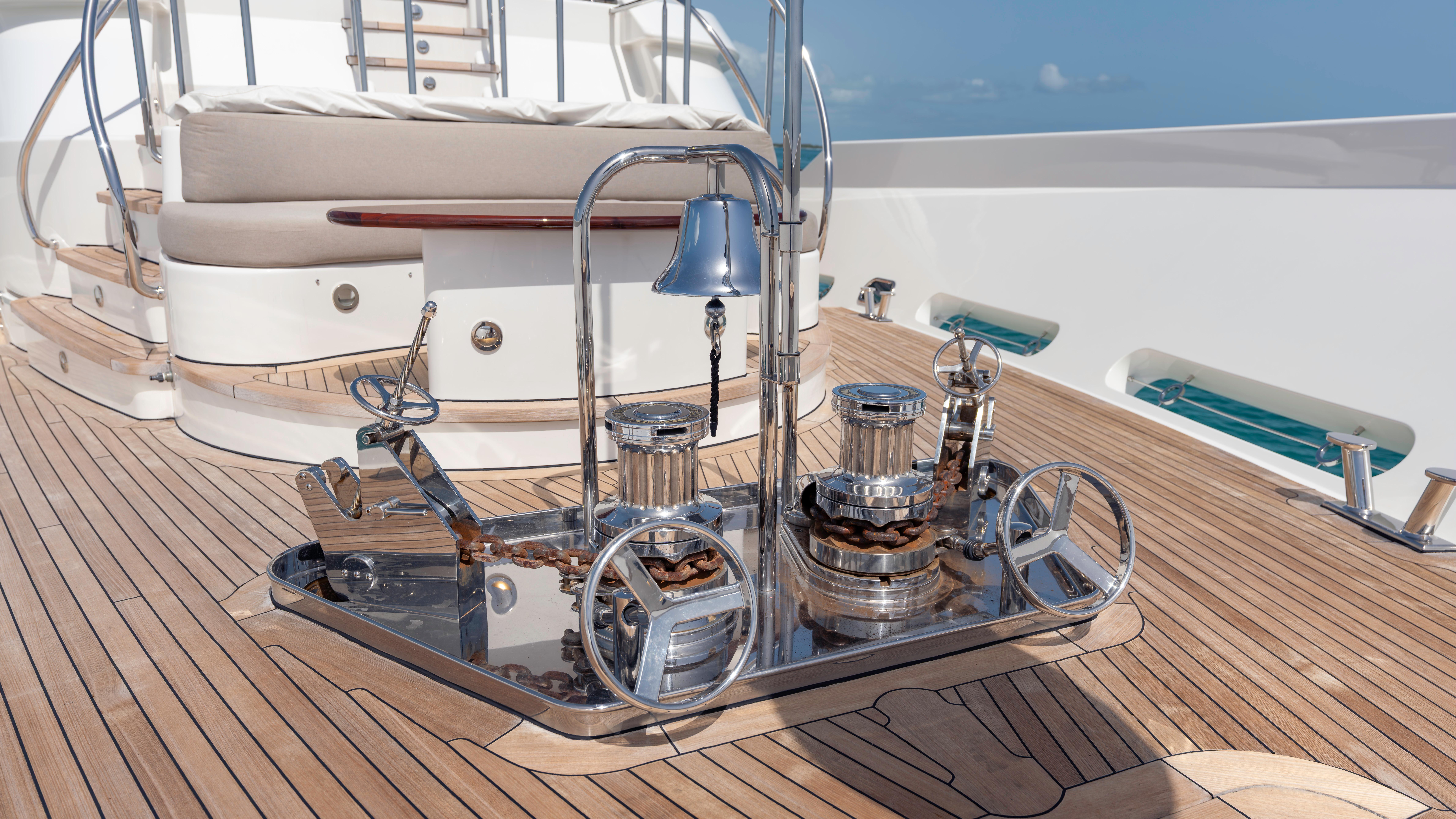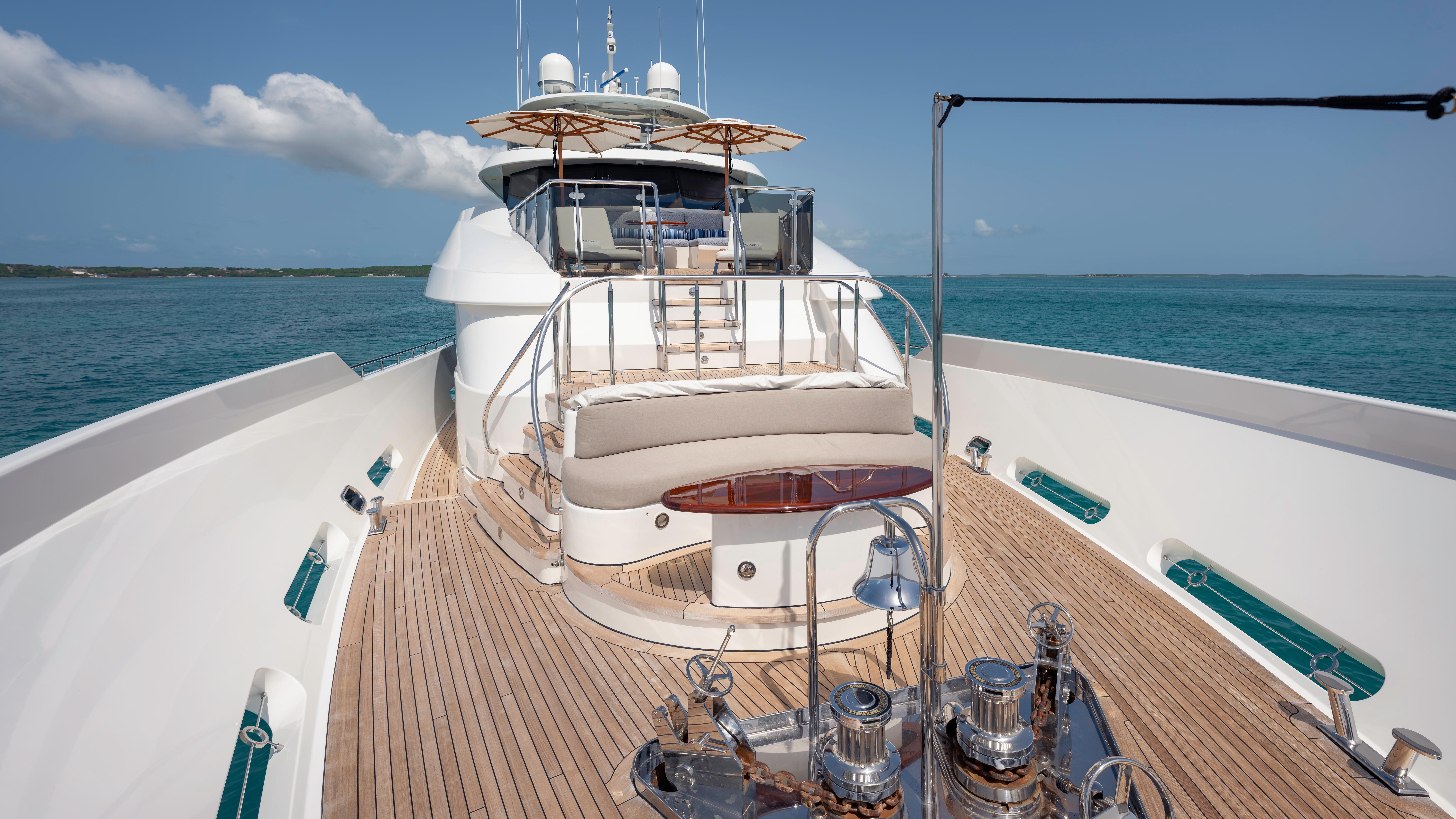 Перед рулевой рубкой находится открытая гостевая терраса с тиковым покрытием, шезлонгами и впечатляющим обзором. Отсюда ведут лестницы на главную палубу и к нижней смотровой зоне с диваном и столом на носу. Эти две приватные зоны на открытом воздухе идеально подходят для чтения, аперитивов перед ужином, а также для наблюдения за рассветами и закатами.