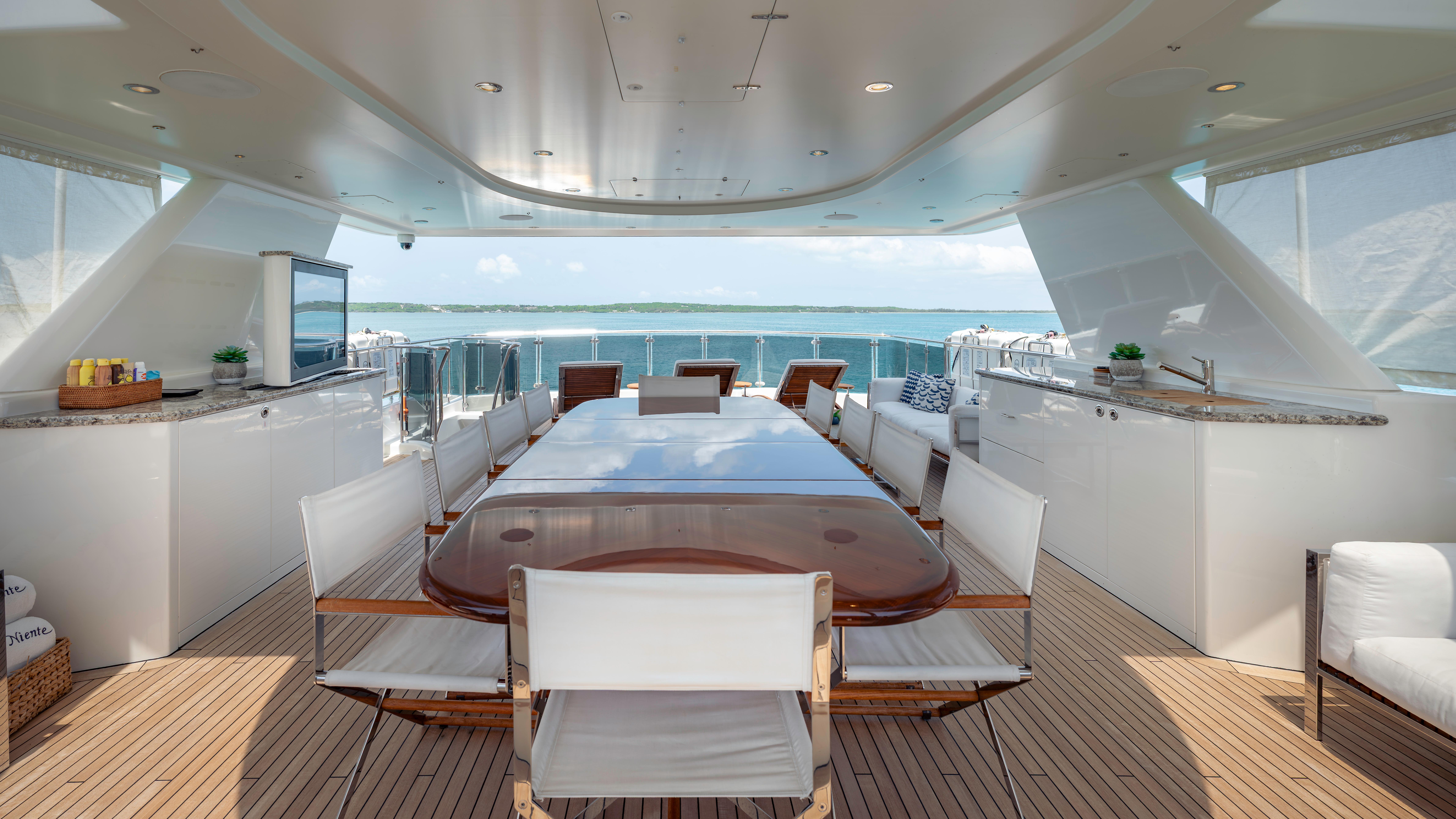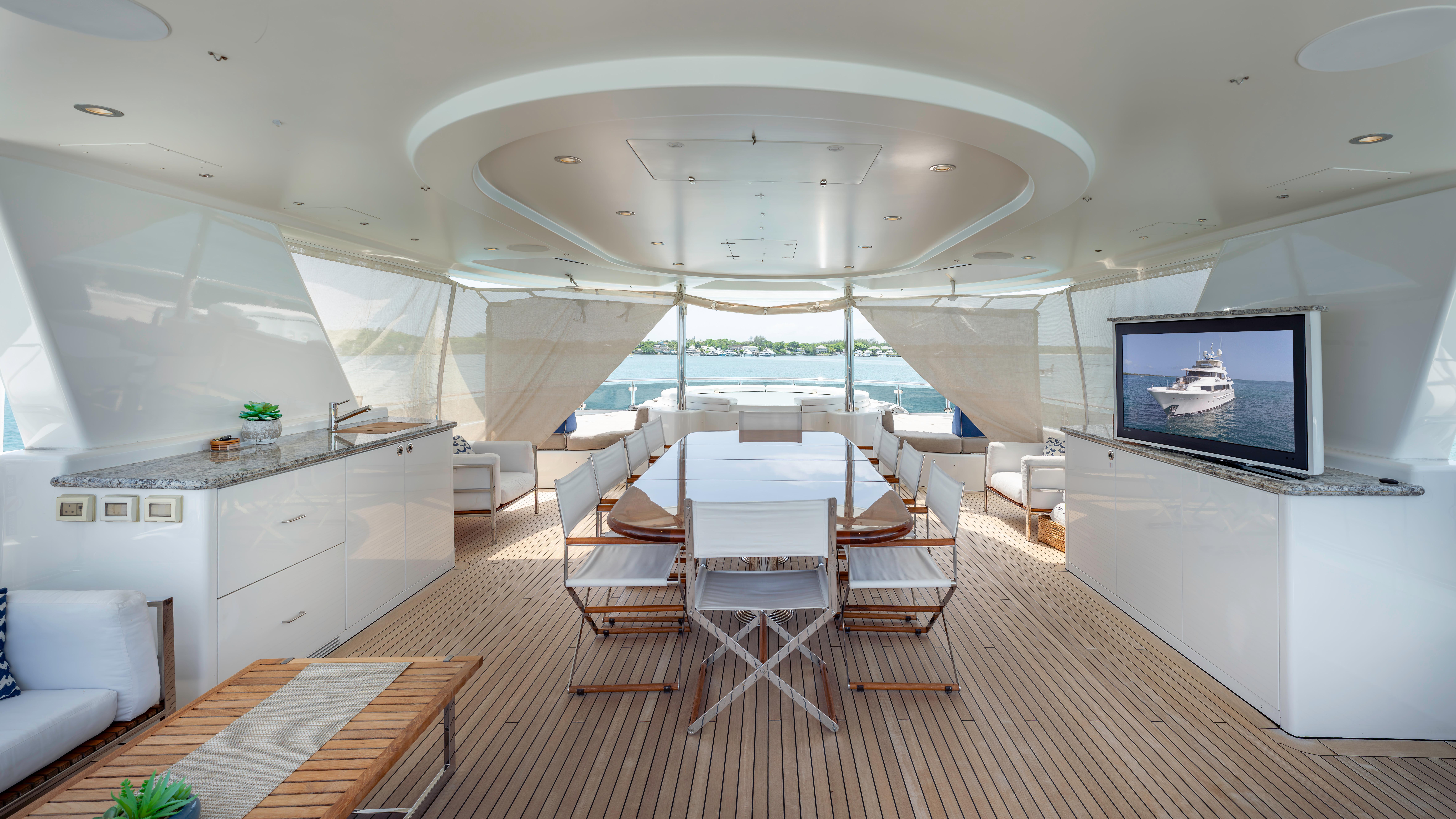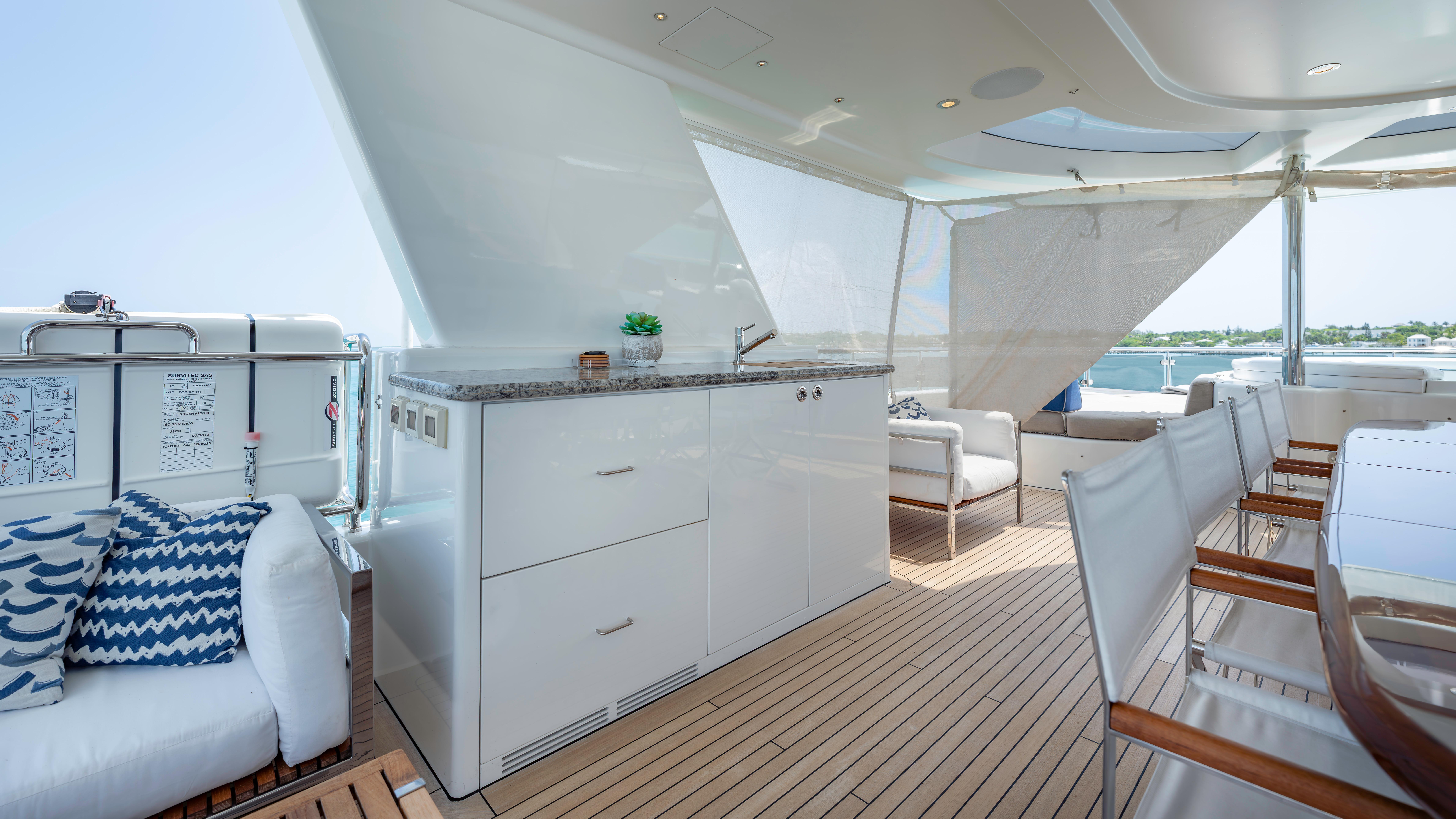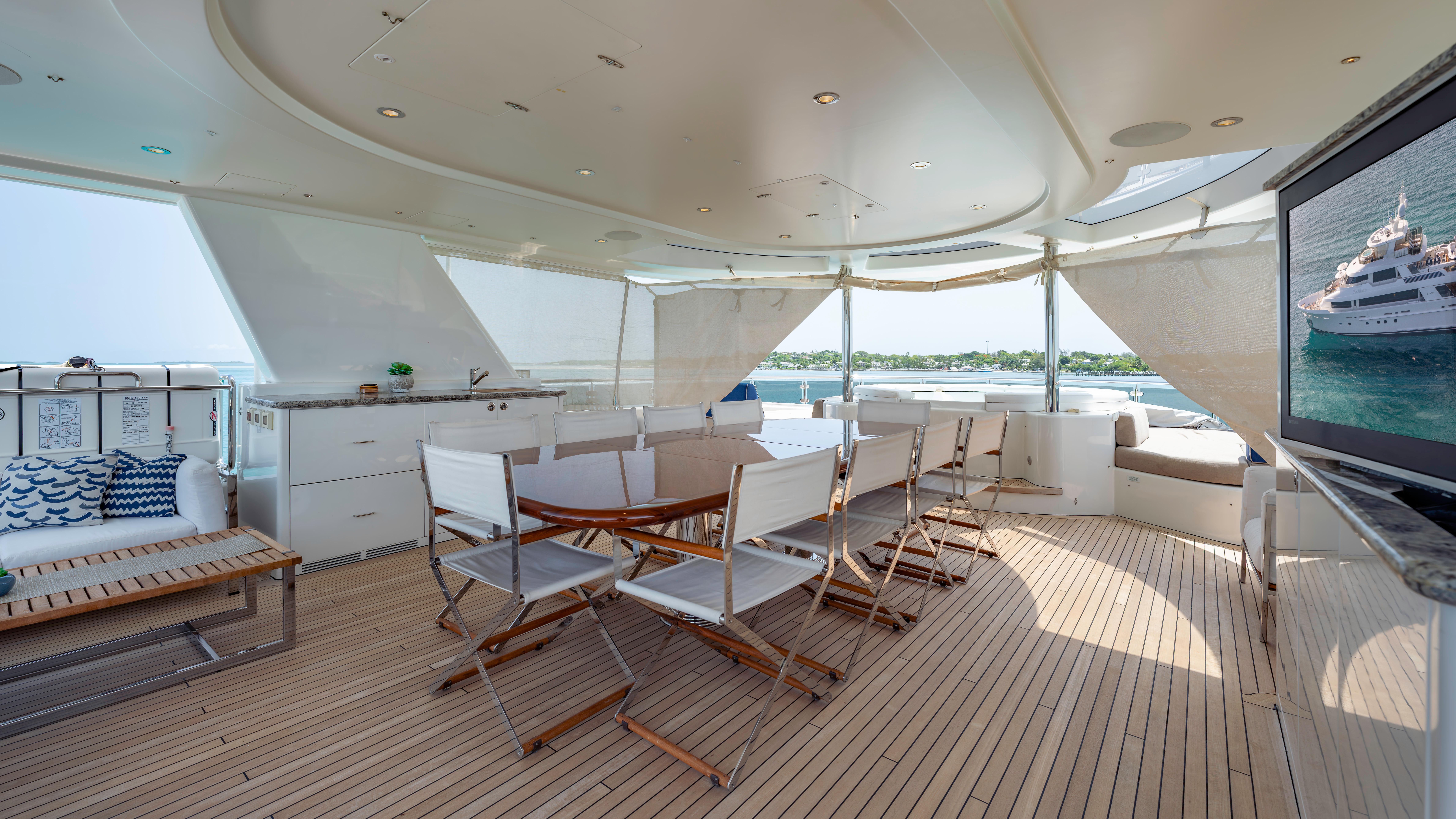 Просторный и открытый флайбридж — одна из главных достопримечательностей яхты. В носовой части расположено джакузи на 6–8 человек с великолепными видами и зоной для загара. В центре флайбриджа — крытая обеденная зона на 10 гостей с выдвижным телевизором, встроенным в боковые шкафы. Гриль и мокрый бар делают пространство максимально универсальным. Кормовая часть флайбриджа включает открытую зону с тремя удобными шезлонгами, которые можно затенить переносными зонтами, а потолочные распылители воды обеспечивают комфортное охлаждение в жаркую погоду.