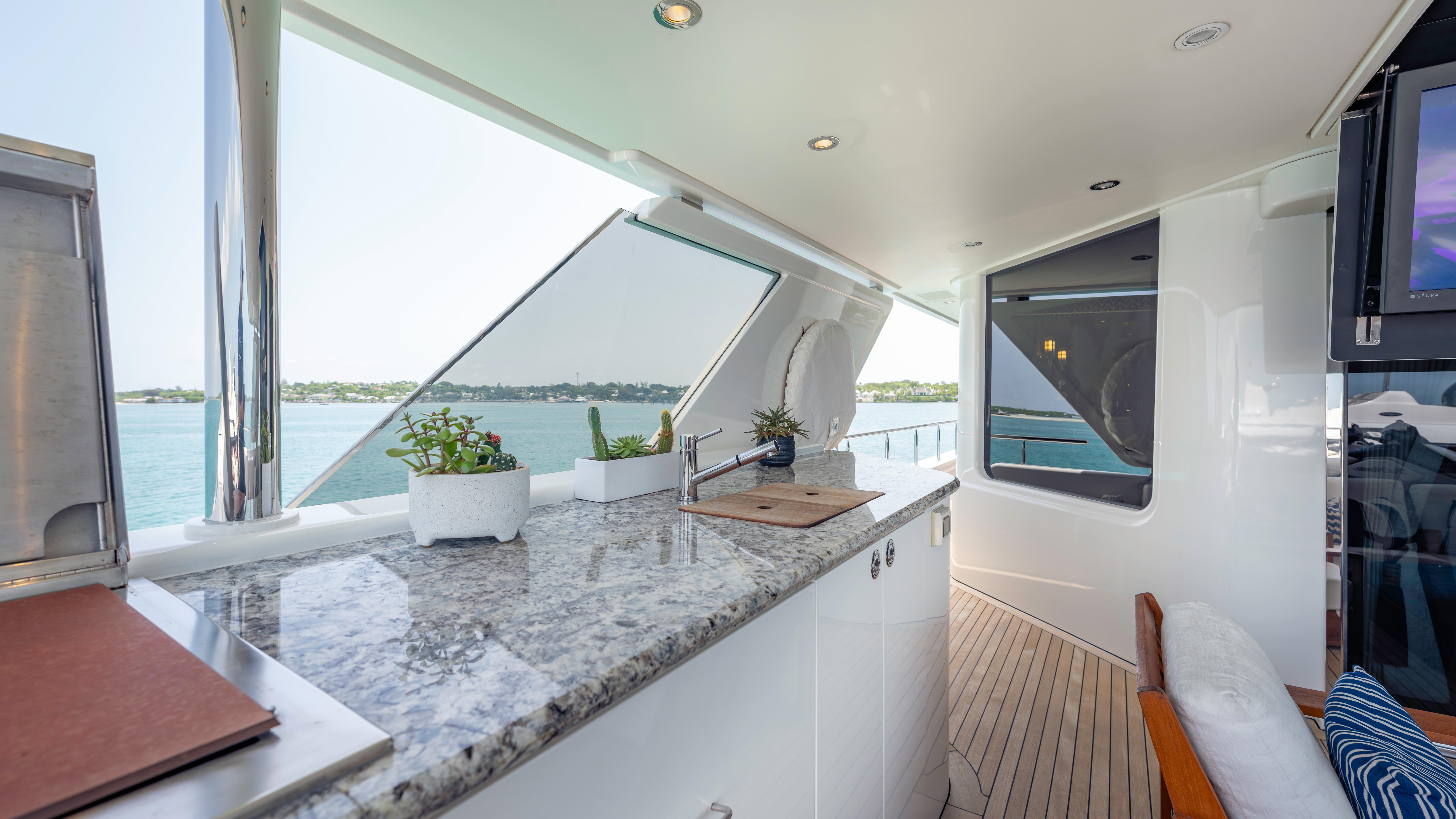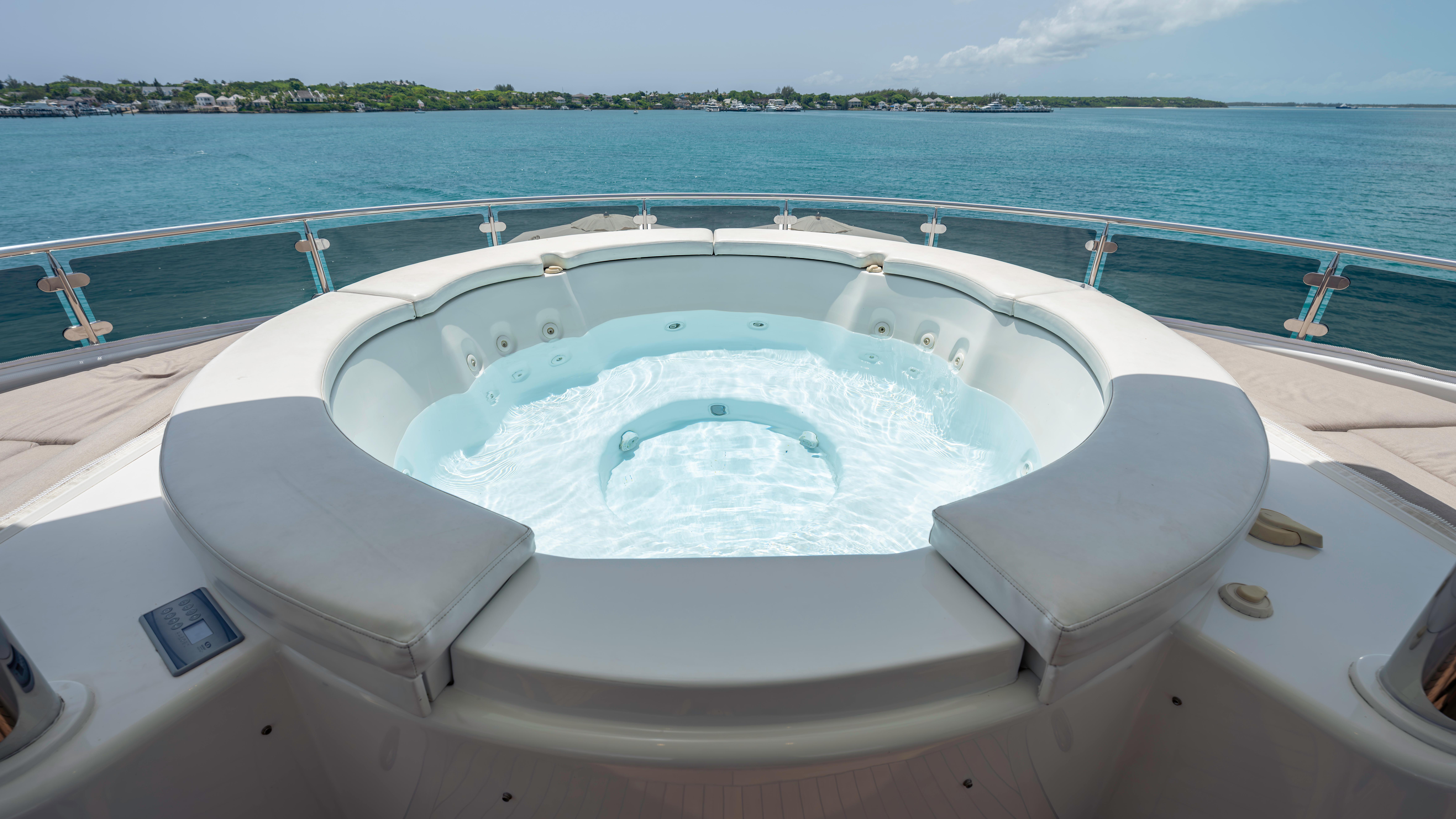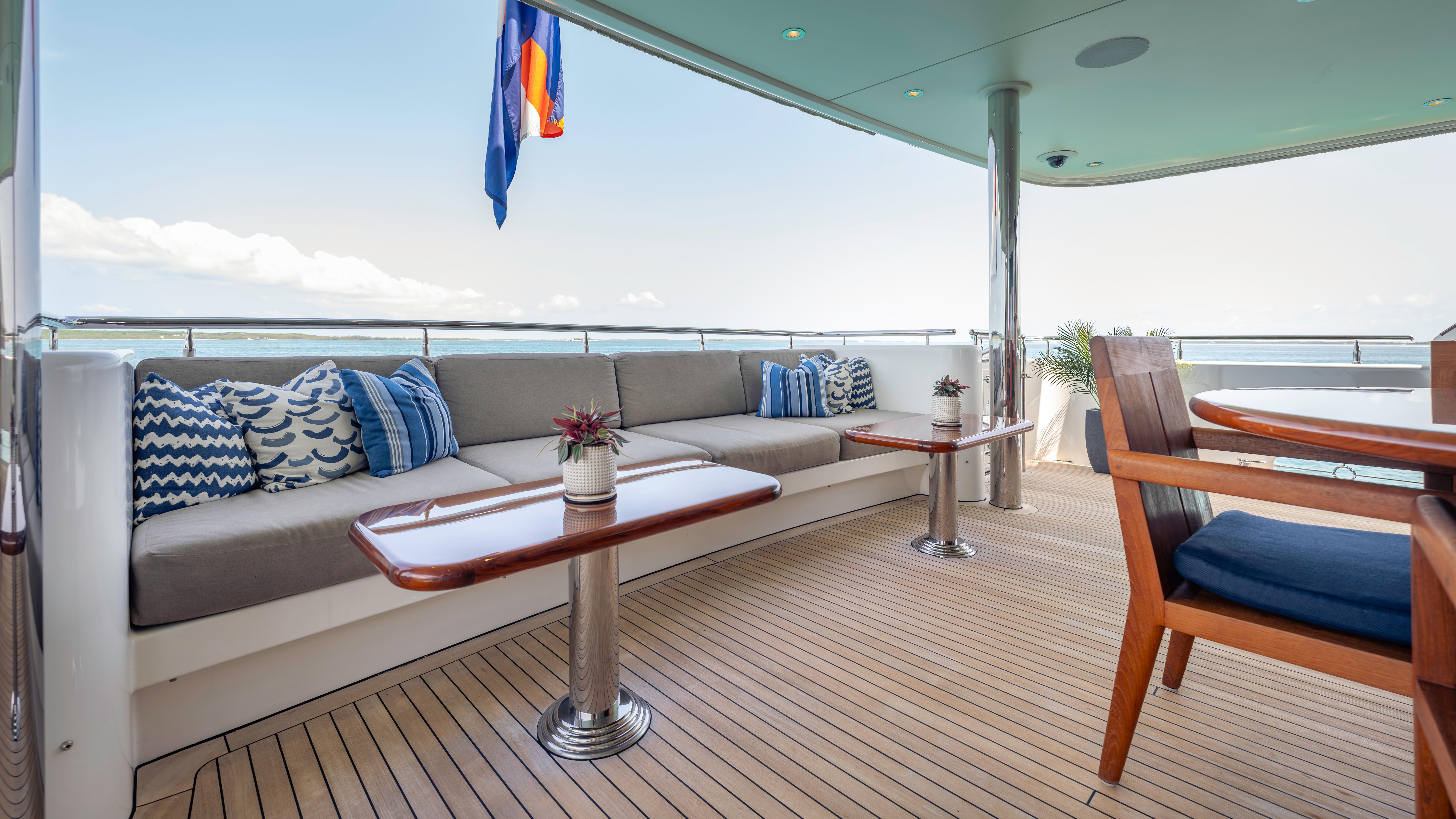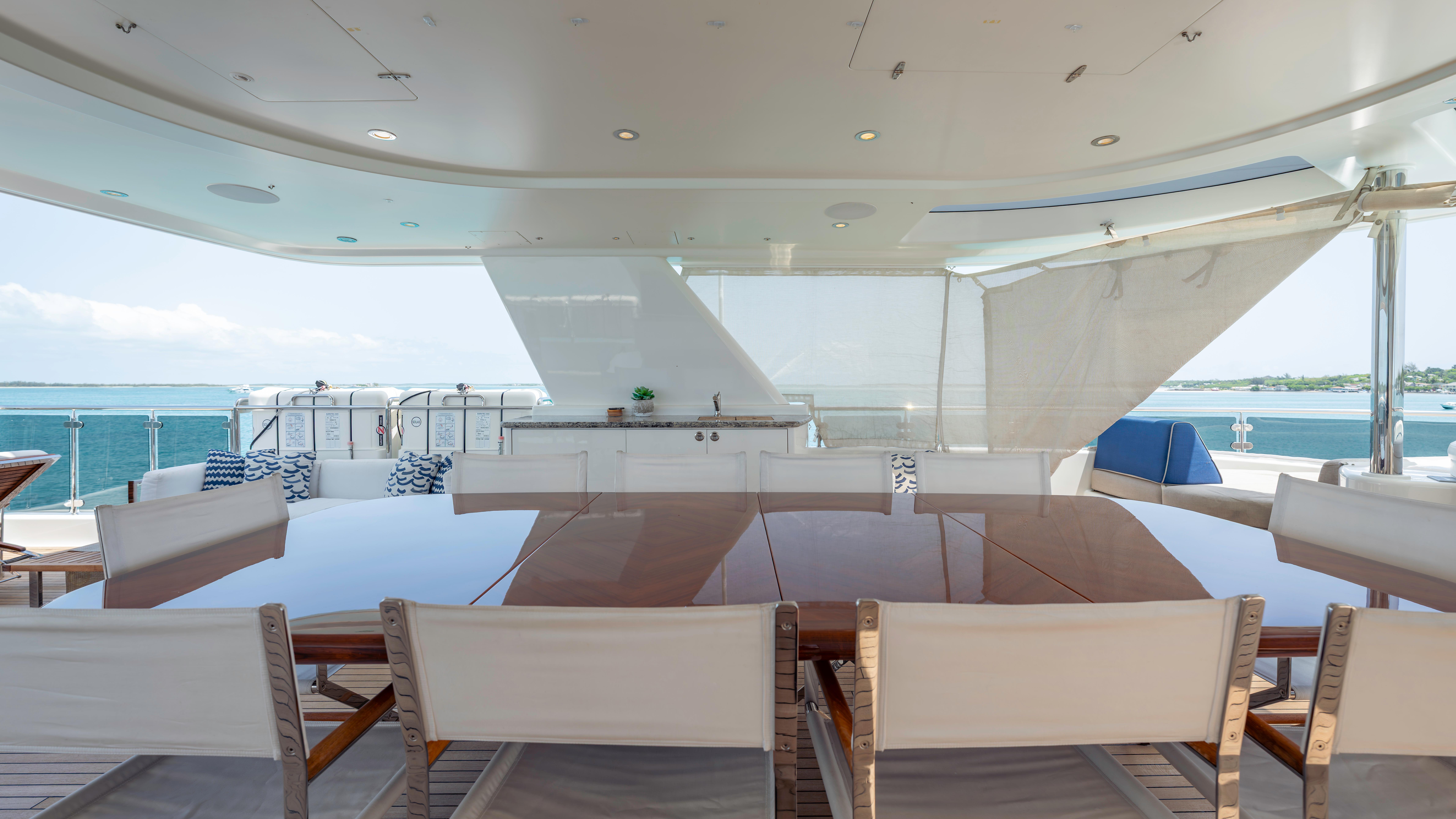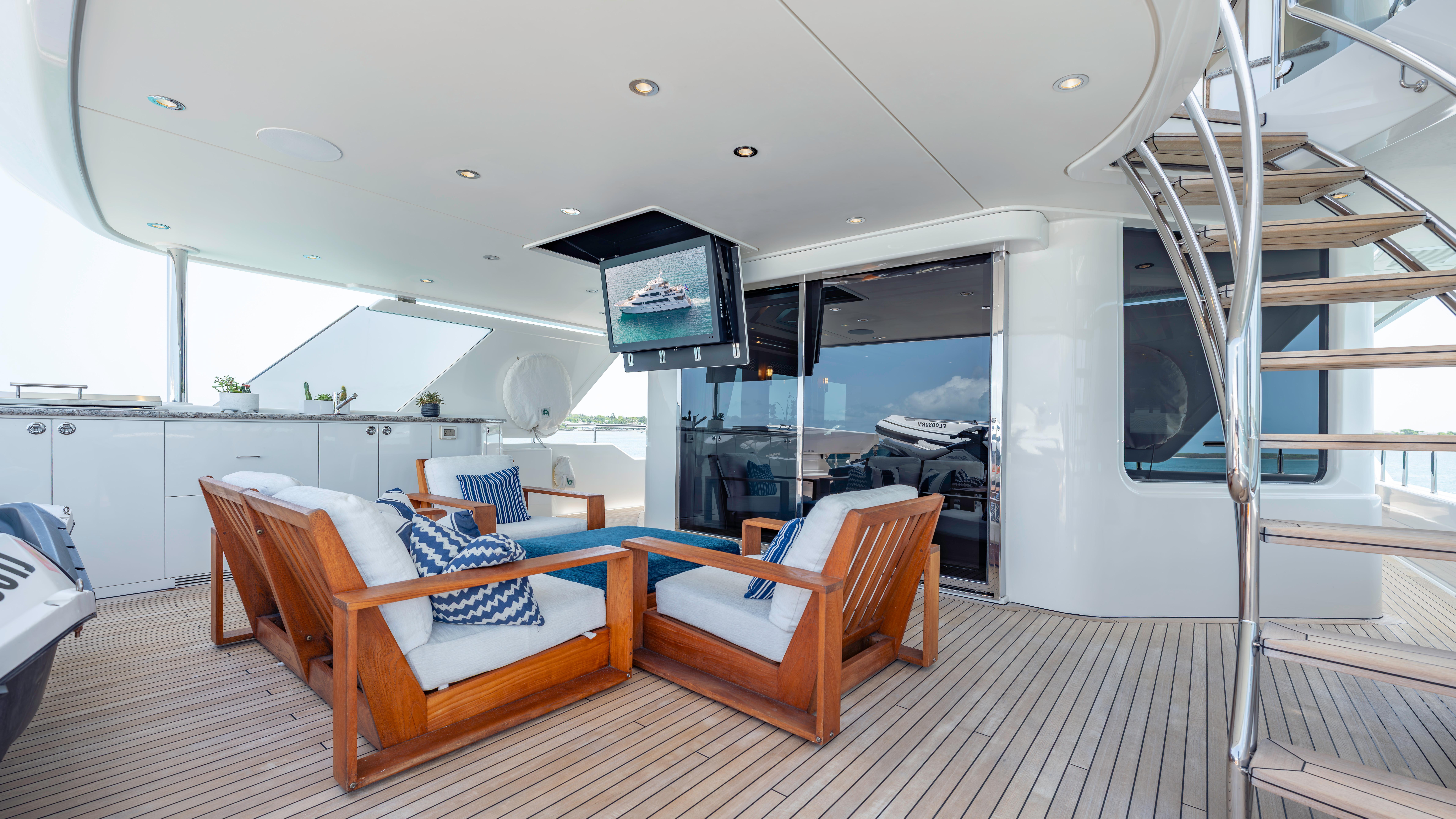 Просторный и открытый флайбридж — одна из главных достопримечательностей яхты. В носовой части расположено джакузи на 6–8 человек с великолепными видами и зоной для загара. В центре флайбриджа — крытая обеденная зона на 10 гостей с выдвижным телевизором, встроенным в боковые шкафы. Гриль и мокрый бар делают пространство максимально универсальным. Кормовая часть флайбриджа включает открытую зону с тремя удобными шезлонгами, которые можно затенить переносными зонтами, а потолочные распылители воды обеспечивают комфортное охлаждение в жаркую погоду.