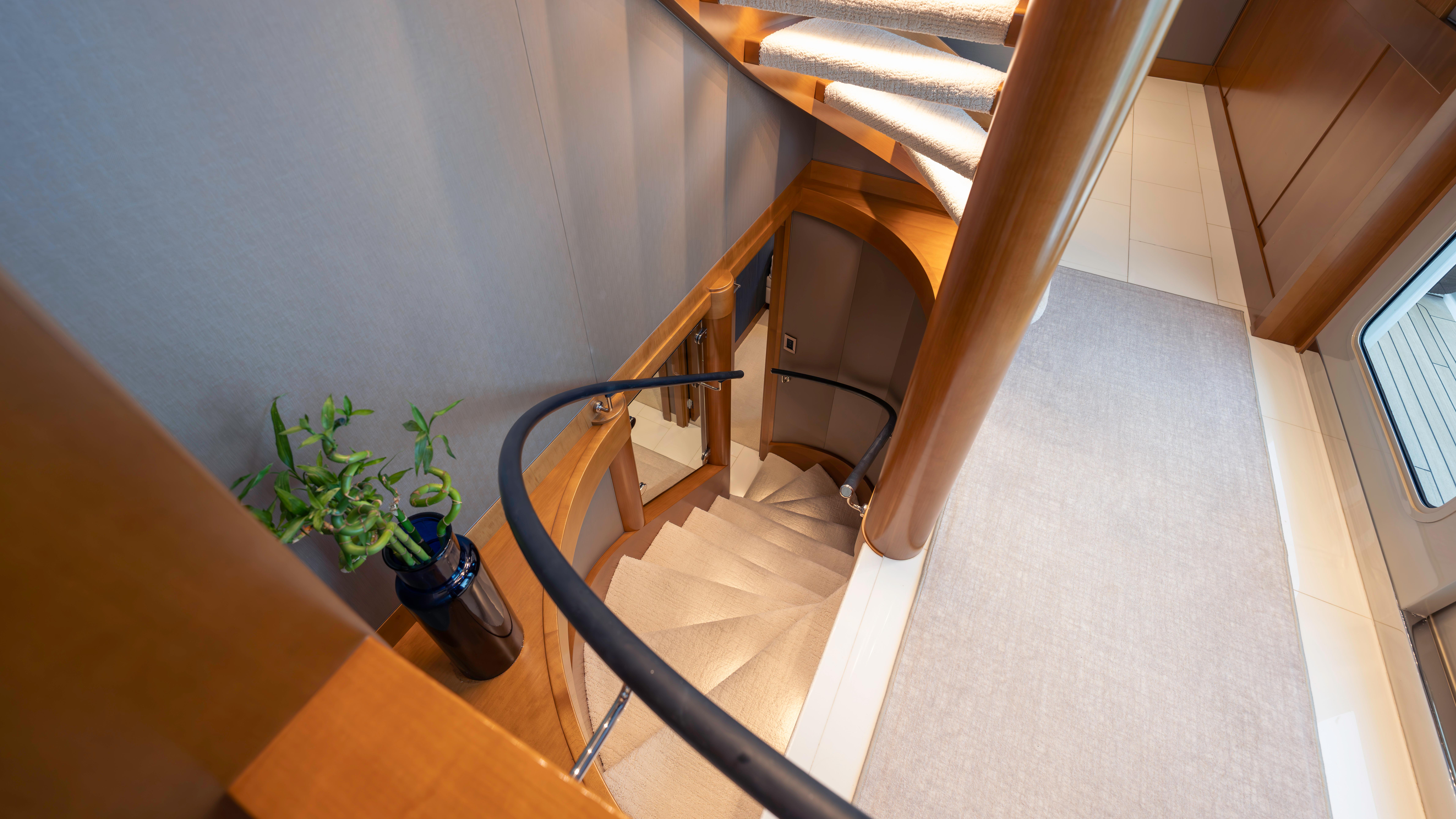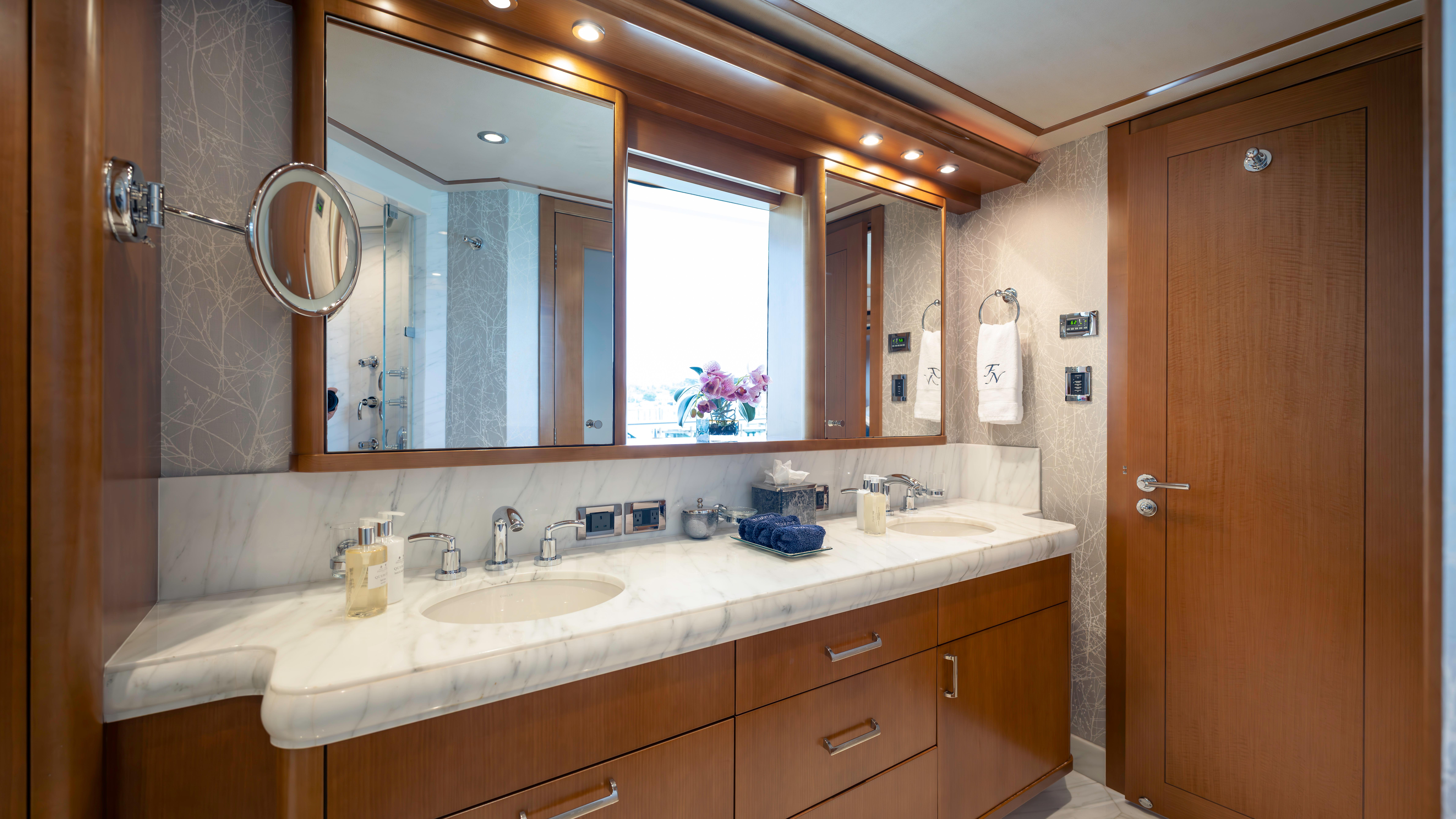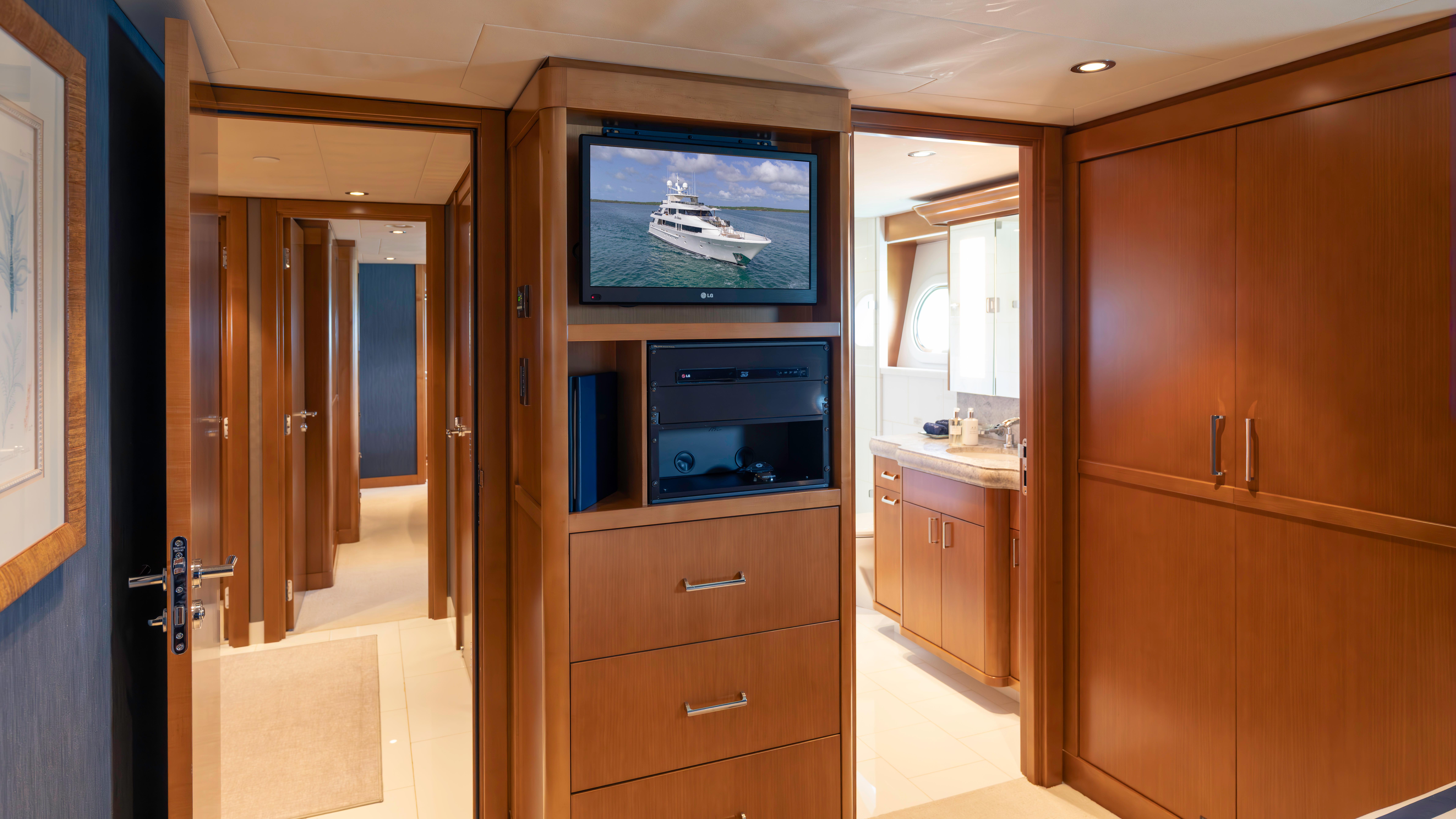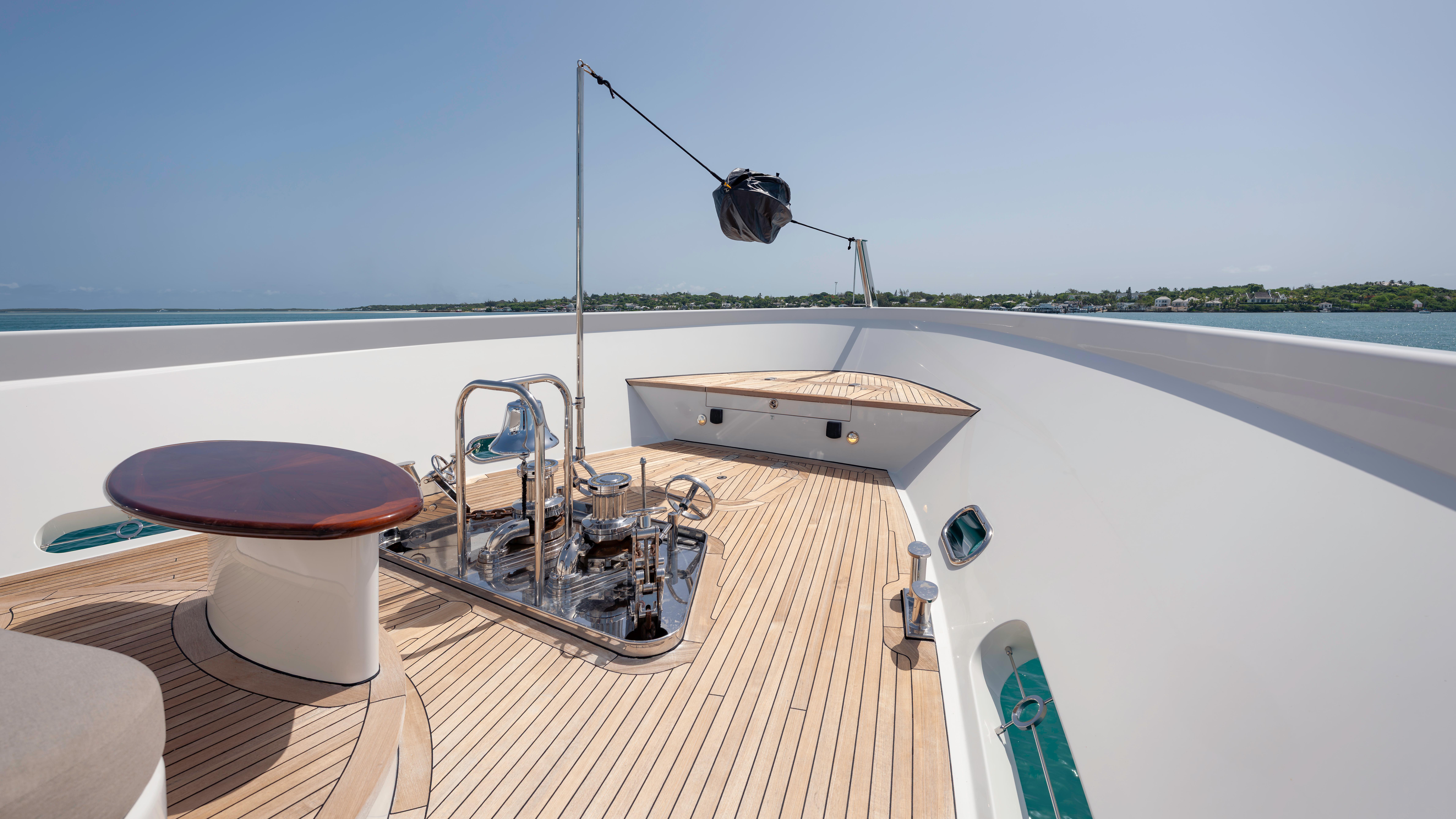 Просторный и открытый флайбридж — одна из главных достопримечательностей яхты. В носовой части расположено джакузи на 6–8 человек с великолепными видами и зоной для загара. В центре флайбриджа — крытая обеденная зона на 10 гостей с выдвижным телевизором, встроенным в боковые шкафы. Гриль и мокрый бар делают пространство максимально универсальным. Кормовая часть флайбриджа включает открытую зону с тремя удобными шезлонгами, которые можно затенить переносными зонтами, а потолочные распылители воды обеспечивают комфортное охлаждение в жаркую погоду.